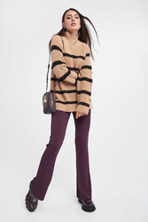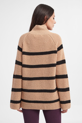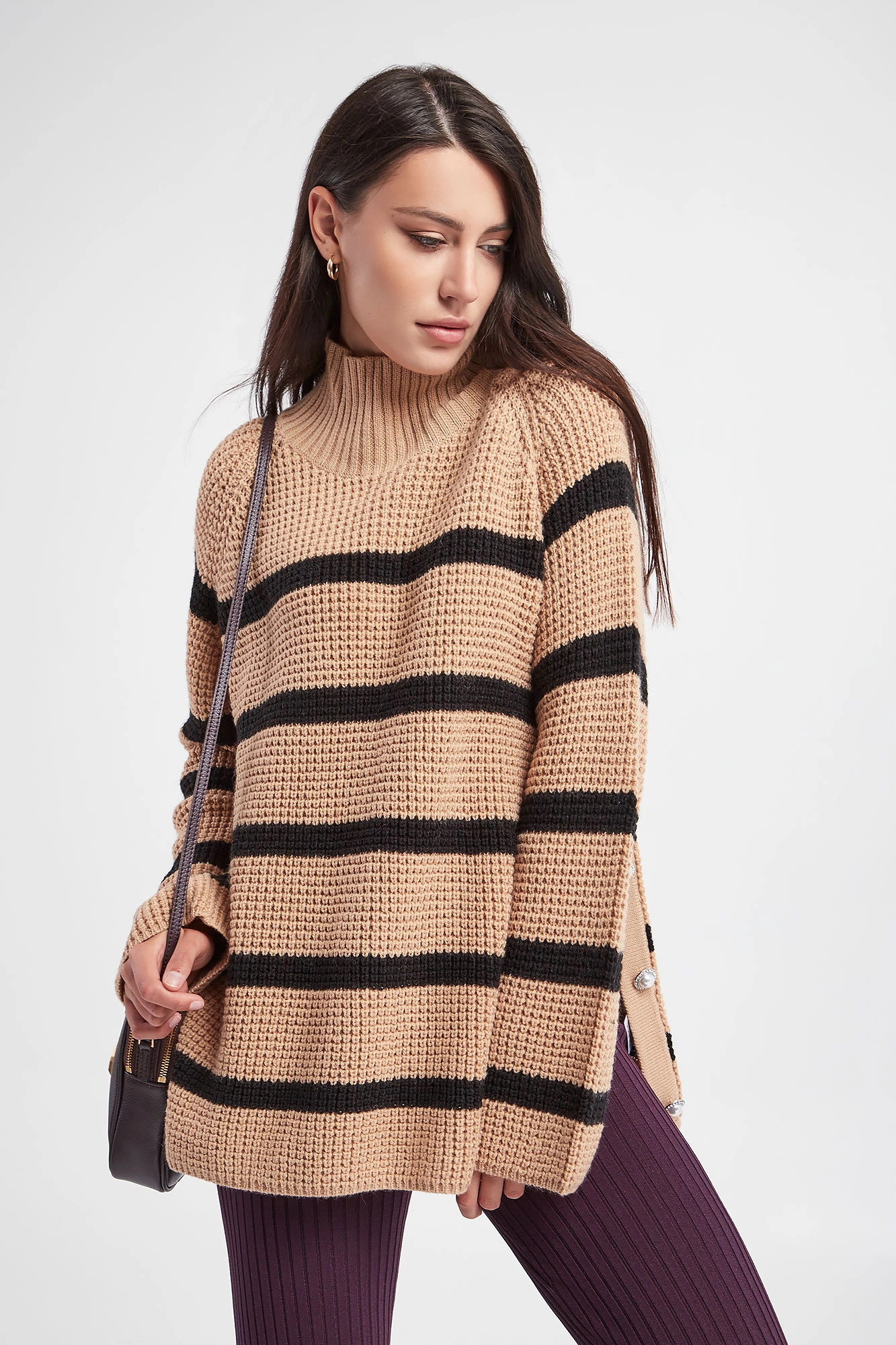 Sweter marki Custommade w kolorze beżowym. Lekko oversizowy fason. Na całości czarne paski. Po boku ozdobne rozcięcie zapinane na biżuteryjne guziki. Długie rękawy, dekolt z półgolfem i dół zakończone elastycznym ściągaczem.