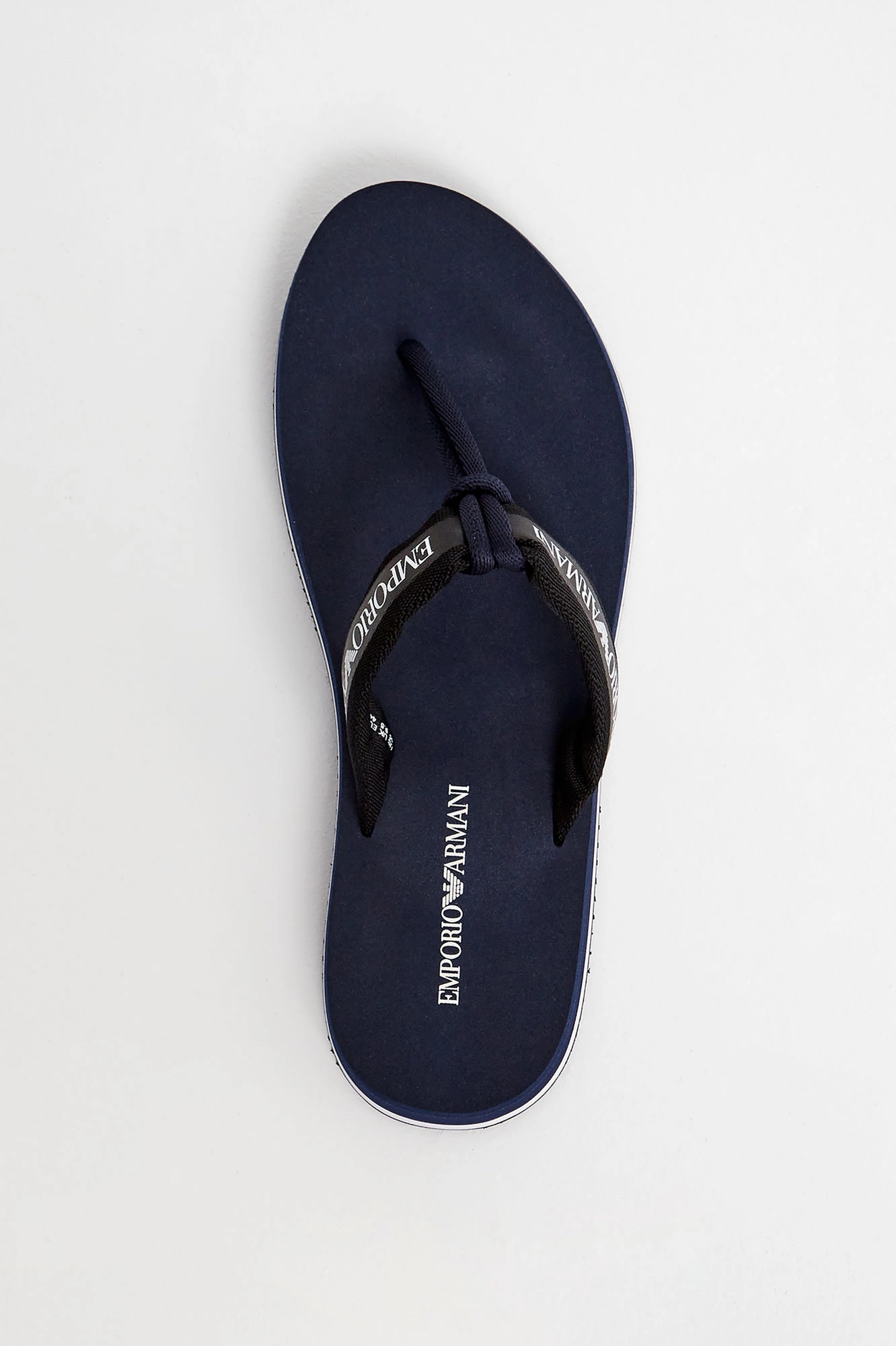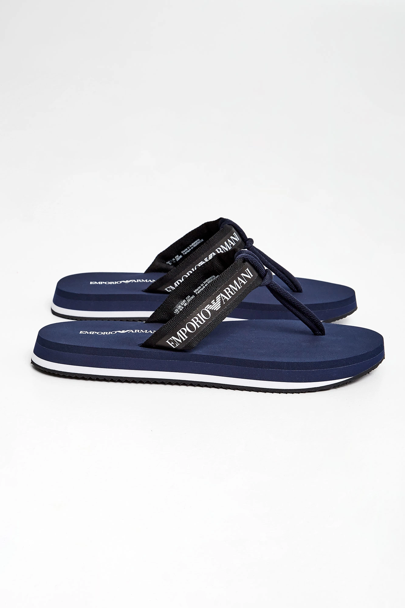 Japonki marki Emporio Armani Swimwear w granatowym kolorze. Paski w czarnym kolorze z nadrukiem nazwy marki. Podeszwa tłoczona. Sygnowana wyściółka. Wykonane z lekkiego tworzywa.