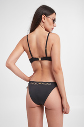 Dół od bikini w czarnym kolorze. Krój typu figi. Z tyłu złoty, połyskujący nadruk z logo. Wiązane po bokach. Elastyczny i komfortowy.