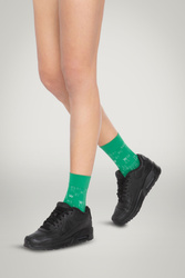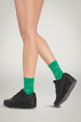 Skarpetki podtrzymujące marki Wolford w zielonym kolorze. Grubość 80 den. Na całości motyw matrix. Wykończone elastycznym ściągaczem.