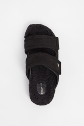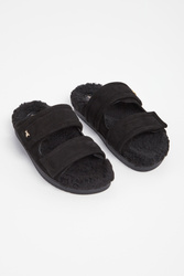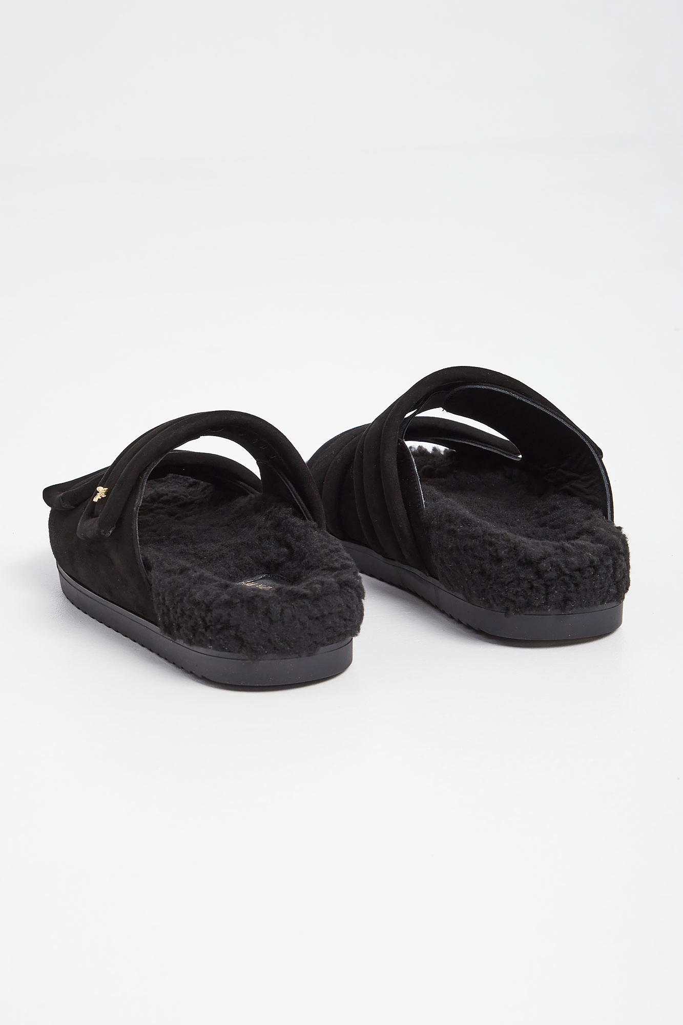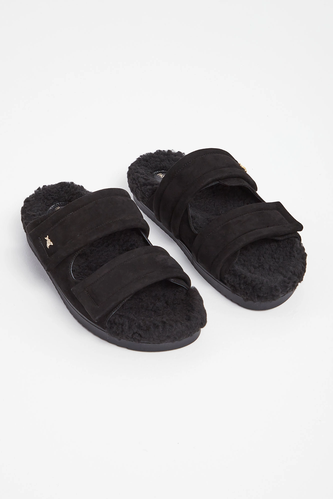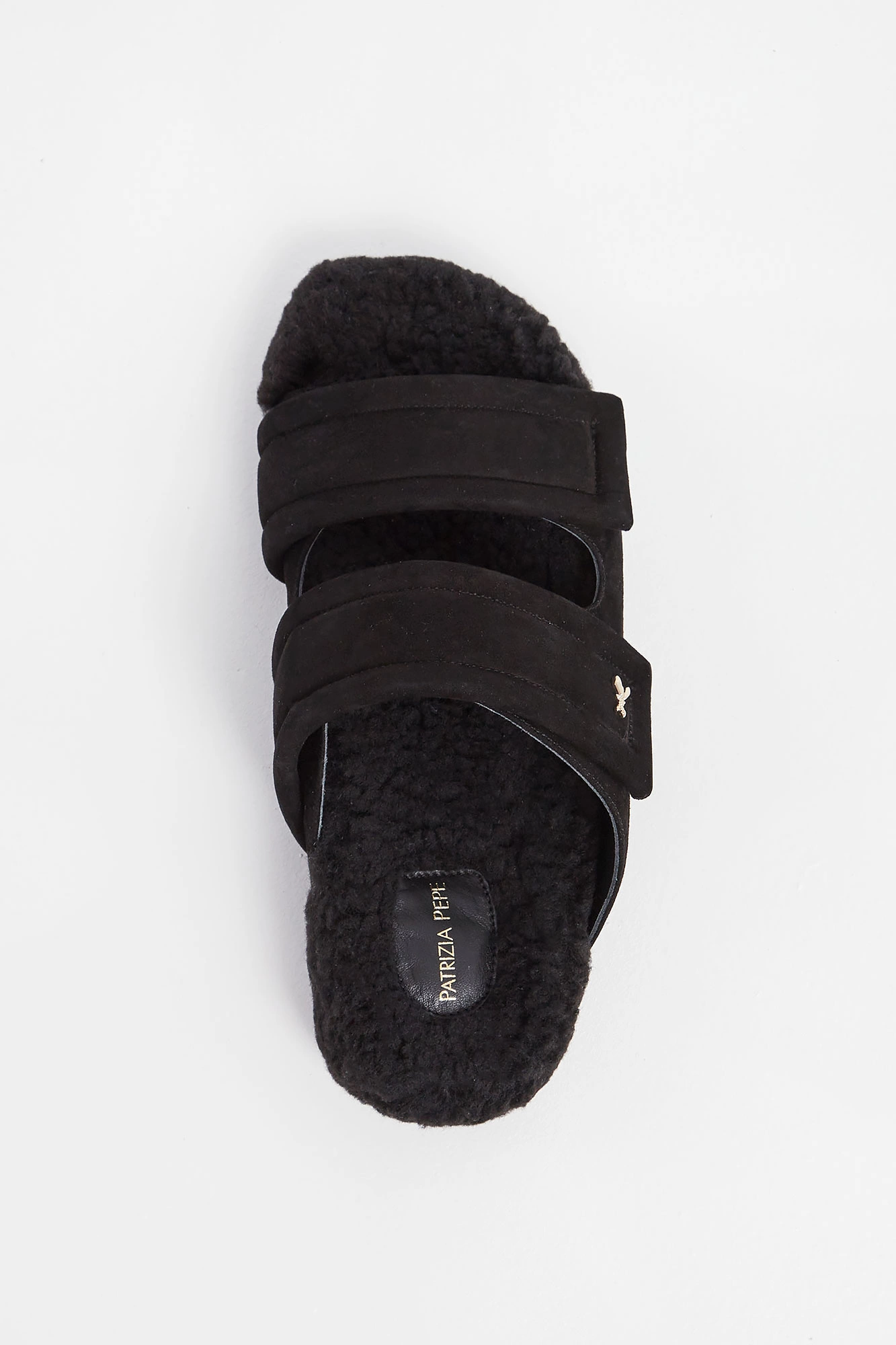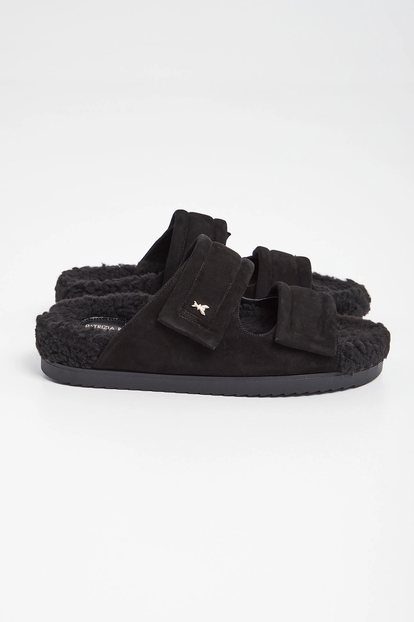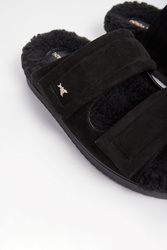 Klapki marki Patrizia Pepe w kolorze czarnym. Z przodu dwa szerokie pasy z aplikacją w kształcie logo marki w złotym kolorze. Podeszwa wykończona futerkiem. Dobrze wyprofilowane i lekkie. Doskonałe do wielu letnich stylizacji.