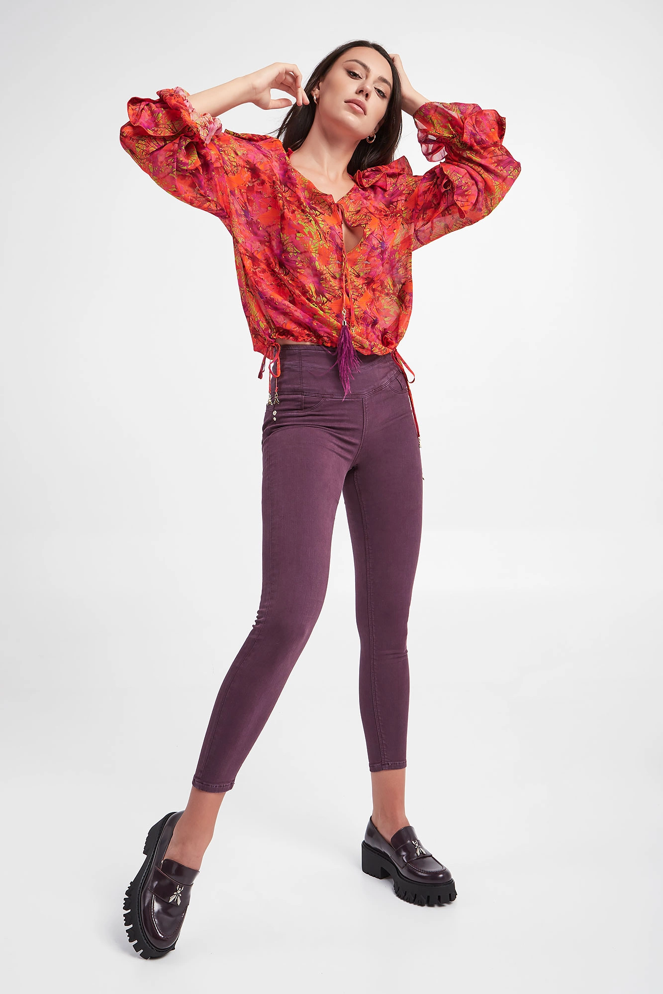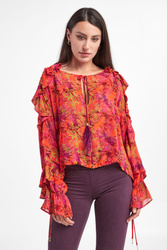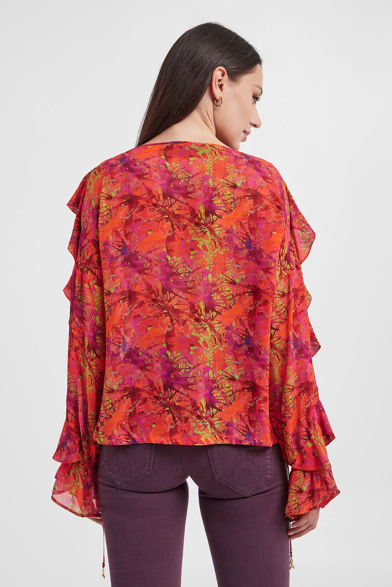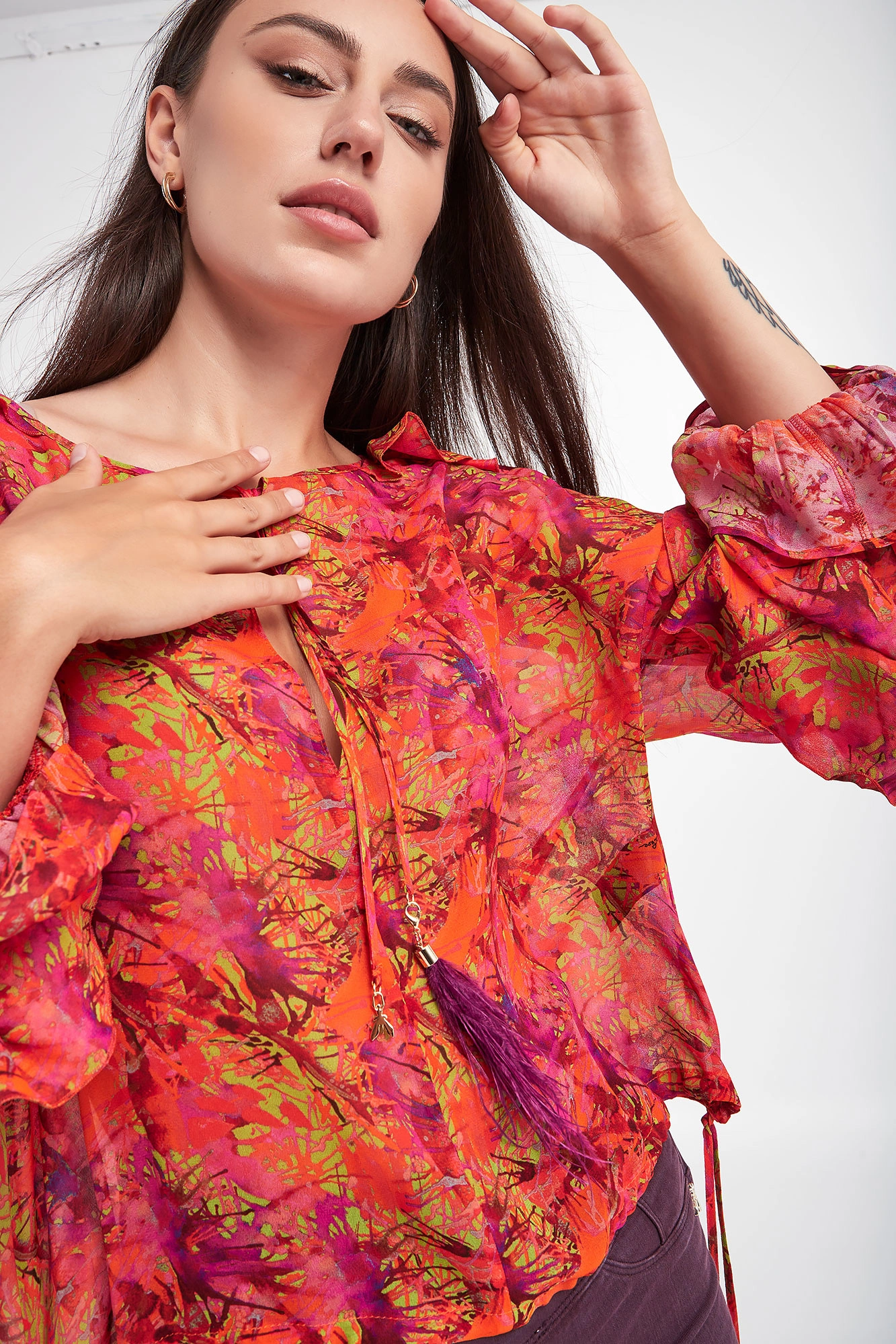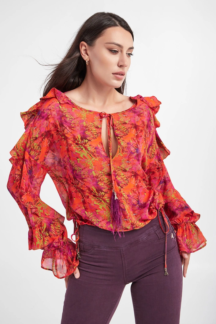Bluzka marki Patrizia Pepe. Fason lekko oversizowy. Dekolt typu o-neck z wycięciem wiązanym za pomocą troczków. Na całości wielokolorowy, nieregularny wzór. Delikatnie bufiaste rękawy wykończone falbankami. U dołu wszyte troczki umożliwiające regulację. Bluzka wykonana z wiskozowej, półtransparentnej tkaniny.