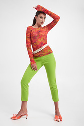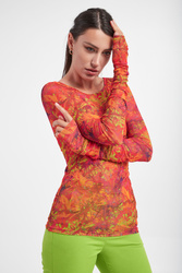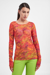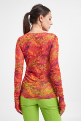 Bluzka marki Patrizia Pepe. Fason typu slim. Na całości wielokolorowy, nieregularny wzór. Na wewnętrznej stronie rękawów i na lewym boku marszczenie, które ciekawie modeluje sylwetkę. Rękawy długie, lekko nachodzące na dłonie. Z tyłu, na linii karku złota aplikacja w postaci owadziego logo marki. Bluzka wykonana z lekkiej, półtransparentnej tkaniny.