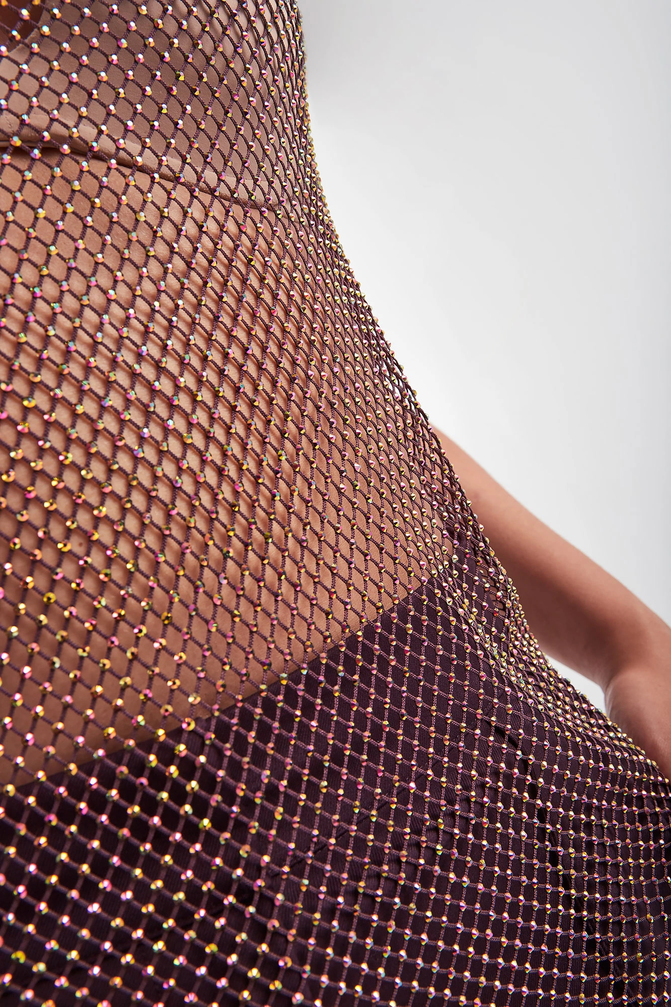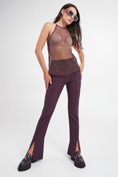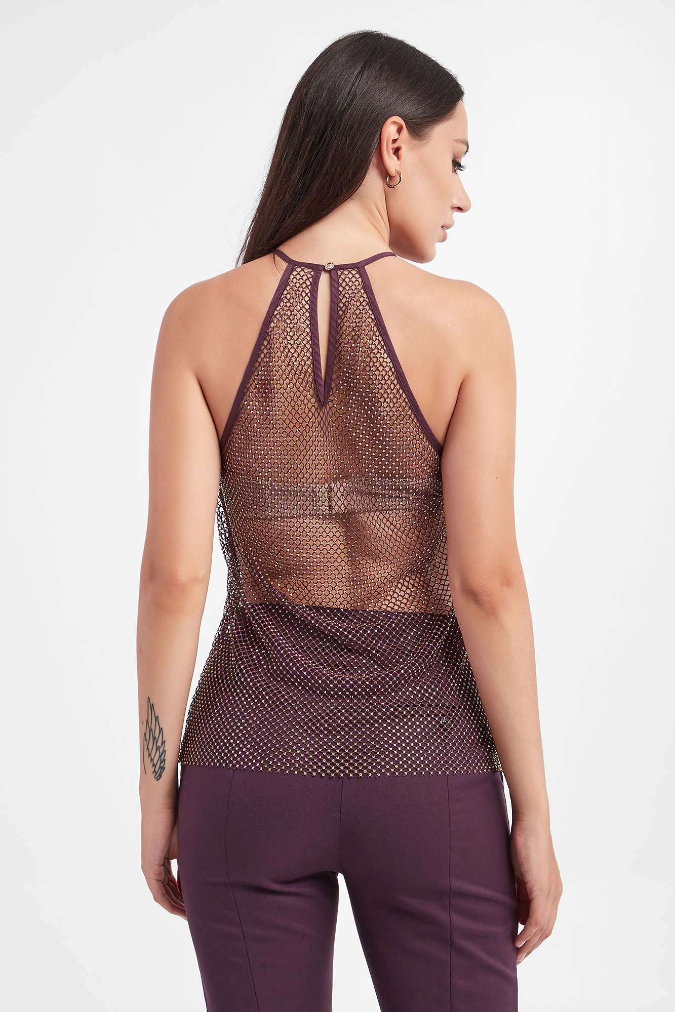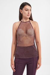 Top marki Patrizia Pepe w kolorze bakłażanowym. Fason typu regular fit. Dekolt typu o-neck, zapinany na guzik na karku. Wykonany z siatkowanego materiału. Na całości ozdobne, mieniące się kryształki.