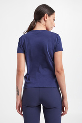 T-shirt marki Elisabetta Franchi w kolorze granatowym. Fason typu slim fit. Na przodzie geometryczna aplikacja w kolorze złotym ze zwisającymi łańcuszkami i kryształkami. Dekolt typu o-neck wykończony gładkim ściągaczem. Krótkie rękawy i dół zakończone lamówką. T-shirt wykonany ze stuprocentowej bawełny.