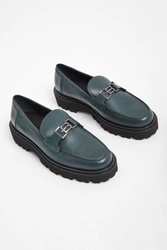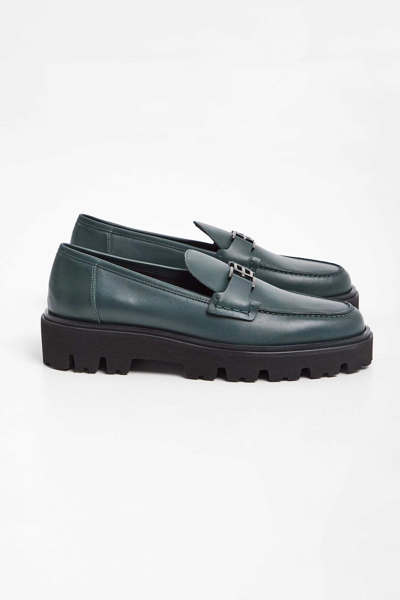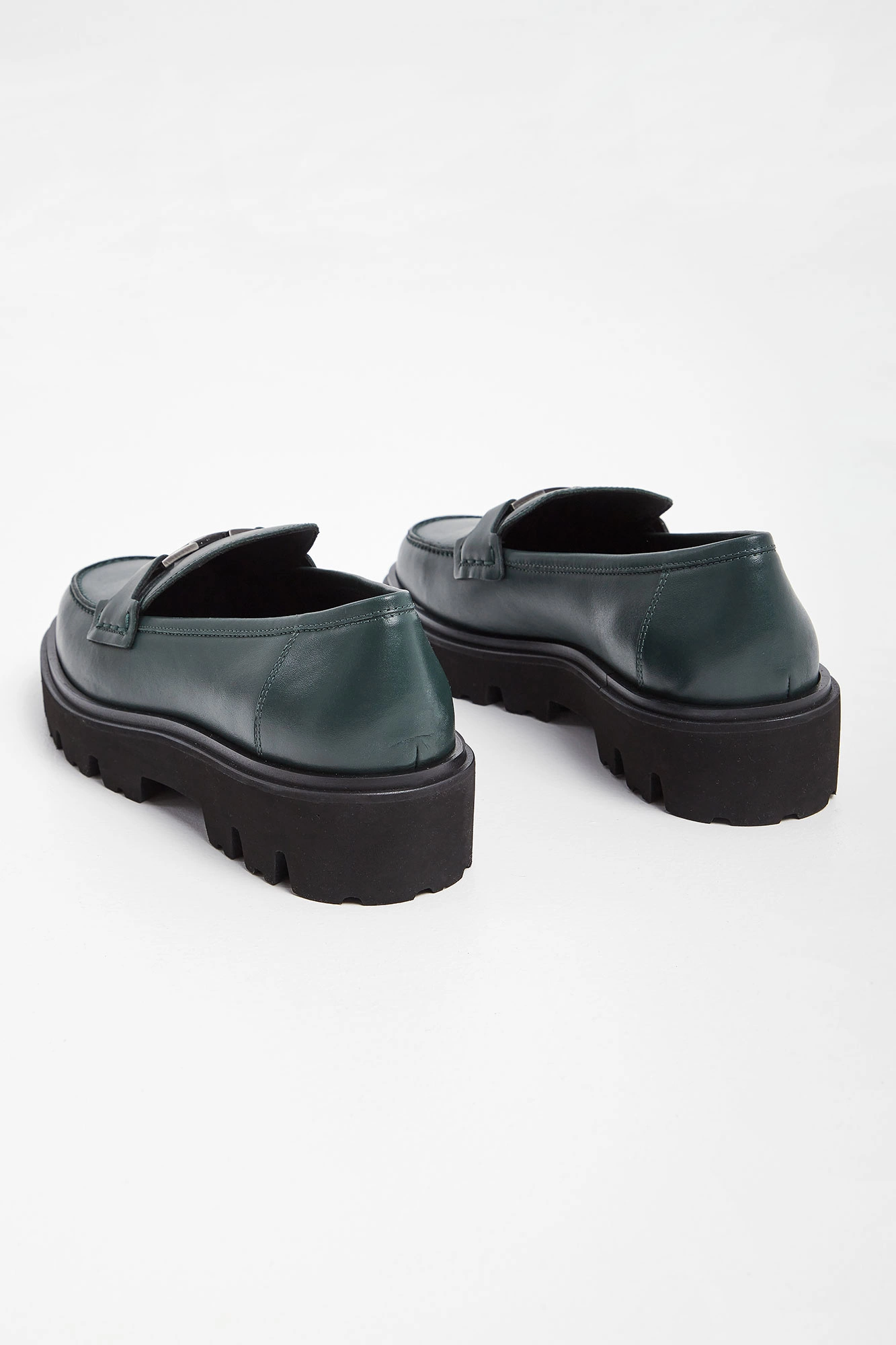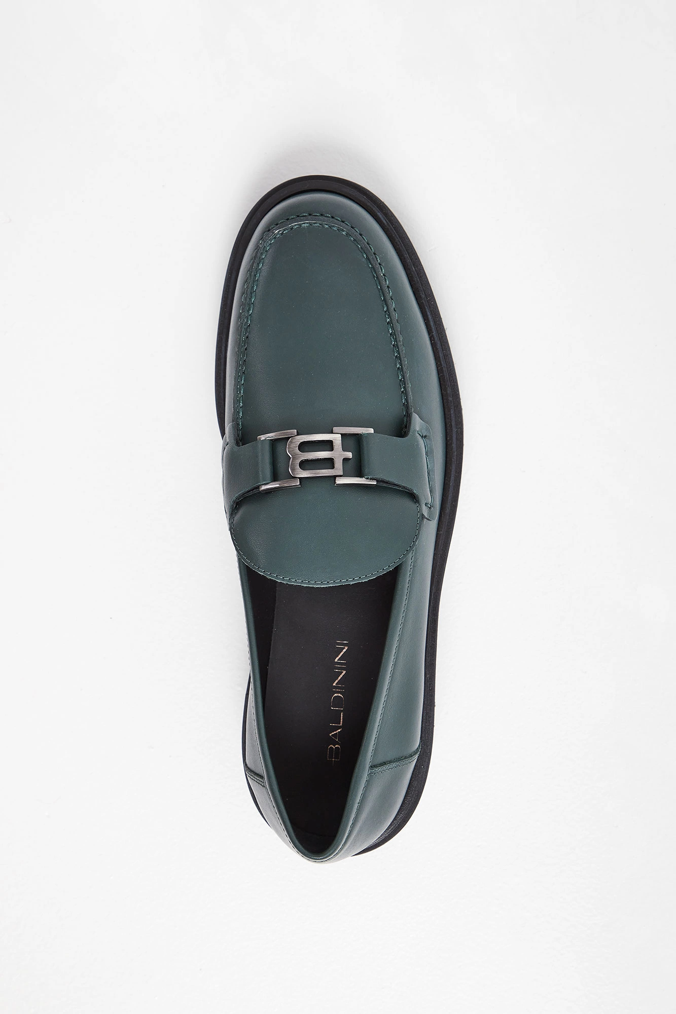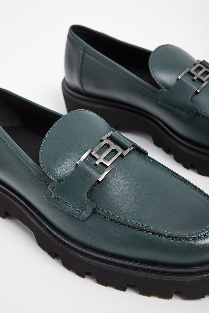 Półbuty marki Baldinini w kolorze ciemnozielonym. Na całości przeszycia. Z przodu aplikacja klamry z czarnym logo marki. Na grubej, czarnej podeszwie. Wykonane ze skóry naturalnej. Wygodny i ponadczasowy model.