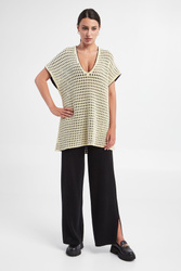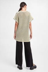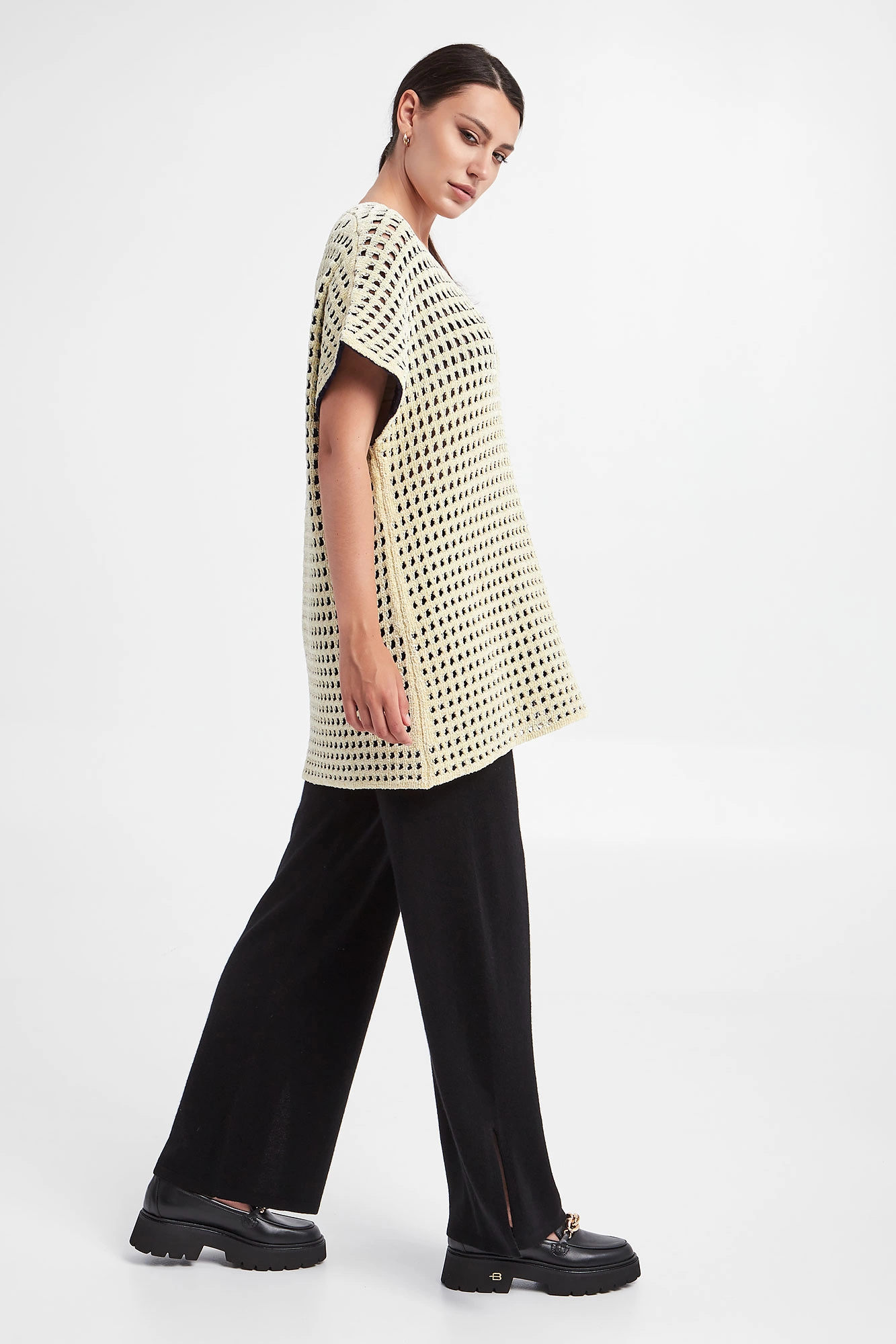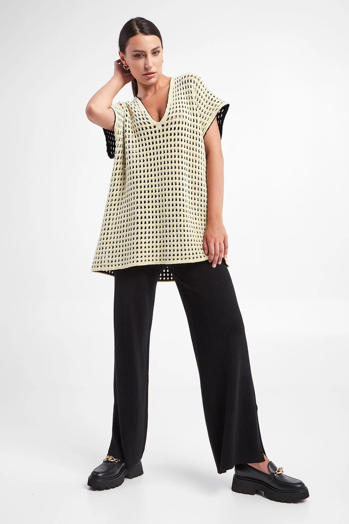 Tunika marki Wolford w kolorze jasnożółtym. Oversizowy fason. Całość pleciona w regularny, ażurowy wzór. Bez rękawów. Dekolt typu v-neck. Spód w kolorze granatowym. Tunika wykonana z miłego w dotyku, wiskozowego materiału.