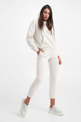 Dzianinowa bluza z kapturem marki Armani Exchange w kremowym kolorze. Fason typu regular fit. Z przodu kieszeń typu kangurka oraz aplikacja z wytłoczonym logo i z nazwą marki w różowym kolorze. Kaptur regulowany za pomocą troczków. Rękawy i dół wykończone ściągaczem prążkowanym.