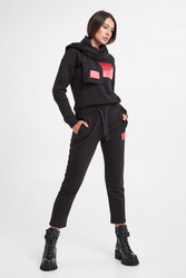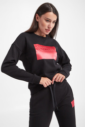 Dzianinowa bluza marki Armani Exchange w czarnym kolorze, pochodząca z linii wspierającej zrównoważoną modę. Fason regular fit. Na froncie różowa naszywka z toczonym logo. Dekolt typu o-neck, długie rękawy i dół wykończone elastycznymi ściągaczami. Wykonana z bawełnianej tkaniny z domieszką elastycznych włókien.