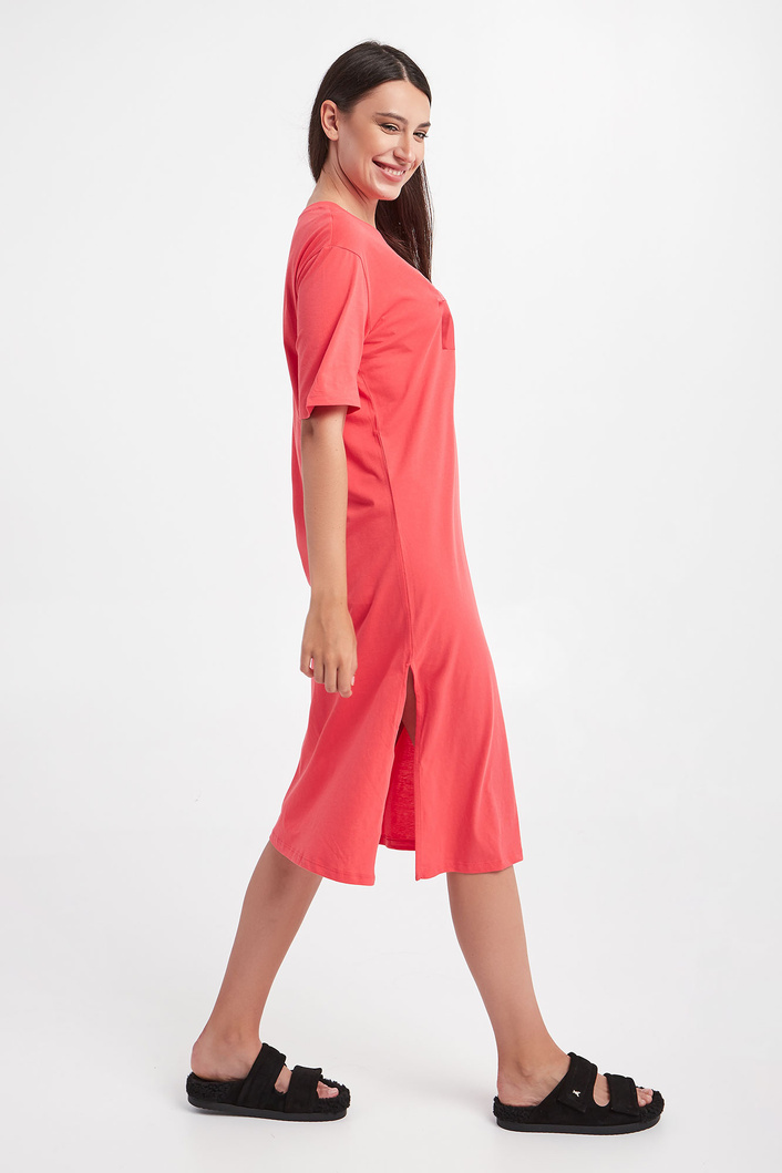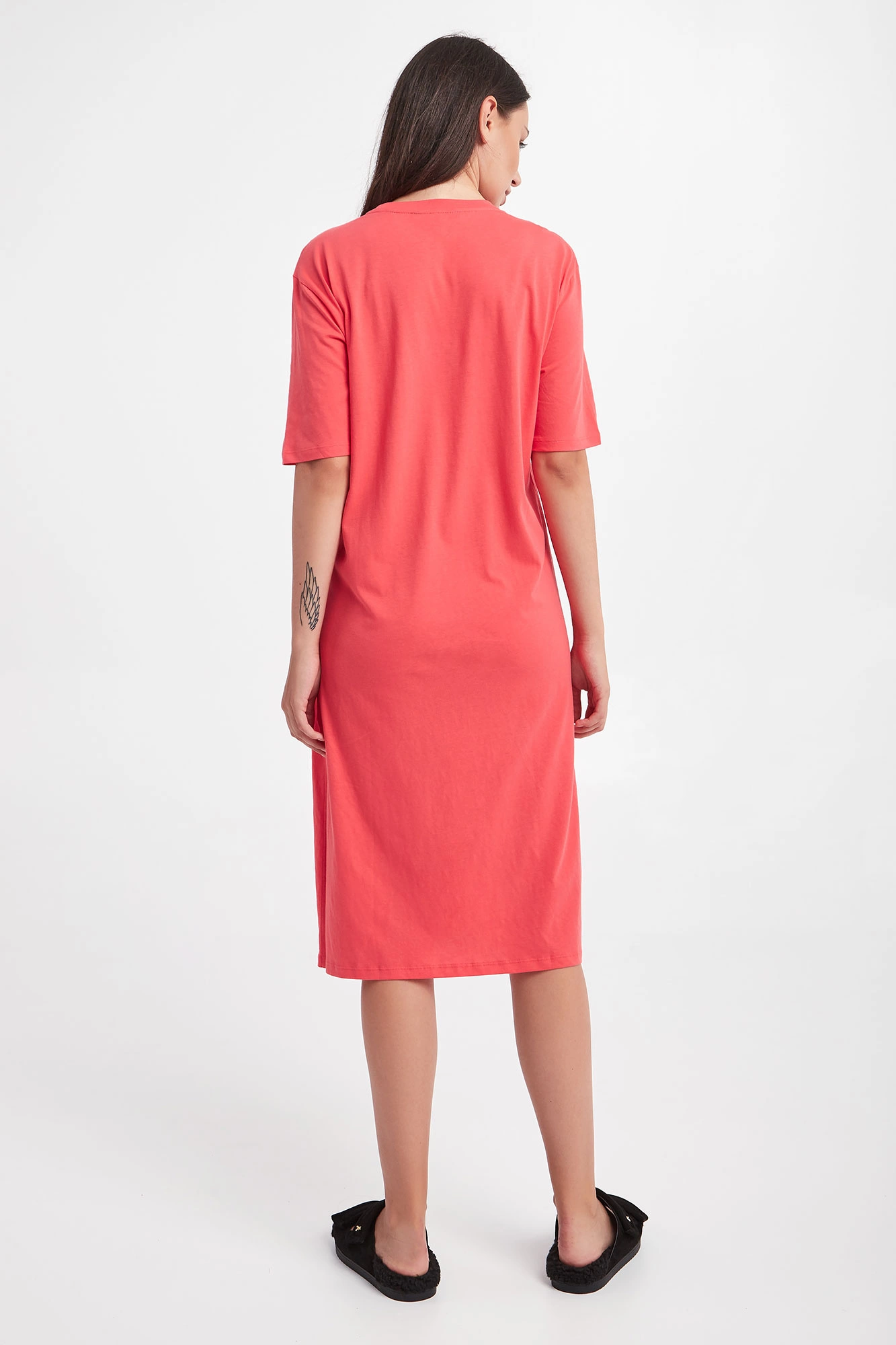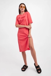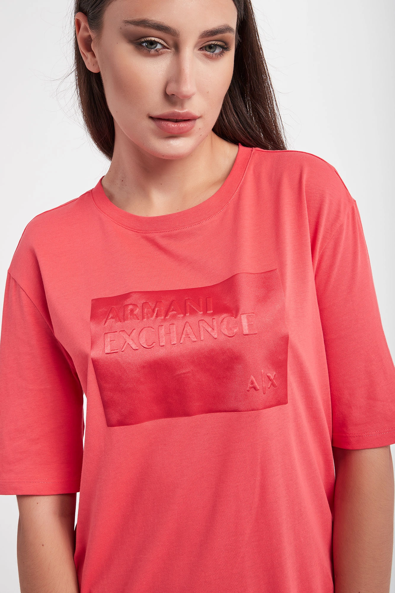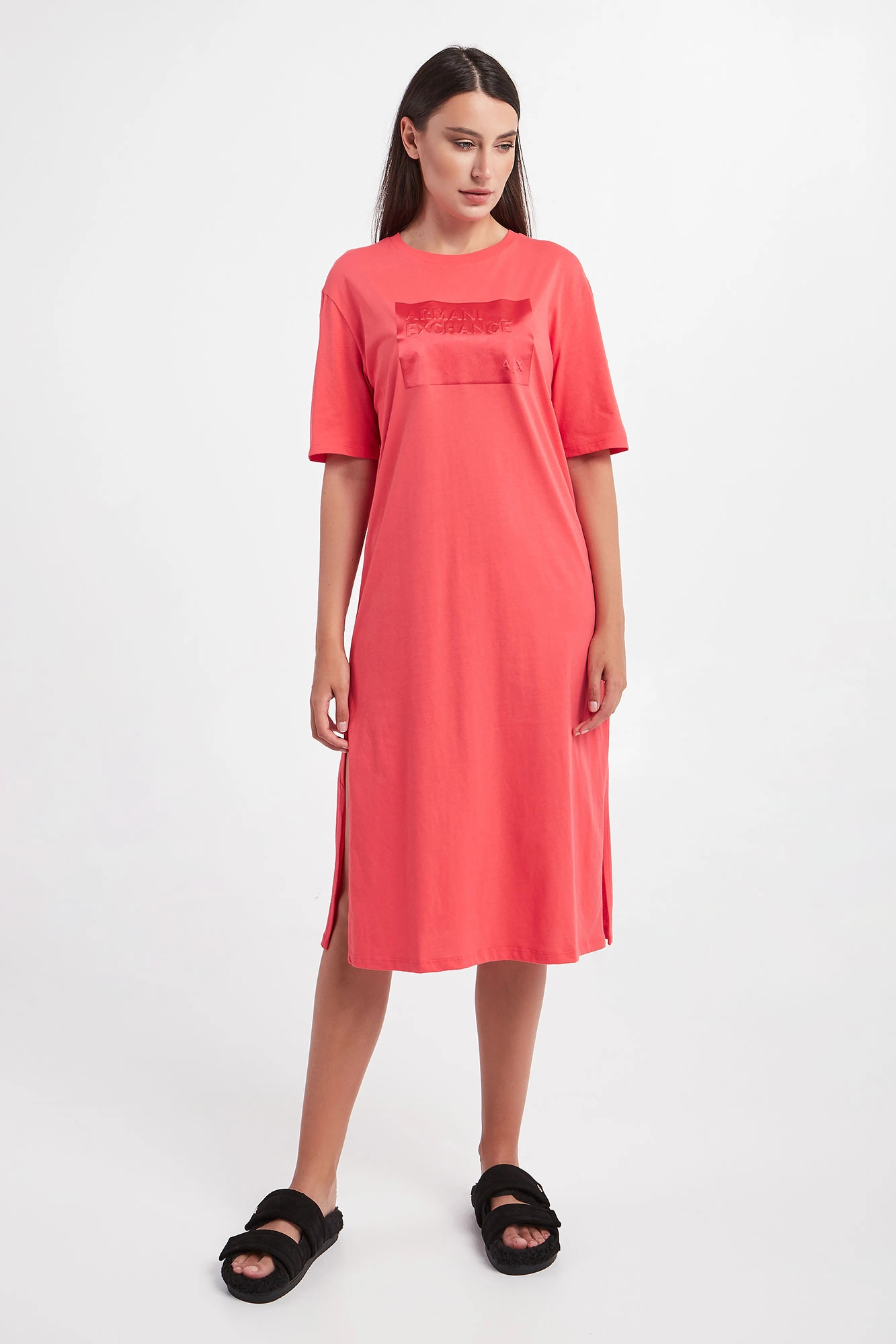 Sukienka marki Armani Exchange w malinowym kolorze. Fason typu regular o długości midi. Na przodzie nadruk w postaci logo marki. Dekolt o-neck zakończony elastycznym ściągaczem. Krótkie rękawy i dół wykończone lamówką. Po bokach, na dole rozcięcia. Sukienka wykonana ze stuprocentowej bawełny.