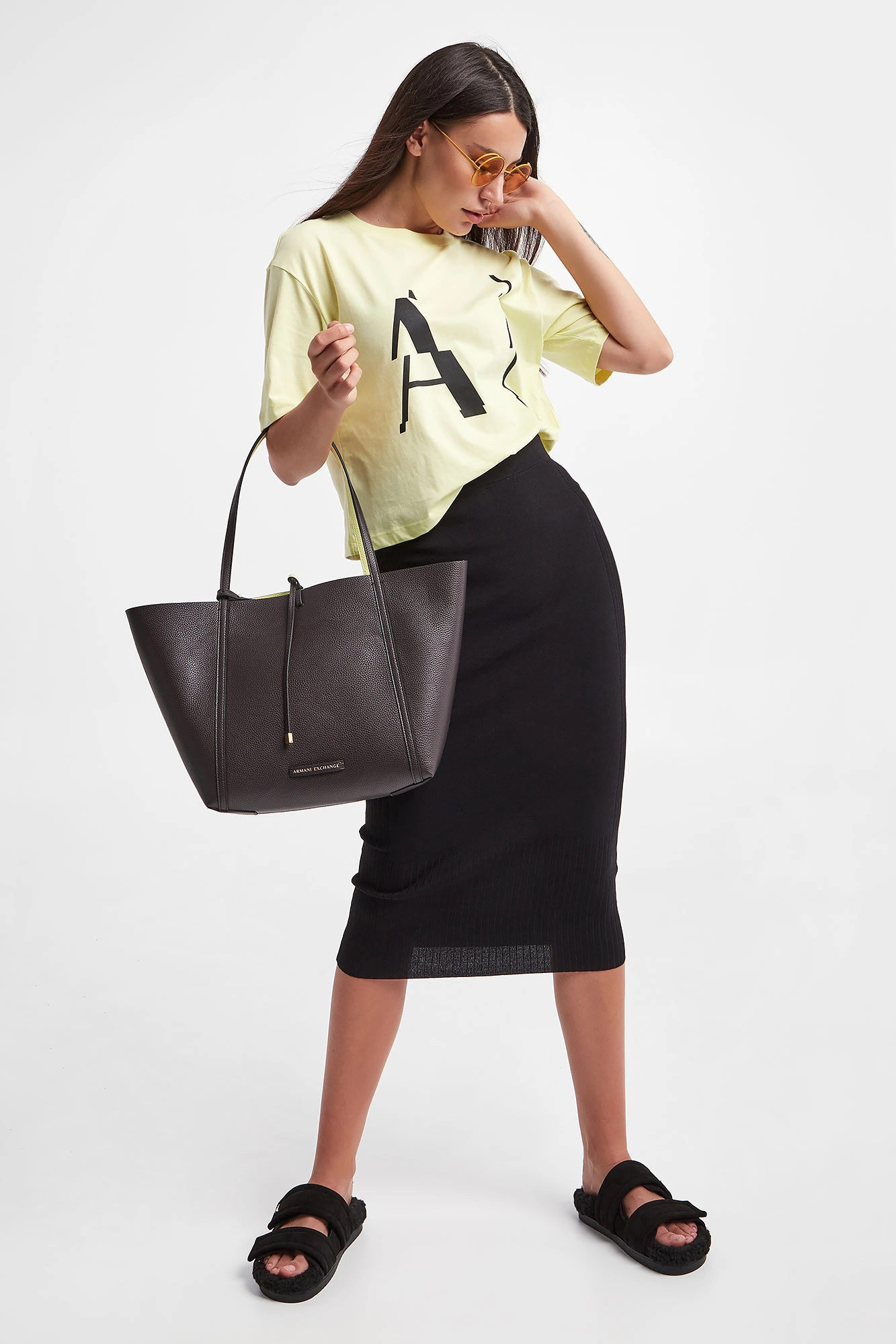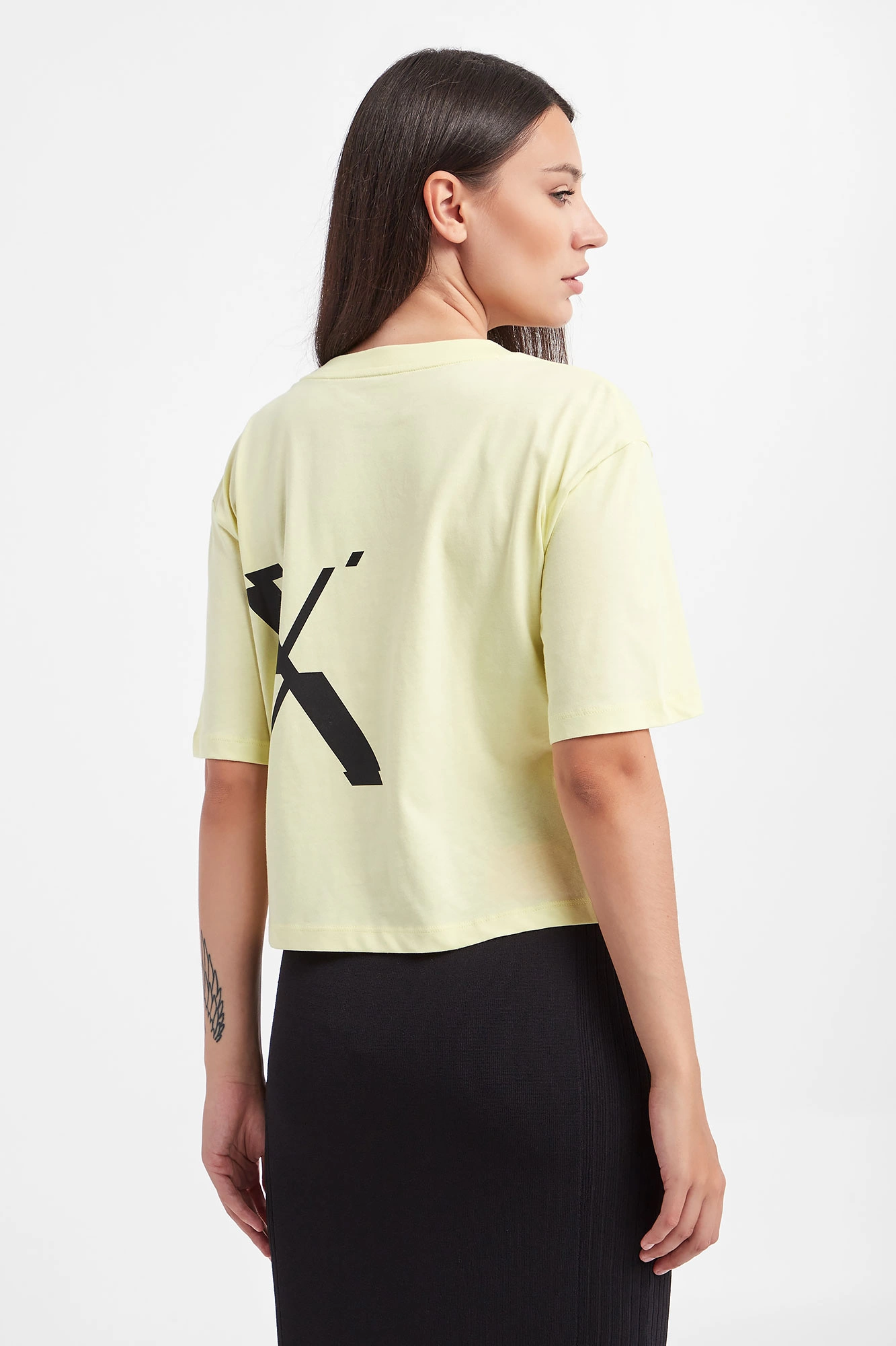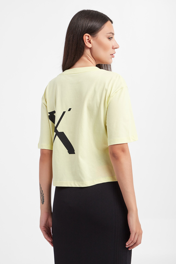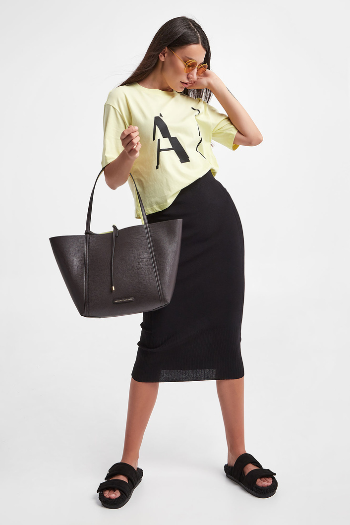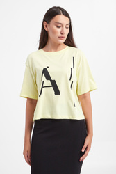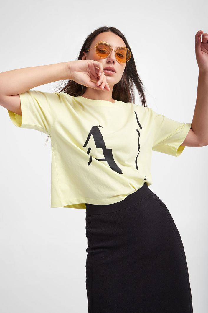 T-shirt marki Armani Exchange w limonkowym kolorze. Szerszy fason typu cropped. Na całości nadruk z nazwą marki w czarnym kolorze. Dekolt typu o-neck wykończony lamówką. Krótkie rękawy zakończone przeszyciem. Wykonane z czystej bawełny.