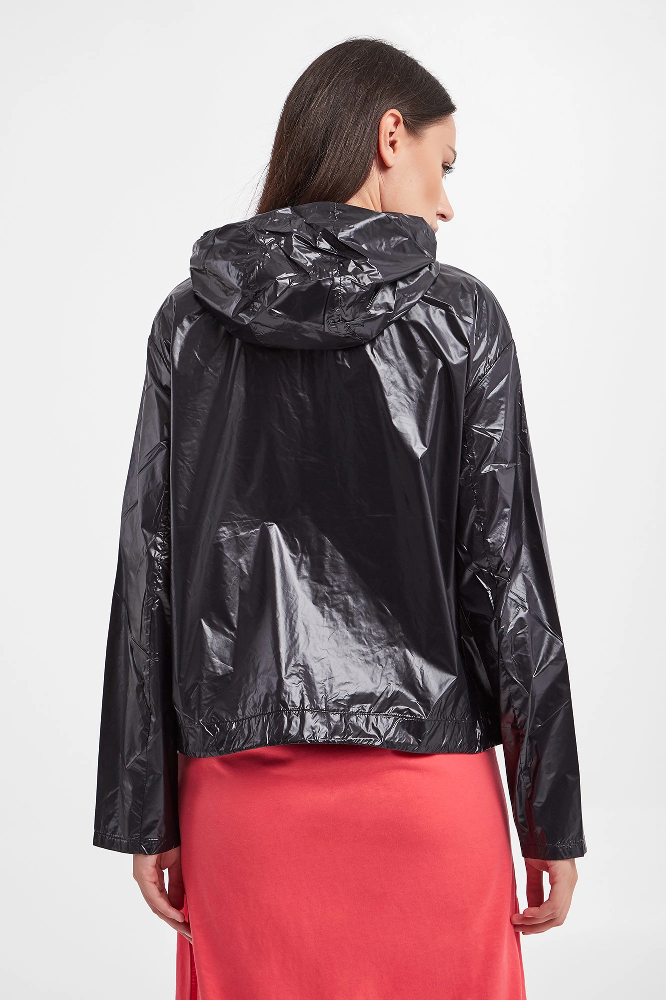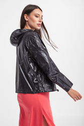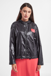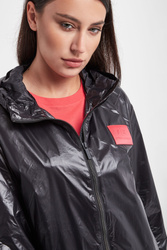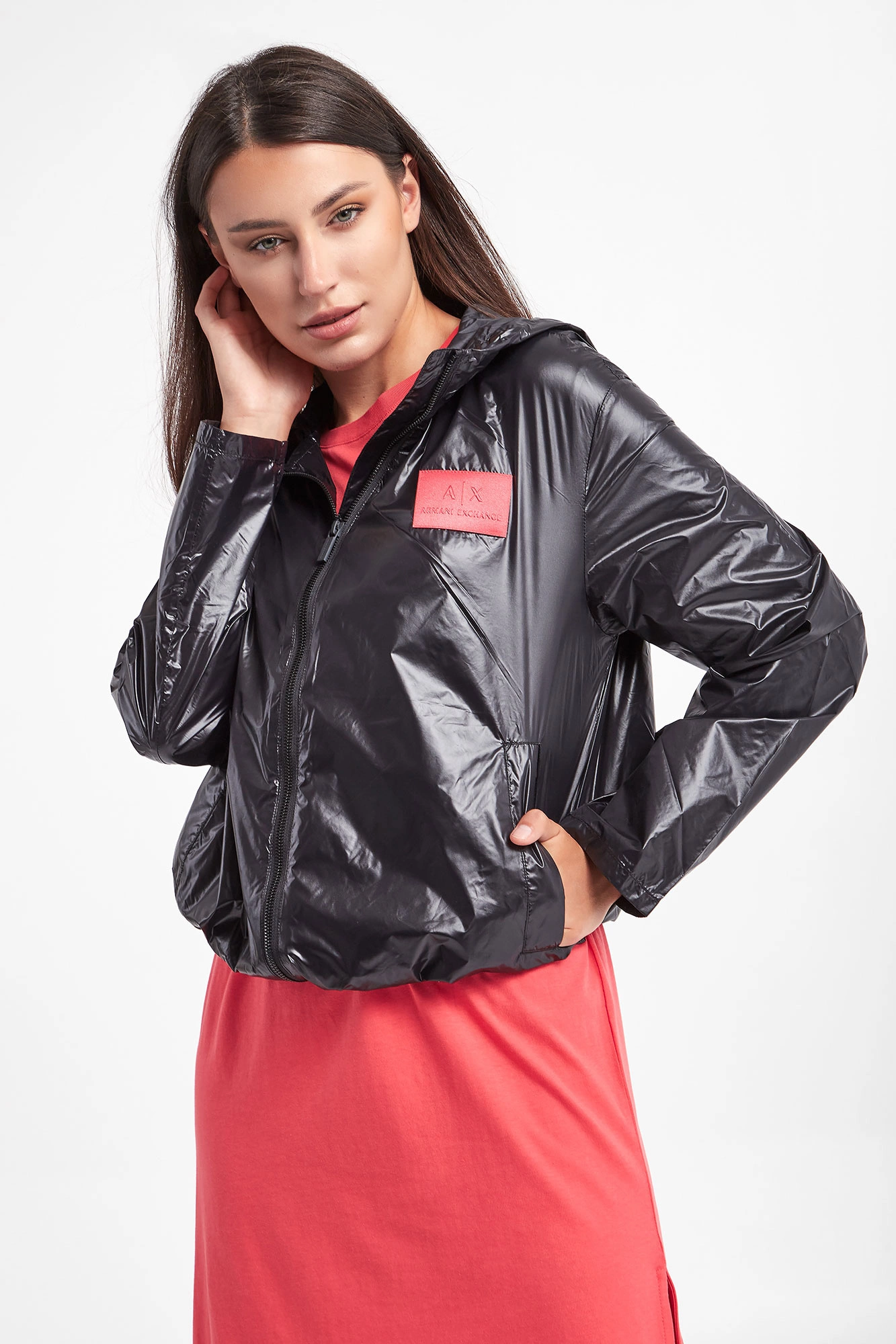 Kurtka z kapturem marki Armani Exchange w czarnym kolorze. Całość połyskująca. Fason typu relaxed fit. Z przodu naszywka z tłoczona nazwą marki w różowym kolorze. Dół wykończony ściągaczem regulowanym za pomocą elastycznych troczków ze stoperem. Model z dwoma wpuszczanymi kieszeniami. Zapinana za pomocą zamka błyskawicznego.