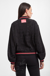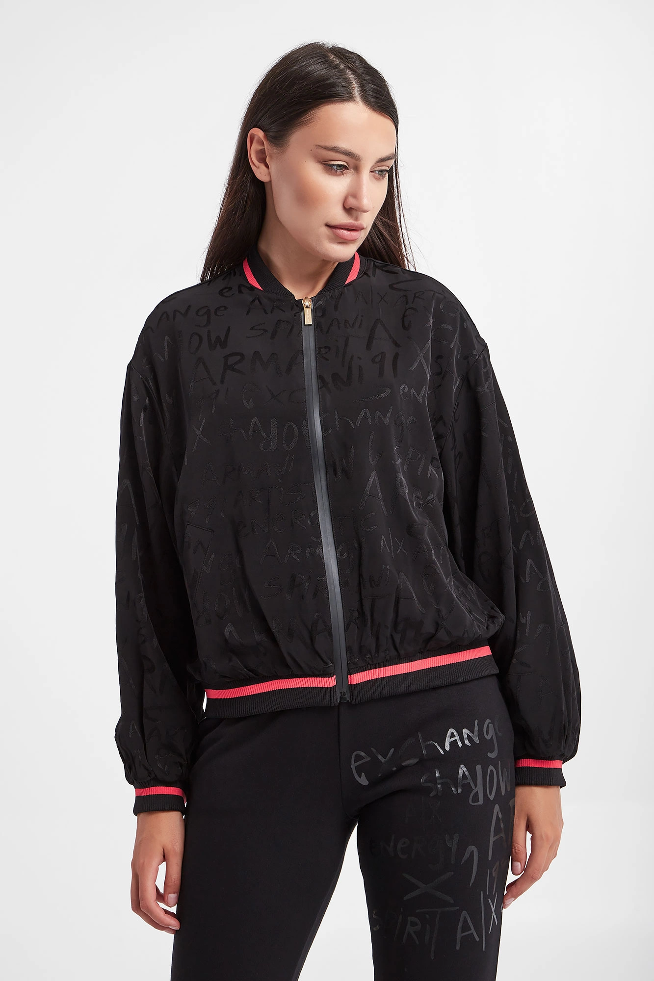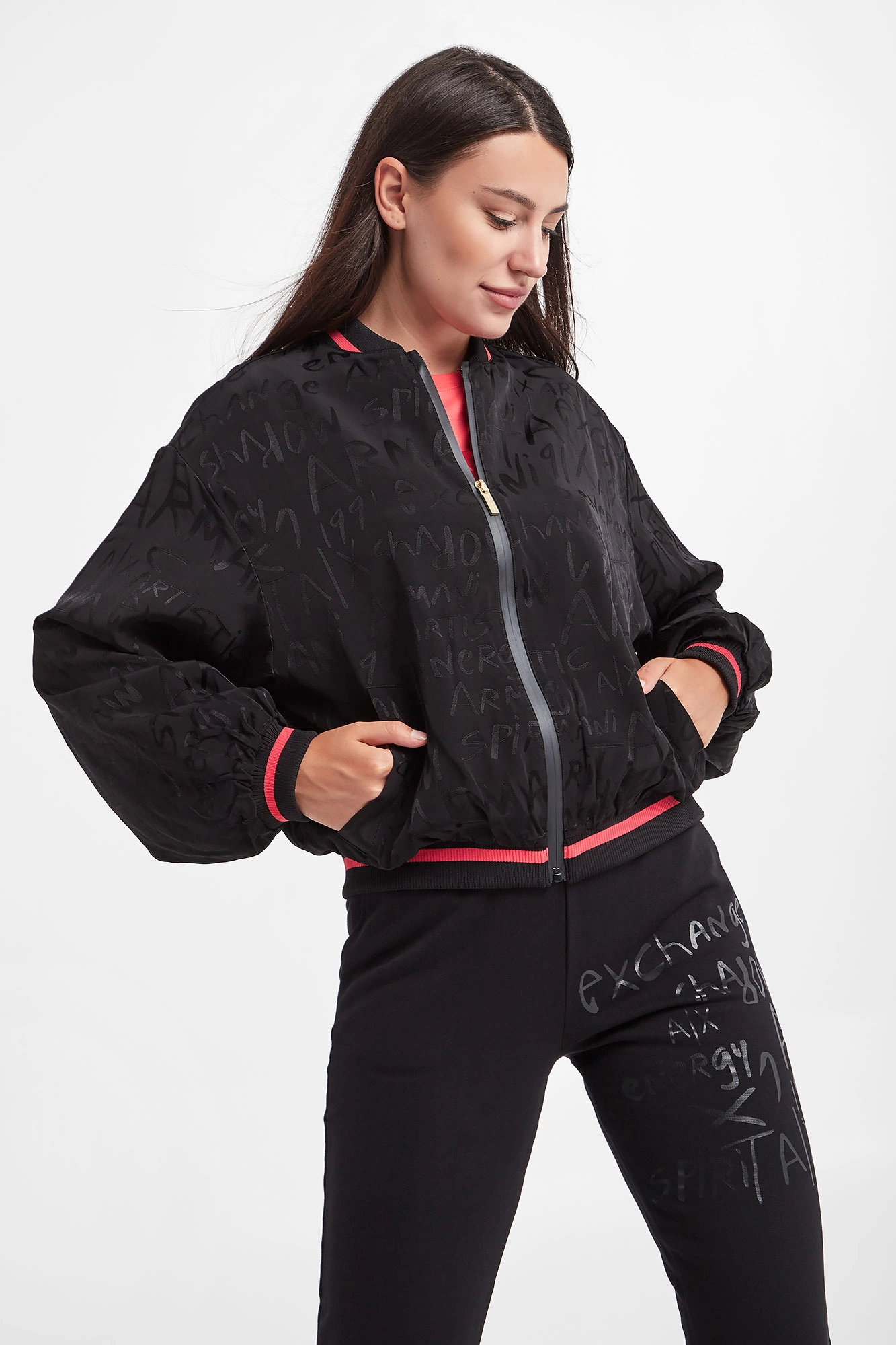 Kurtka marki Armani Exchange w czarnym kolorze. Fason regular fit, w typie bomberki. Na całości wzór z napisami z nazwą marki. Zapinana za pomocą zamka ze złotą, sygnowaną zawieszką. Dwie boczne, wpuszczane kieszenie. Dekolt z stójką, długie rękawy i dół wykończone czarno-różowymi ściągaczami. Wykonana z czystej wiskozy.