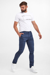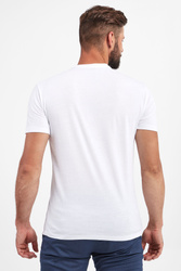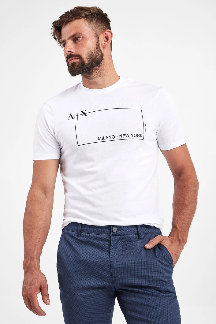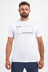 T-shirt marki Armani Exchange w białym kolorze. Fason typu regular fit. Z przodu nadruk w postaci logo i nazwy marki w biało-czarnym kolorze. Dekolt typu o-neck wykończony ściągaczem. Krótkie rękawki i dół zakończone lamówką. W całości wykonany z tkaniny bawełnianej.