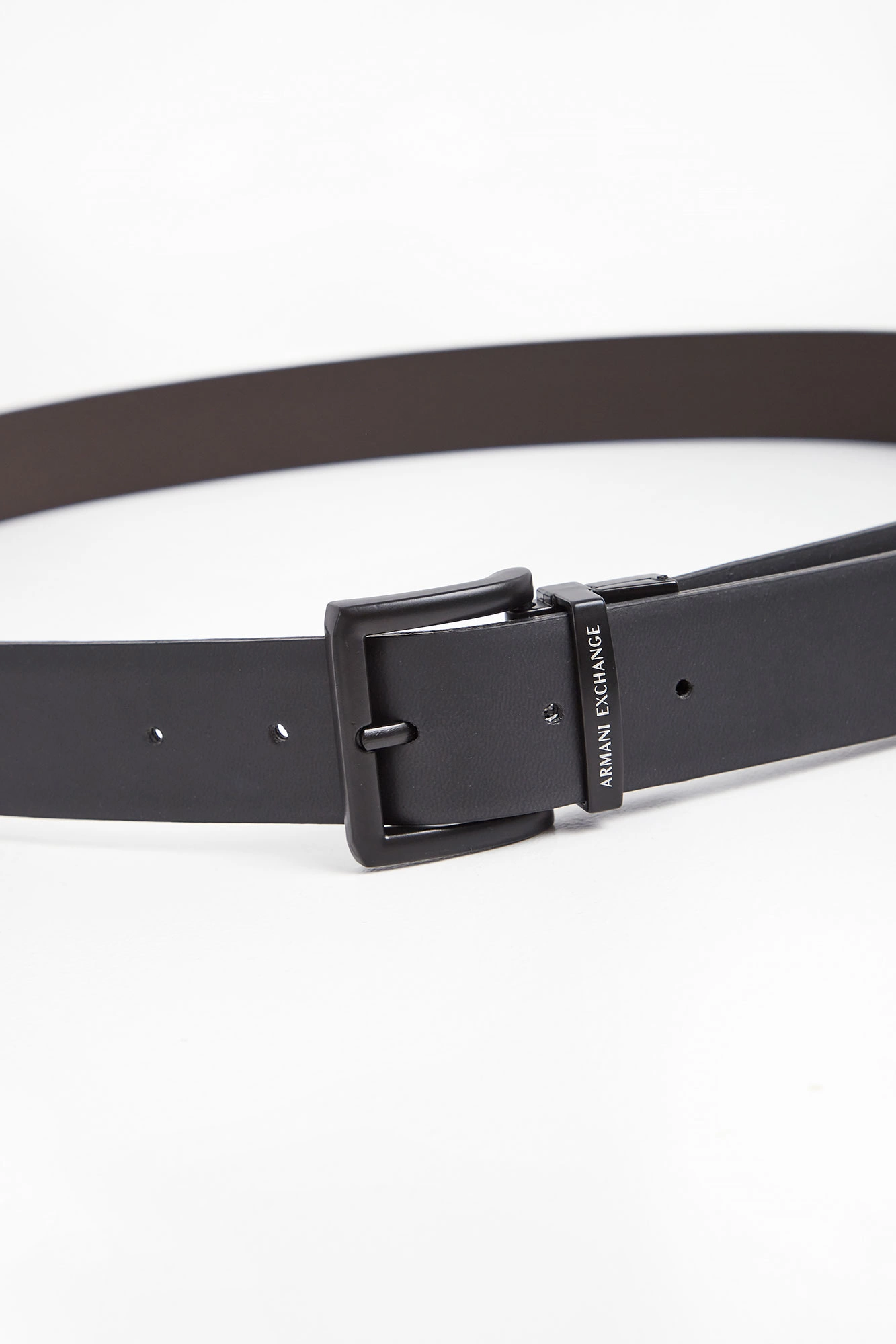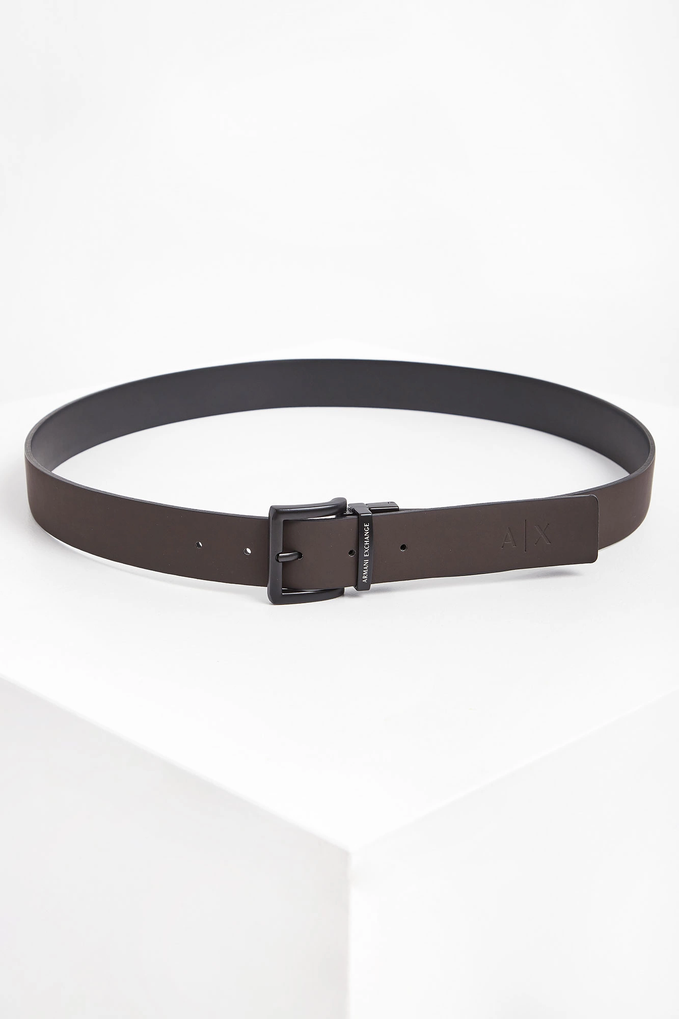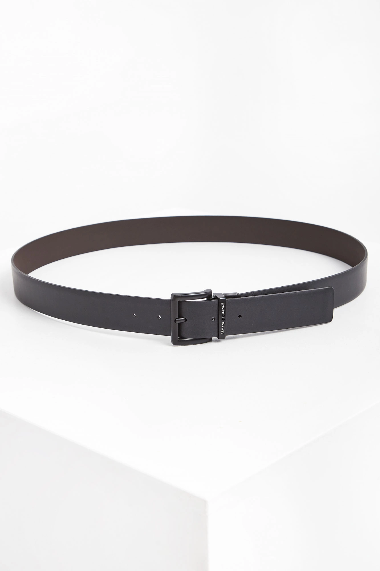 Dwustronny pasek marki Armani Exchange. Grafitowo-brązowy. Wykonany z ekologicznej skóry. Zapinany za pomocą metalowe klamry z tłoczoną nazwą marki.