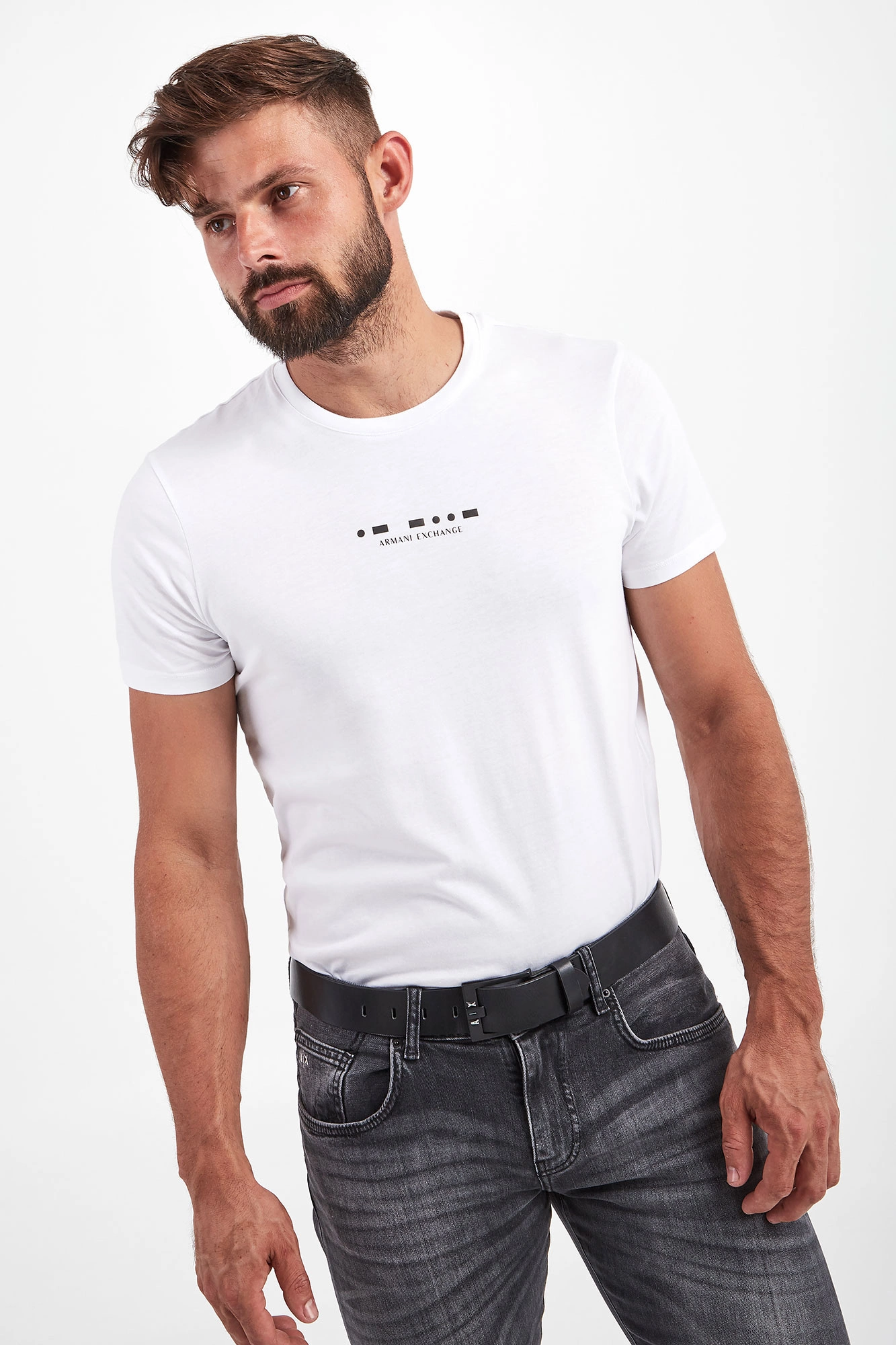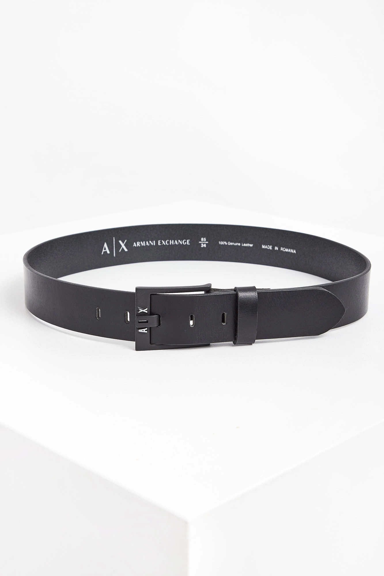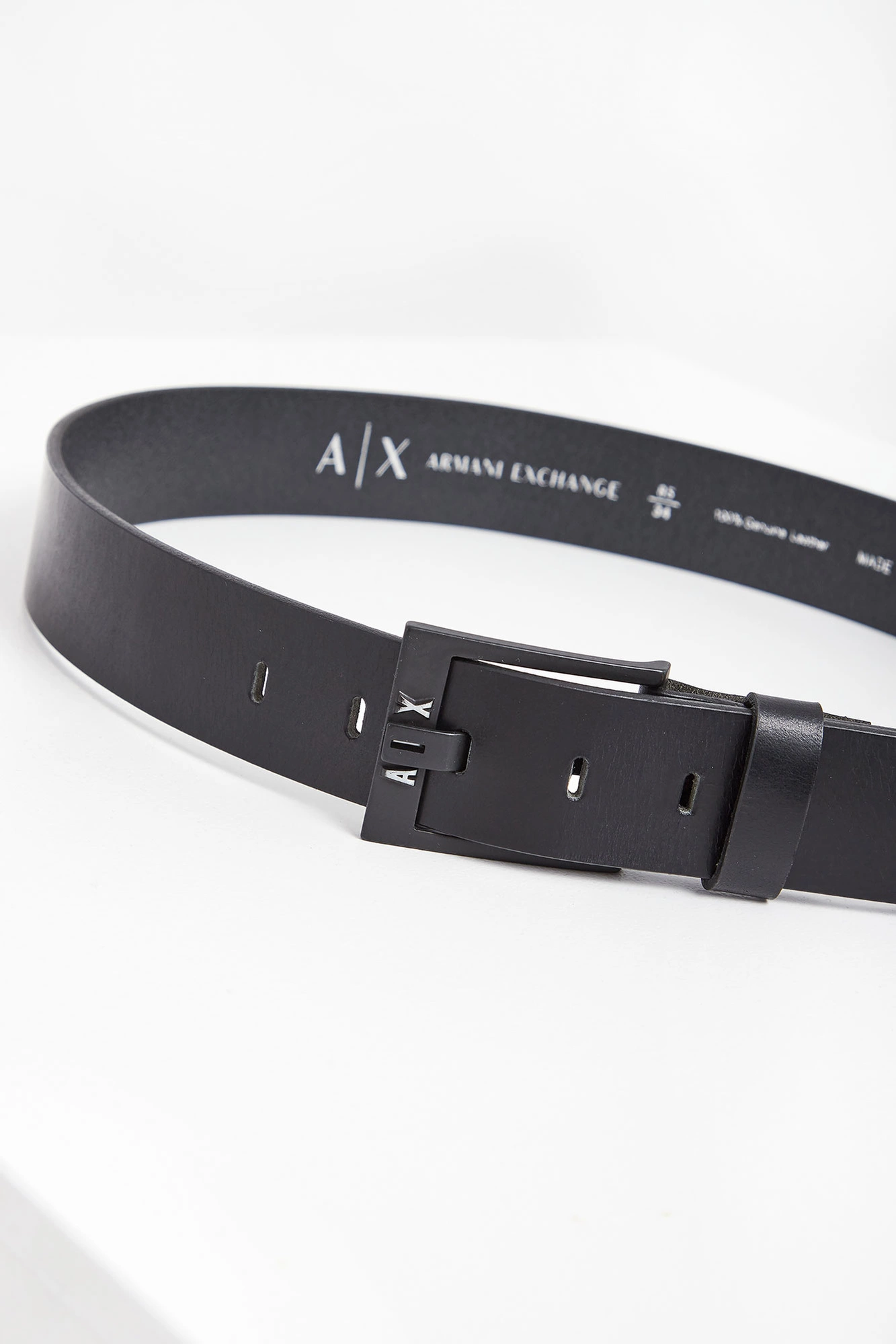 Skórzany pasek marki Armani Exchange w czarnym. Wykonany z naturalnej, gładkiej skóry. Zapinany za pomocą metalowe klamry z tłoczoną nazwą marki.