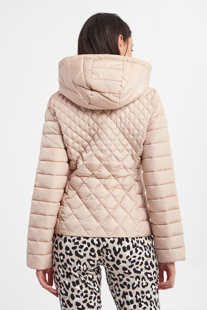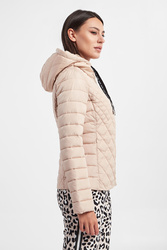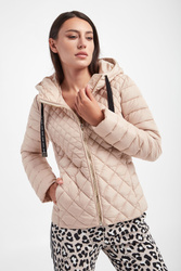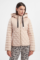 Kurtka marki Liu Jo w kolorze kremowym. Fason typu slim. Na całości geometryczne pikowania i przeszycia optycznie modelujące sylwetkę. Kaptur regulowany za pomocą sygnowanych troczków. Dwie kieszenie zapinane na suwak. Kurtka zapinana na sygnowany zamek w kolorze złotym. Lekka i komfortowa.