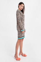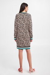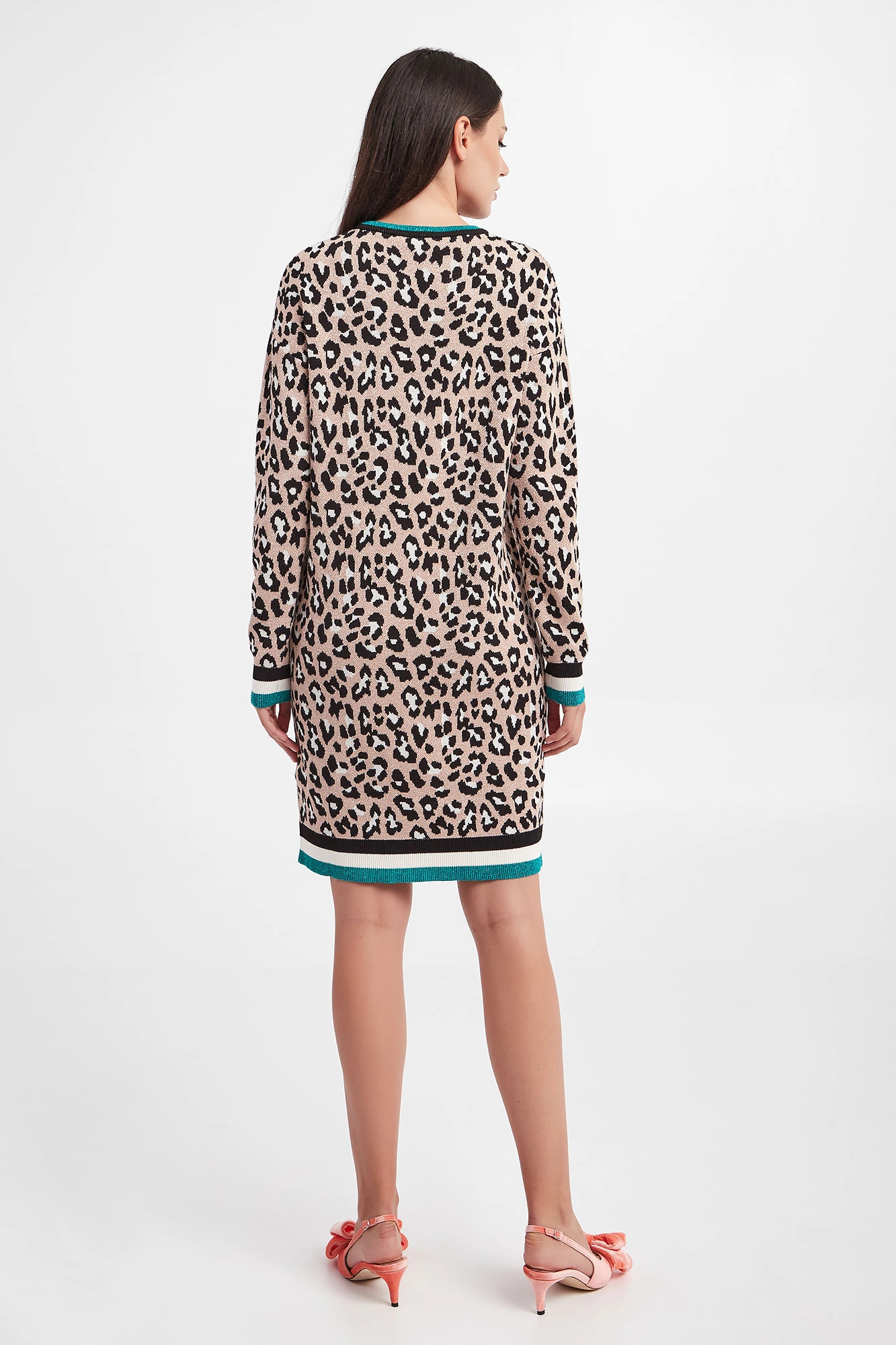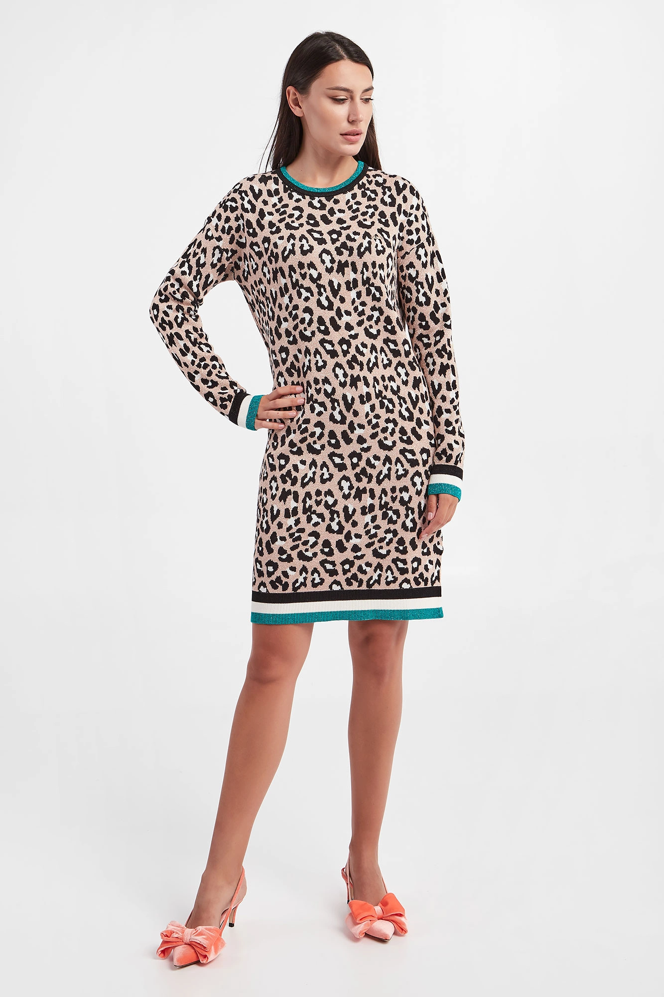 Dzianinowa sukienka marki Liu Jo w beżowym kolorze. Na całości czarno-biały, zwierzęcy wzór. Z boku złota, metalowa zawieszka z logo. Dekolt typu o-neck, długie rękawy i dół wykończone ściągaczami w czarne, turkusowe i białe paski. Całość przeszyta połyskującą nicią. Fason regular fit, długość mini. Wykonana z elastycznej, wiskozowej tkaniny.