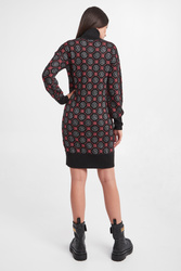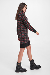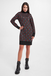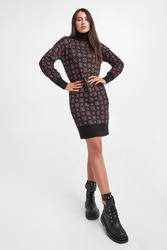 Sukienka marki Liu Jo w kolorze czarnym. Fason typu regular fit o długości mini. Dekolt typu golf. Na całości wzór z multiplikacją logo firmy w kolorze różowym i srebrnym. Golf, długi rękaw i dół wykończone szerokim ściągaczem. Sukienka wykonana z przyjemnego, ciepłego materiału.