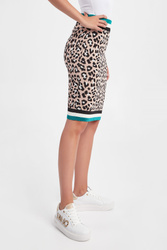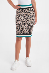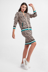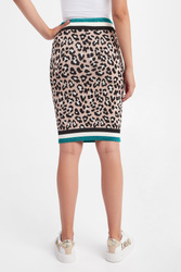 Dzianinowa spódnica marki Liu Jo w beżowym kolorze. Na całości biało-czarny, zwierzęcy wzór. Fason typu slim fit, długość mini. Ściągacze w pasie i u dołu w czarne, turkusowe i białe paski. Z tyłu złota zawieszka z logo. Całość wykończona połyskującą nicią. Wykonana z elastycznej, wiskozowej tkaniny.