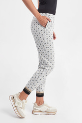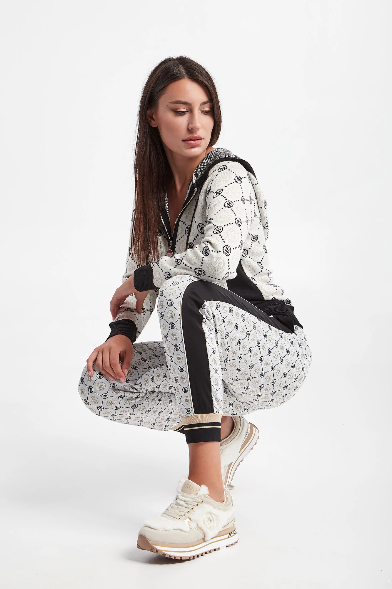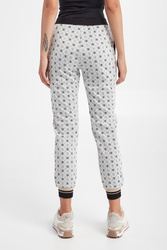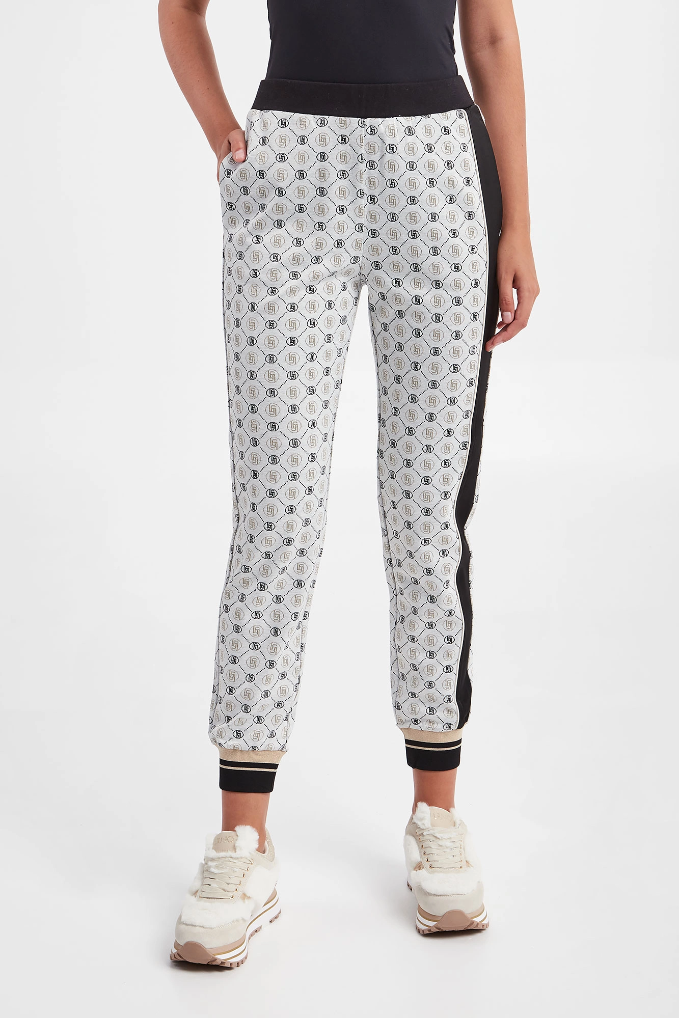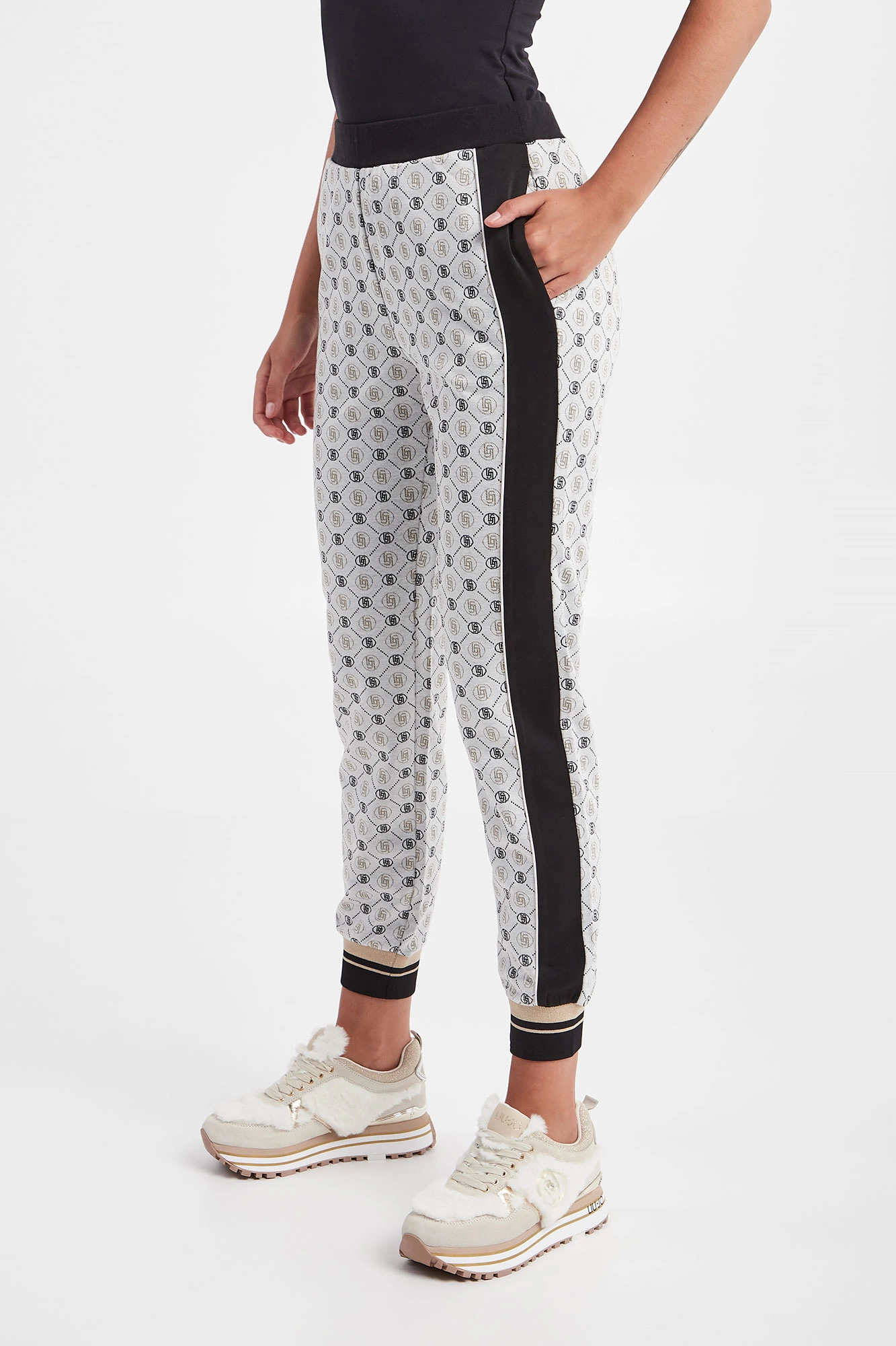 Spodnie marki Liu Jo w kolorze jasnoszarym. Fason typu regular fit. Na całości wzór w postaci multiplikacji czarnego i złotego logo marki. Po bokach dwie kieszenie. Nogawki i pas wykończone elastycznym ściągaczem w czarnym kolorze. Na lewej nogawce szeroki, czarny lampas.