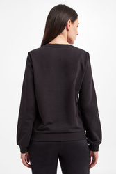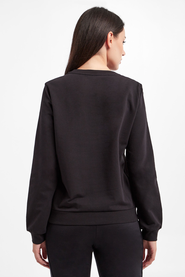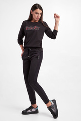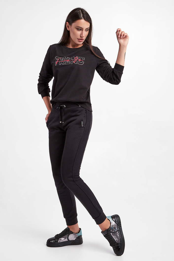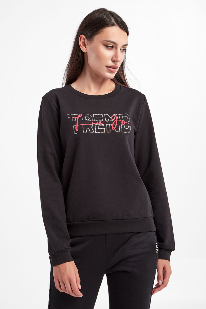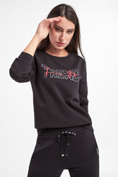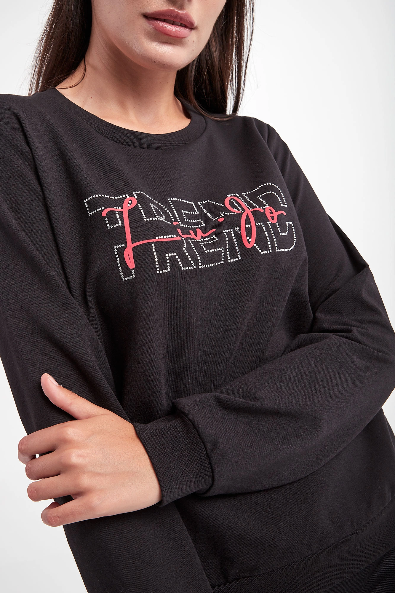 Bluza marki Liu Jo w czarnym kolorze. Na froncie malinowy nadruk z logo oraz wykonany z kryształków napis. Dekolt typu o-neck, długie rękawy i dół zakończone ściągaczami. Fason regular fit. Wykonana z mieszanki bawełny oraz elastanu.