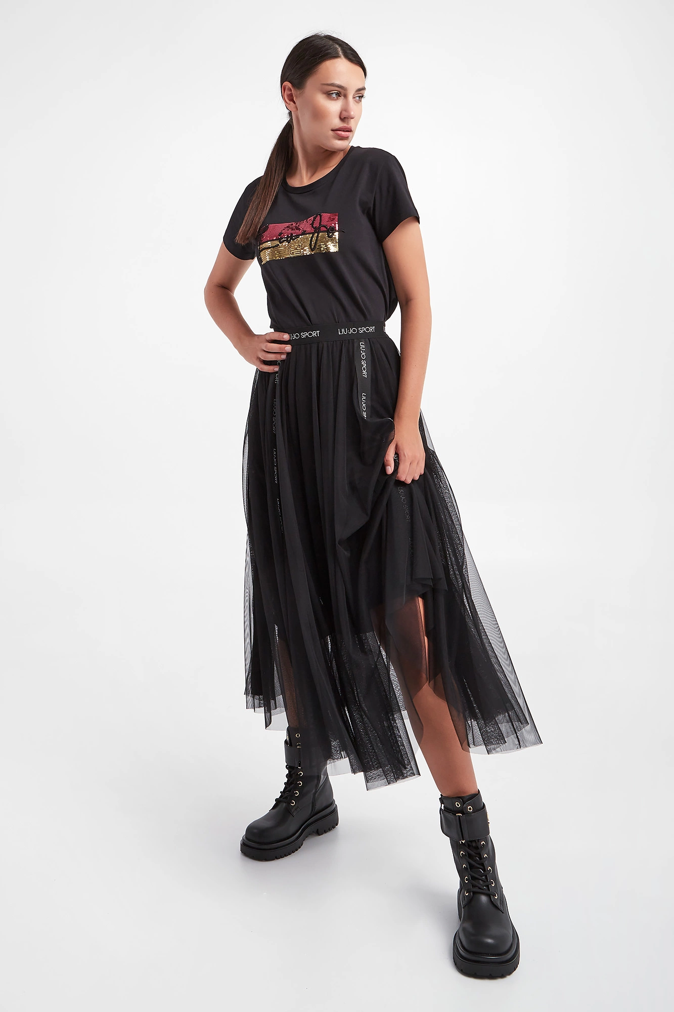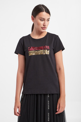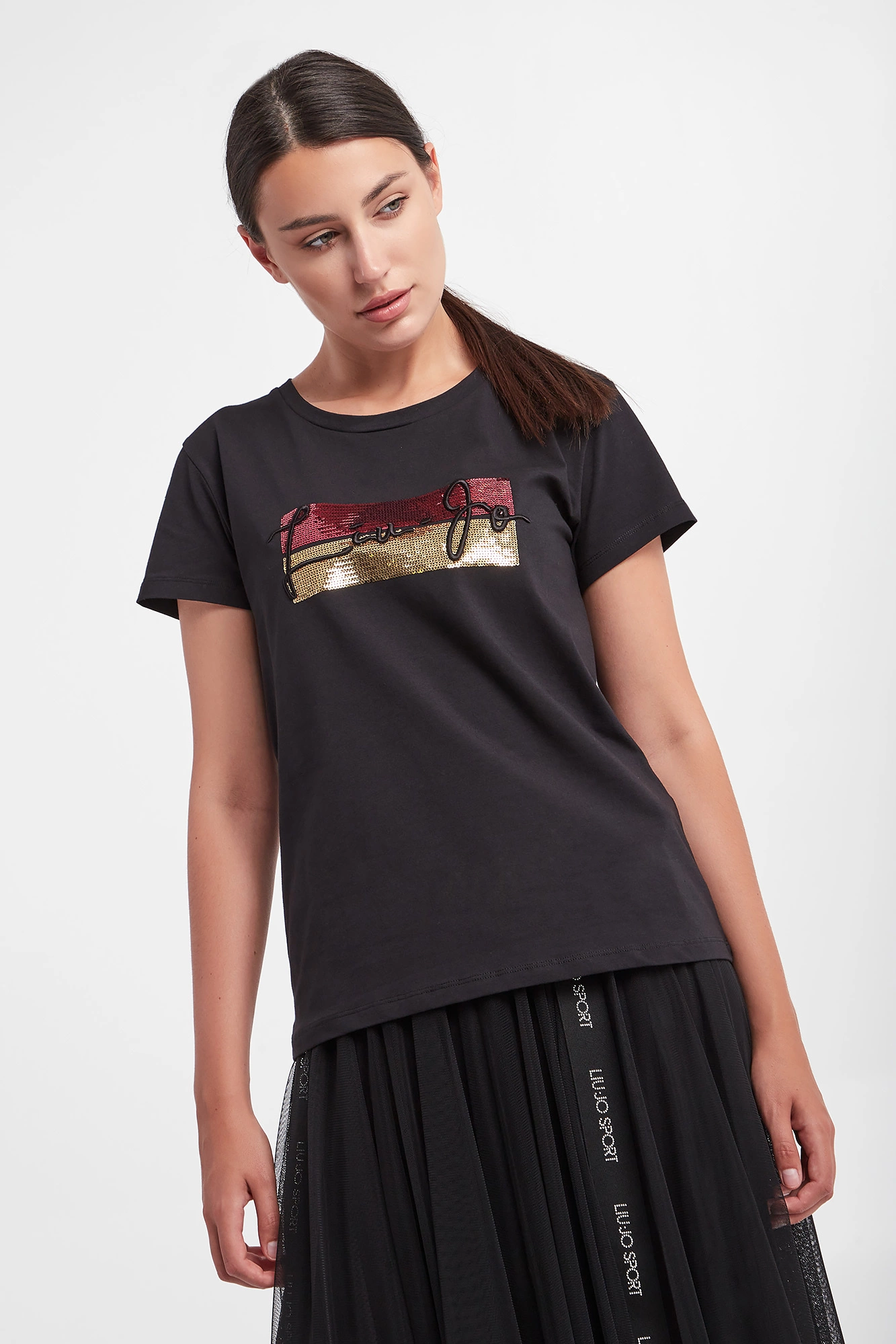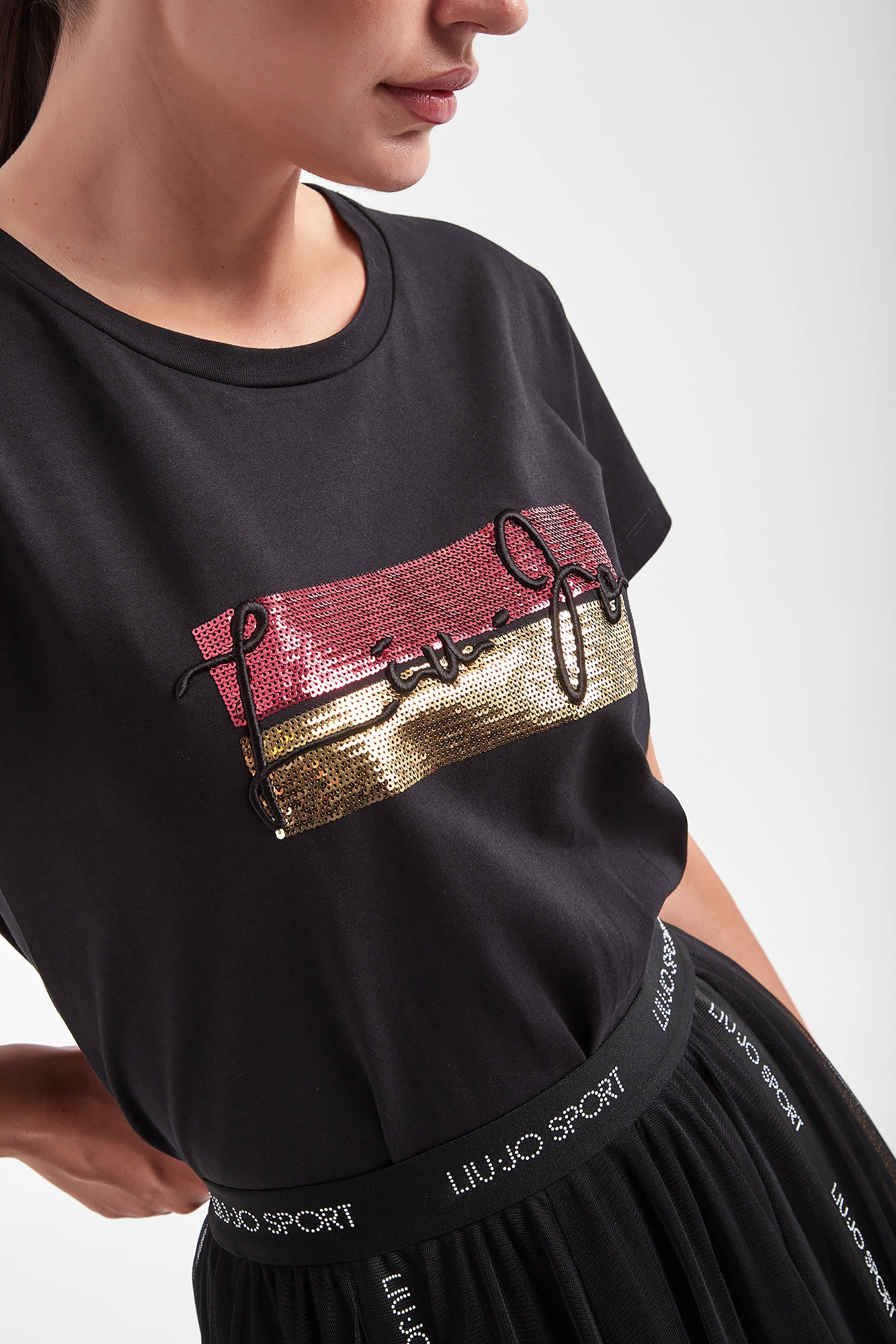 T-shirt marki Liu Jo w kolorze czarnym. Fason regular fit. Na przodzie cekinowa aplikacja i haft w postaci logo marki. Dekolt typu o-neck wykończony ściągaczem gładkim. Dół i krótkie rękawy zakończone lamówką. T-shirt wykonany z tkaniny bawełnianej.