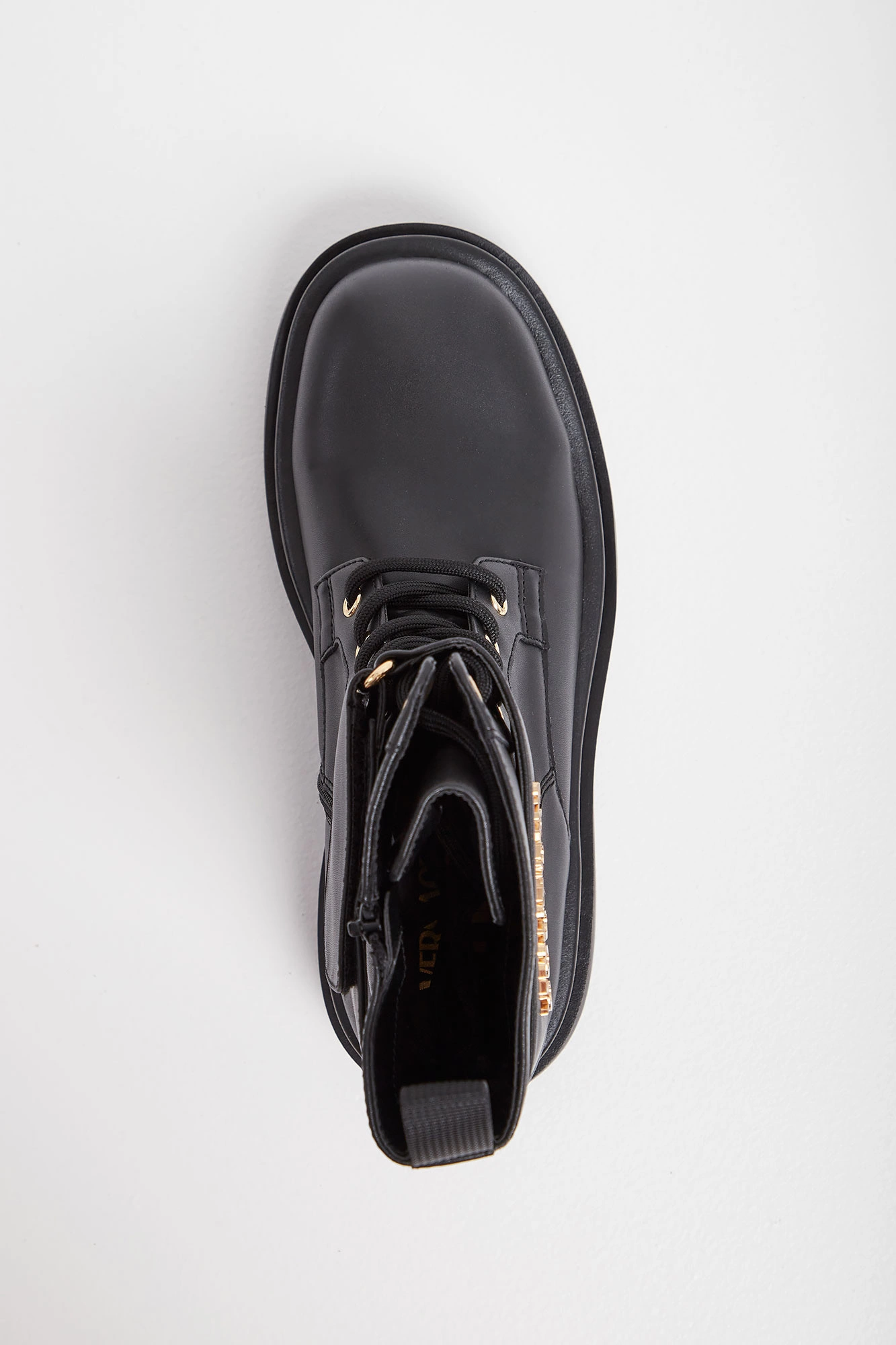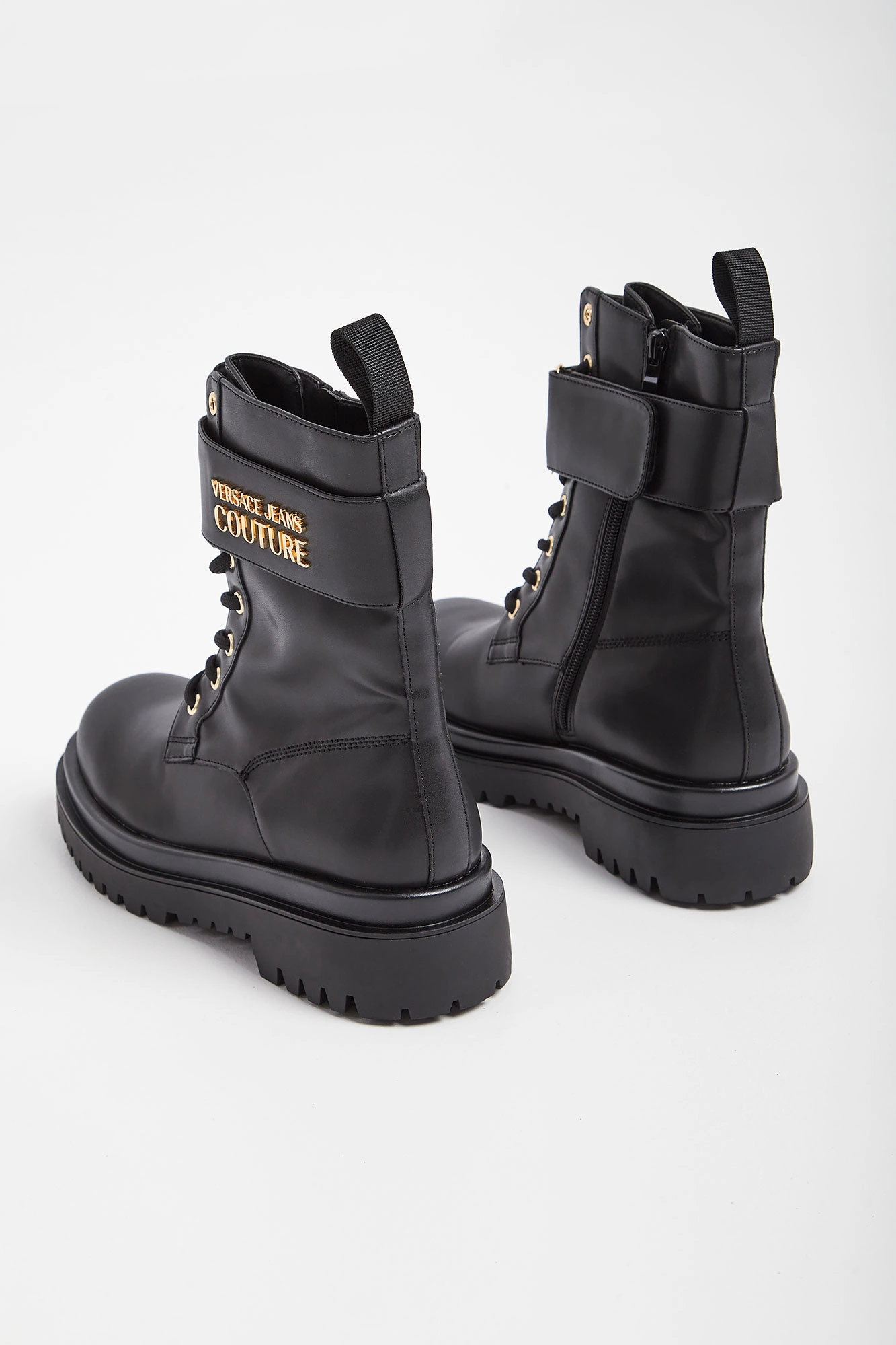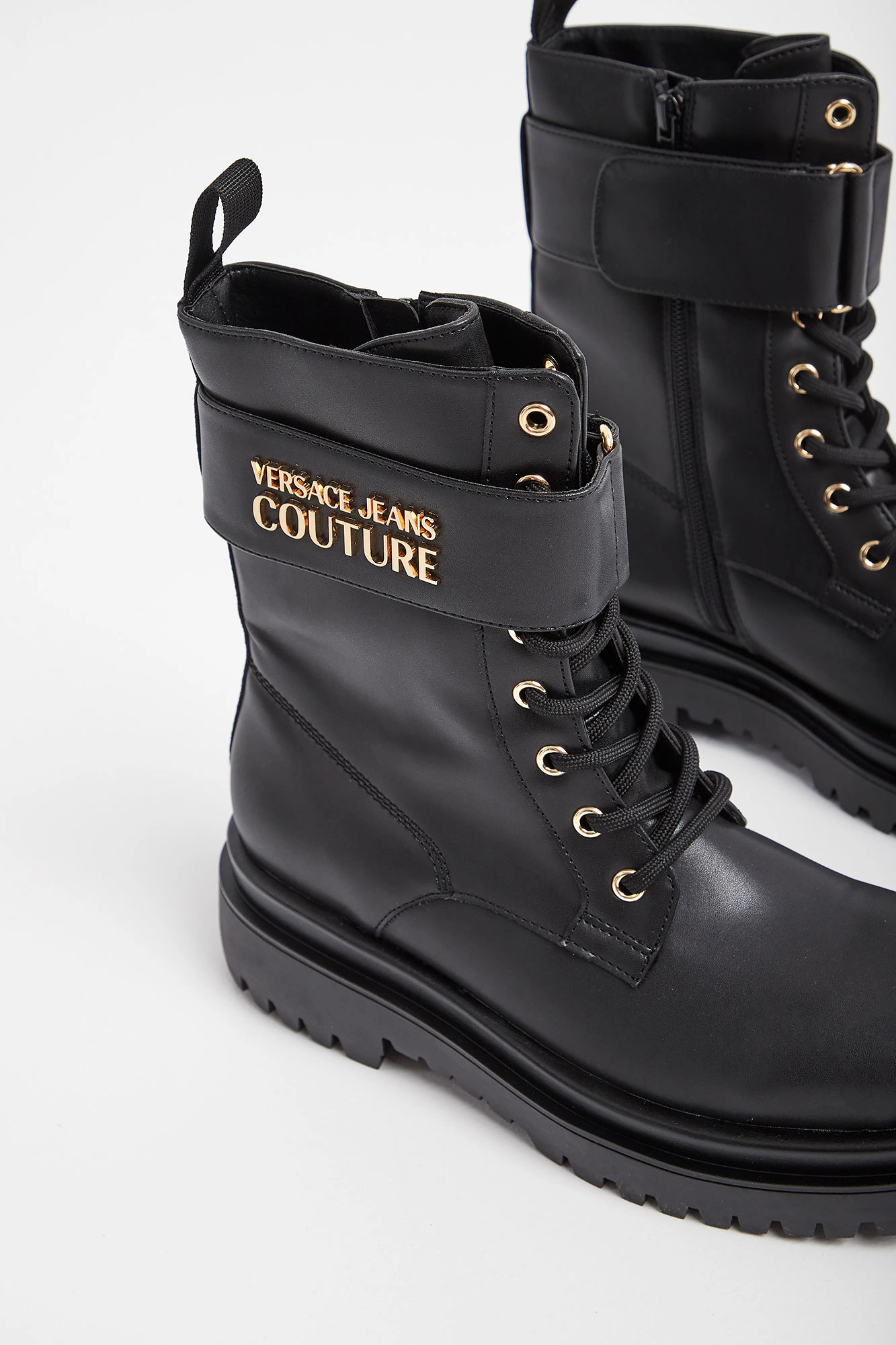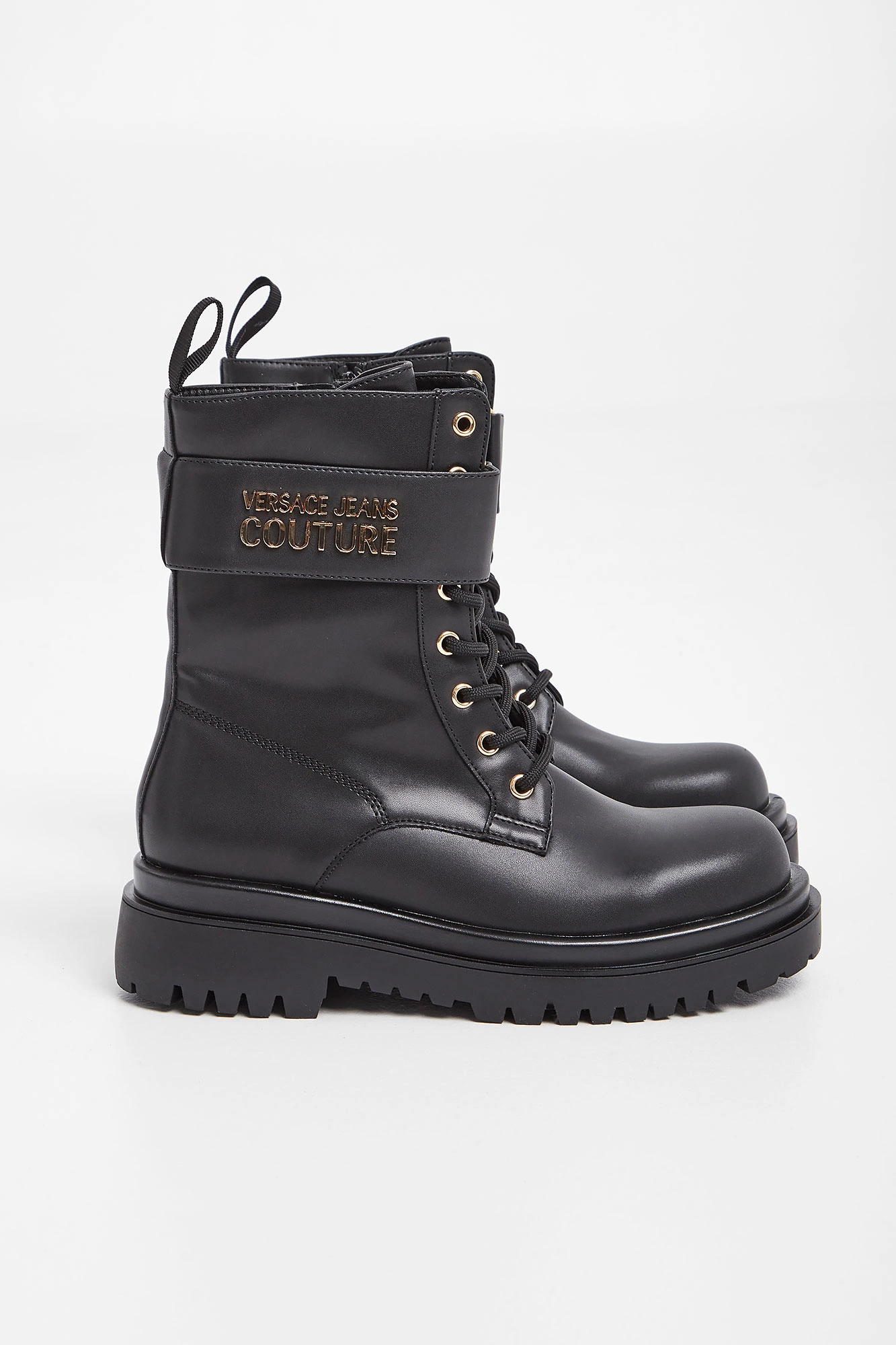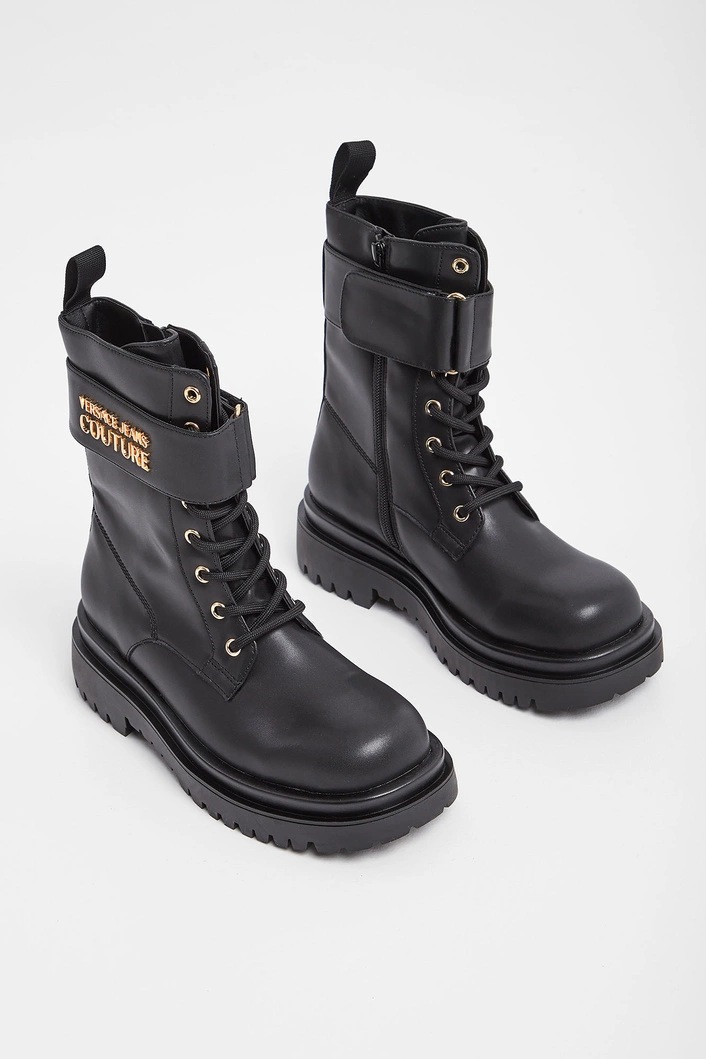 Trapery marki Versace Jeans Couture w czarnym kolorze. Wiązane za pomocą sznurówek i zapinane za pomocą zamka po boku. Na przodzie ozdobny pas zapinany na rzep, ozdobiony metalowa aplikacja w postaci logo marki w złotym kolorze. Gruba, sygnowana podeszwa. Wszystkie elementy ozdobne w złotym kolorze. Buty wykonane ze skóry ekologicznej.