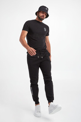 Bucket hat marki Karl Lagerfeld w czarnym kolorze. Wewnątrz zielono-czarny wzór. Na froncie biały, kontrastujący wzór z logo marki. Na rondzie przeszycia.