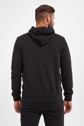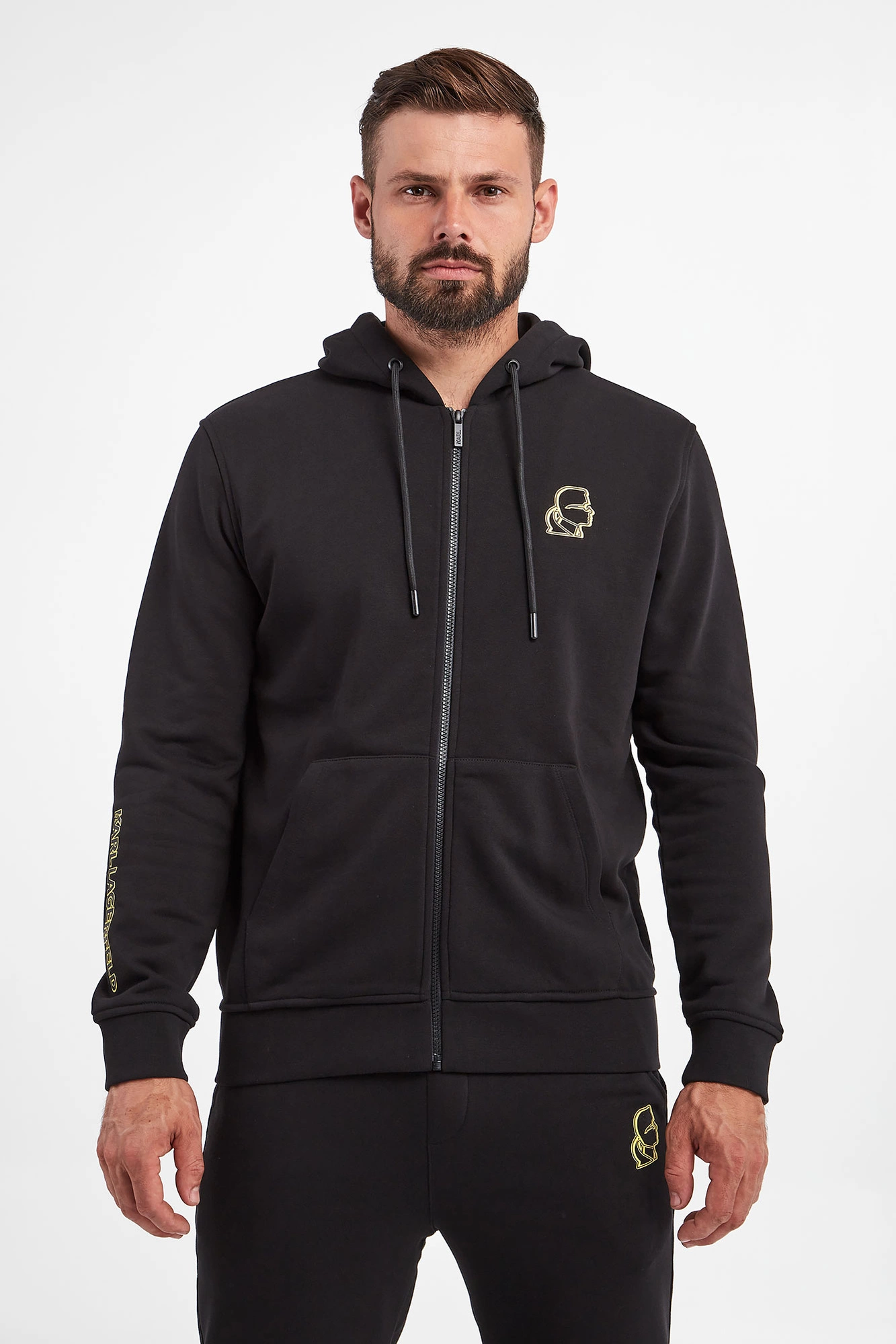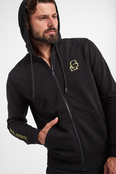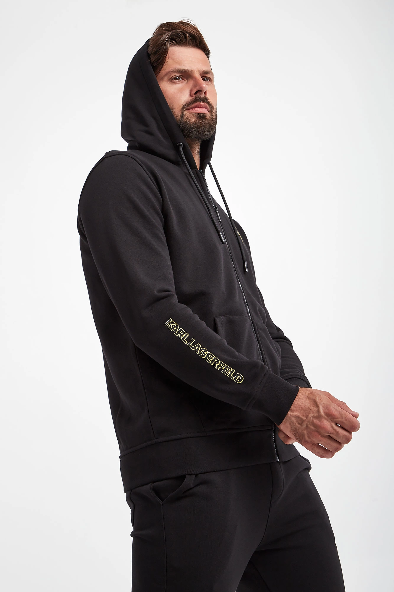 Bluza marki Karl Lagerfeld w kolorze czarnym. Model z linii "Karl Cares", która wspiera zrównoważoną modę. Fason typu regular. Na piersi gumowany nadruk z wizerunkiem założyciela marki. Na rękawie nadruk w postaci nazwy marki. Nadruki w kontrastowym, żółtym kolorze. Bluza z kapturem, zapinana na sygnowany zamek. Długie rękawy i dół zakończone szerokim ściągaczem. Model z dwoma kieszeniami. Wykonana z bawełny z domieszką poliestru.