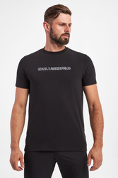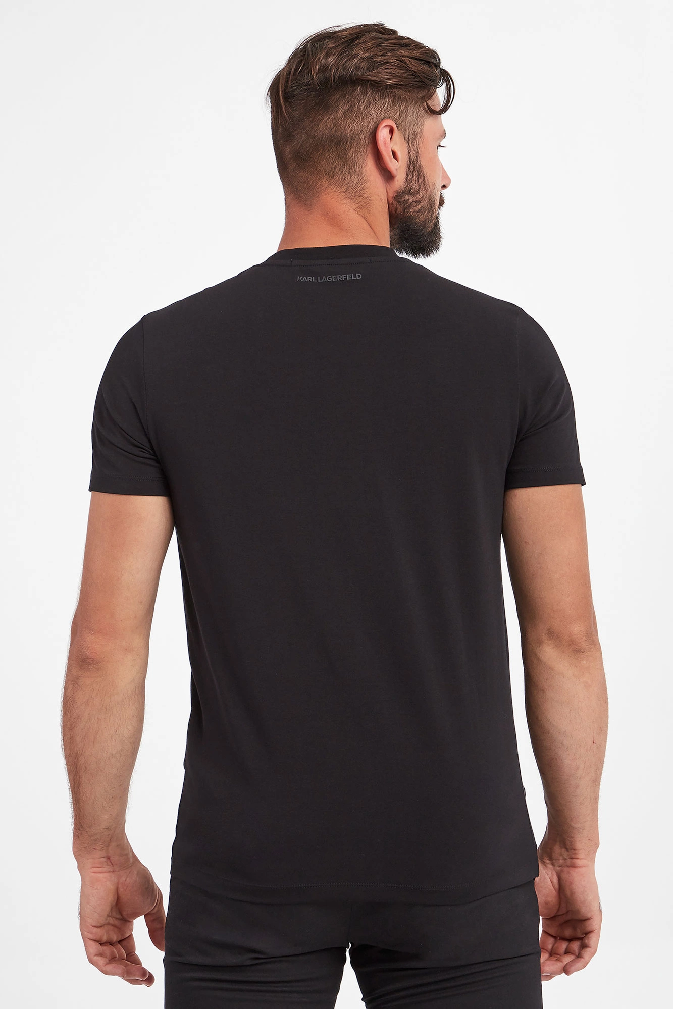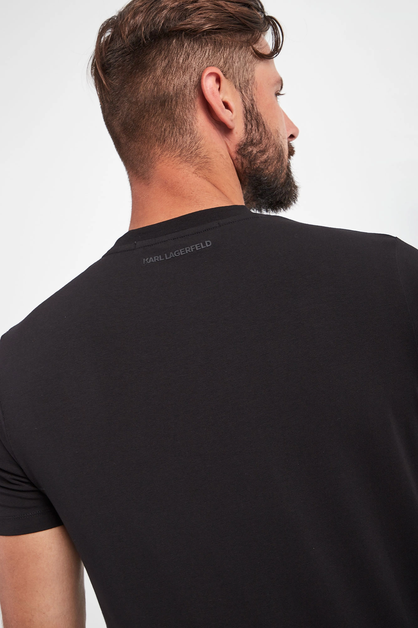 T-shirt marki Karl Lagerfeld w czarnym kolorze. Model z linii "Karl Cares", która wspiera zrównoważoną modę. Fason slim fit. Z przodu biało-czarny, gumowany nadruk z nazwą marki. Dekolt wykończony gładkim ściągaczem. Krótkie rękawki i dół wykończone lamówką. Na linii karku nadruk z logo. Wykonany z tkaniny bawełnianej z domieszką elastanu.