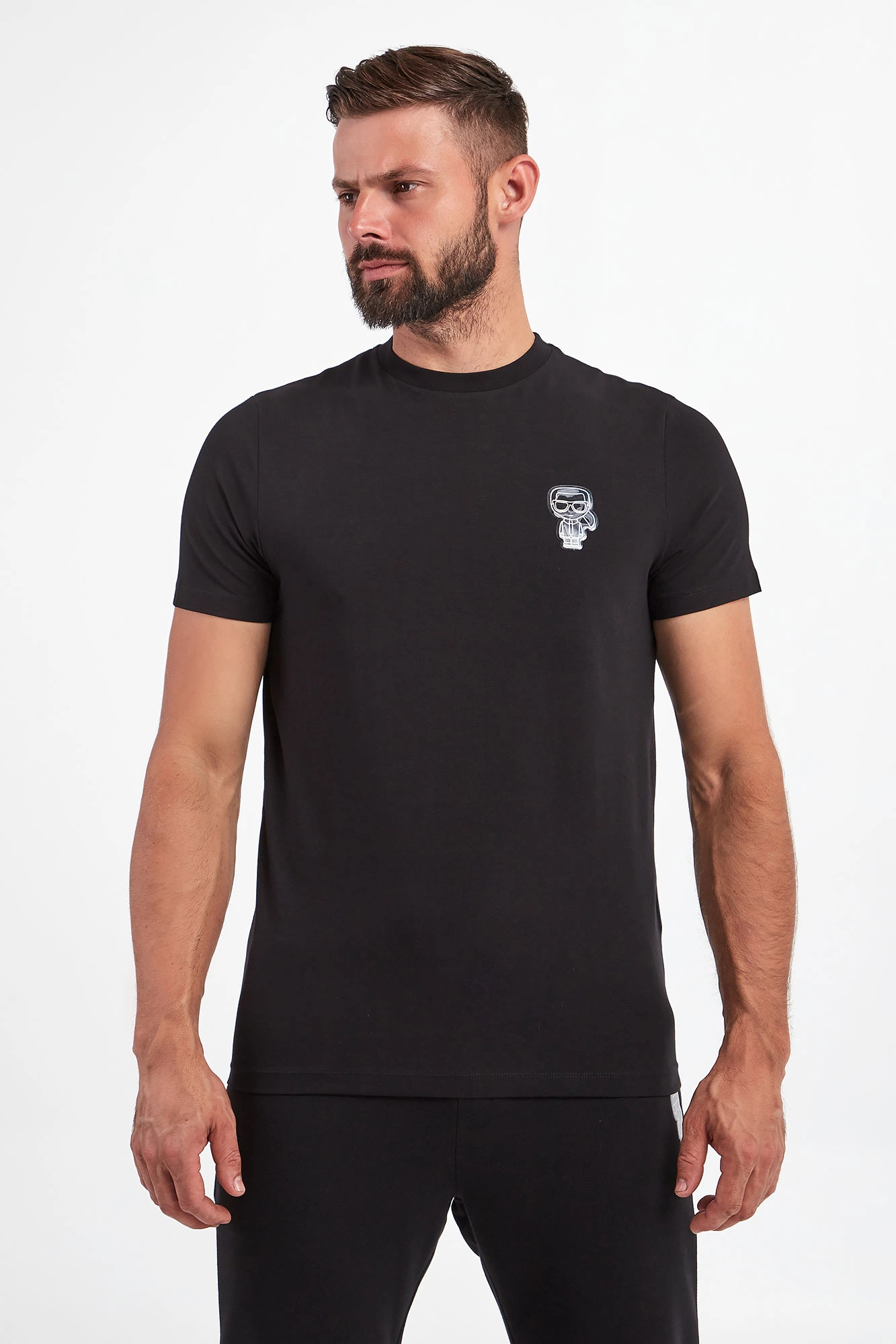 T-shirt marki Karl Lagerfeld w czarnym kolorze. Model z linii "Karl Cares", która wspiera zrównoważoną modę. Fason slim fit. Z przodu przeźroczysta, lekko mieniąca się w kolorze hologramowym gumowa aplikacja z wizerunkiem założyciela marki. Z tyłu na linii karku przeźroczysty, lekko mieniący się w kolorze hologramowym, gumowy napis w postaci nazwy marki. Dekolt wykończony gładkim ściągaczem. Krótkie rękawki i dół wykończone lamówką. Wykonany z tkaniny bawełnianej z domieszką elastanu.