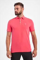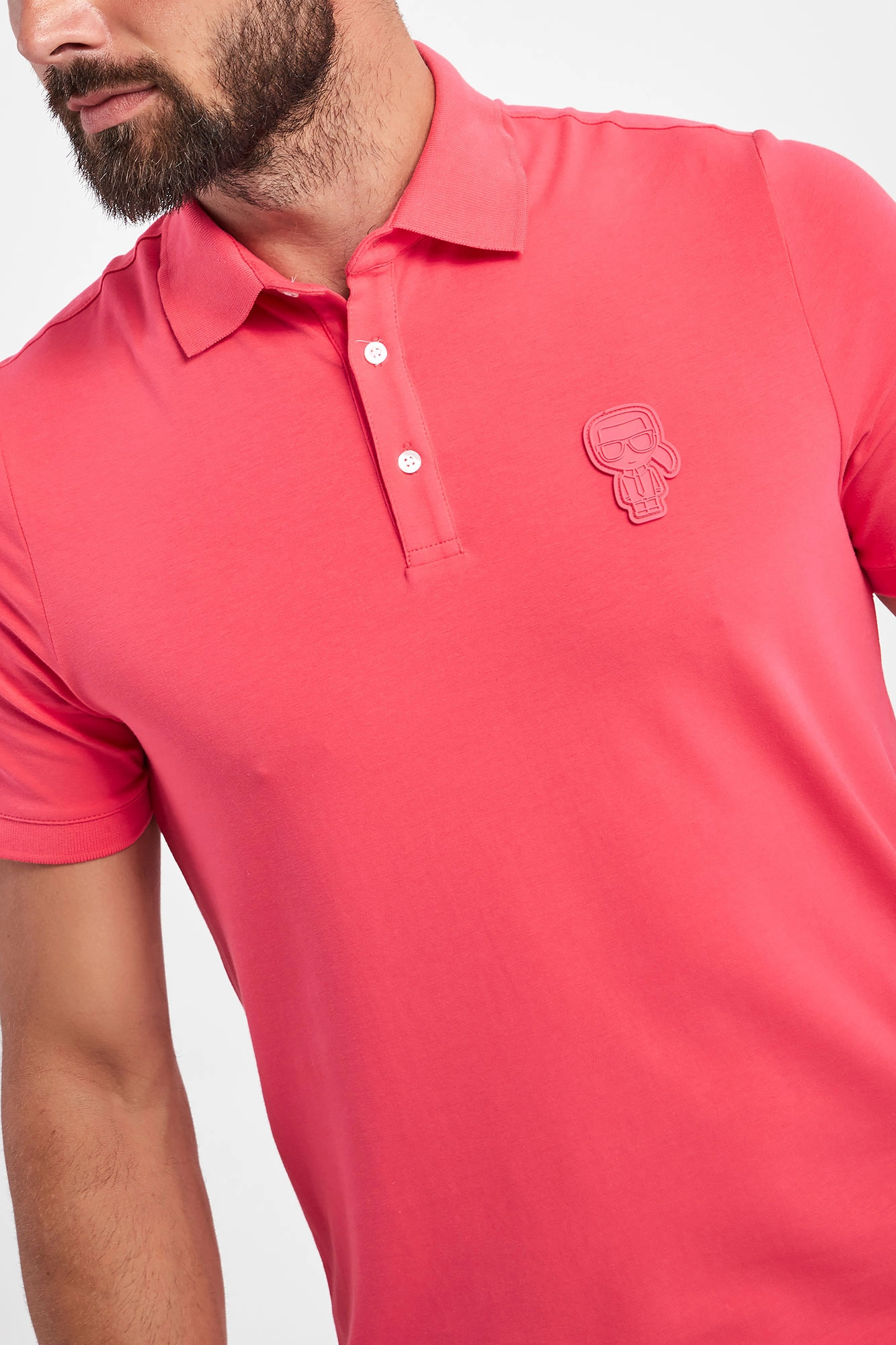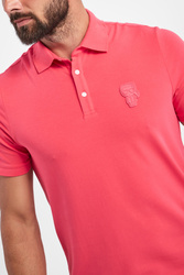 Polo marki Karl Lagerfeld w różowym kolorze, pochodzące z linii "Karl Cares", która wspiera zrównoważoną modę. Fason slim fit. Z boku naszywka z wizerunkiem założyciela oraz byłego dyrektora kreatywnego marki. Klasyczny kołnierzyk zapinany za pomocą sygnowanych guzików. Krótkie rękawy zakończone ściągaczami. Dół wykończony lamówką. Wykonane z bawełnianej tkaniny z domieszką elastanu.