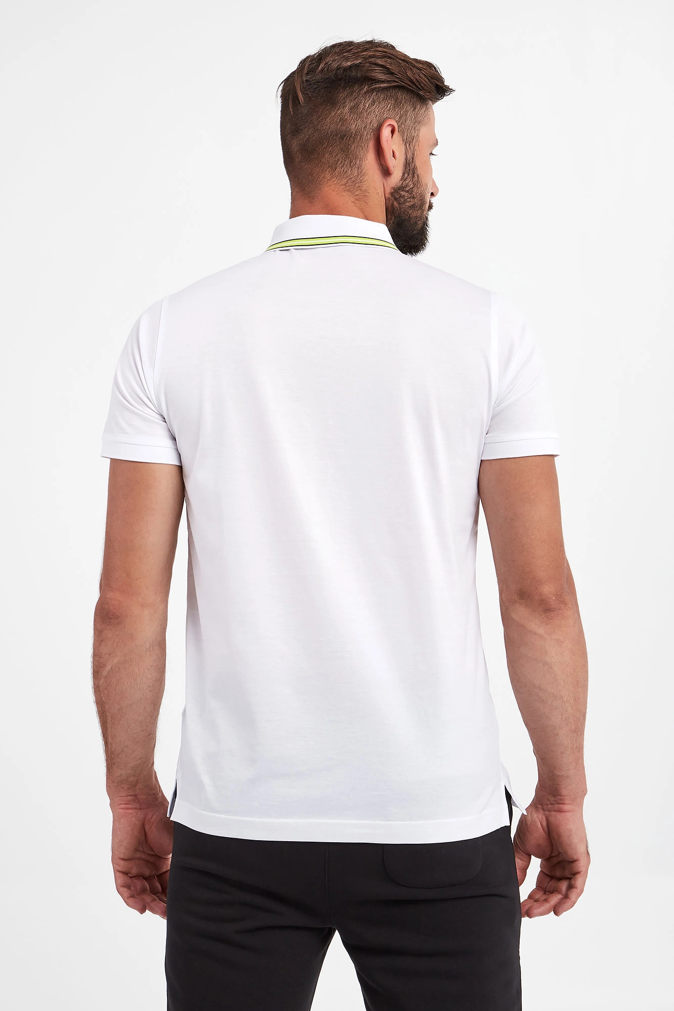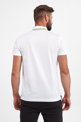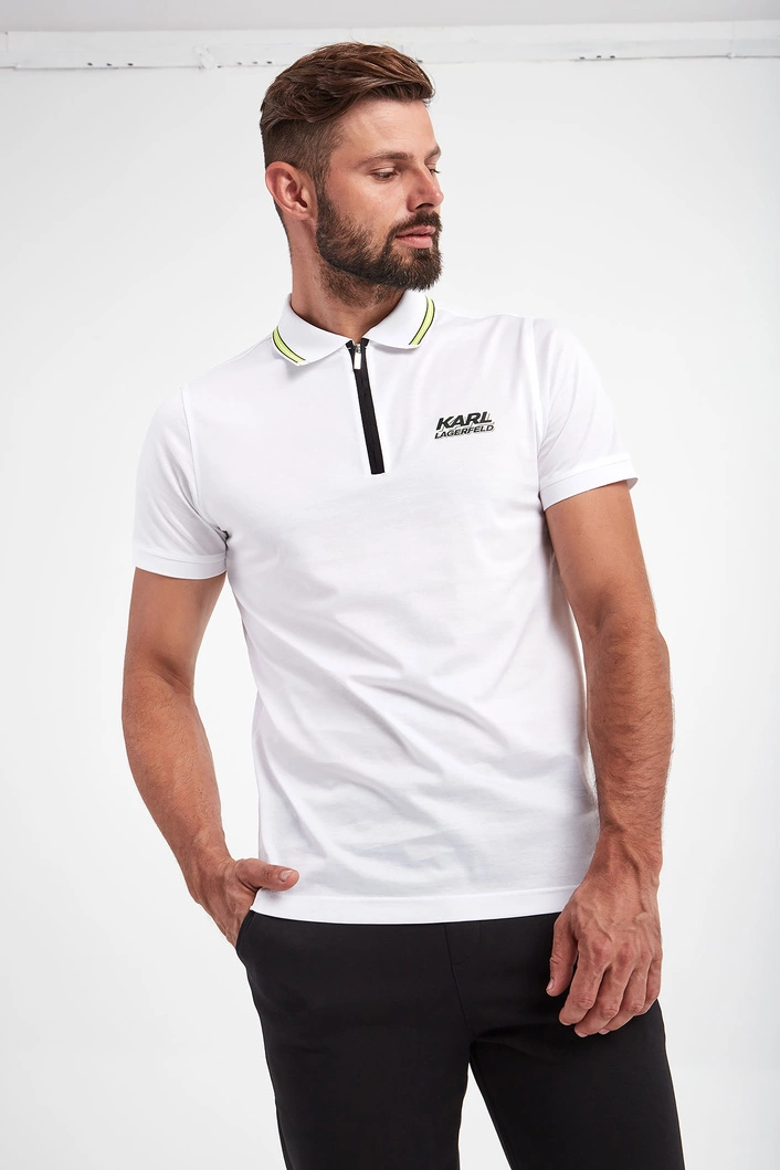 Polo marki Karl Lagerfeld w białym kolorze. Fason slim fit. Z boku gumowane logo z neonowymi wstawkami. Klasyczny kołnierzyk zapinany za pomocą zamka z sygnowaną zawieszką i wykończony żółtą lamówką. Krótkie rękawy zakończone ściągaczami. Dół wykończony lamówką. Po bokach rozcięcia. Wykonane ze stuprocentowej bawełny.