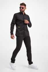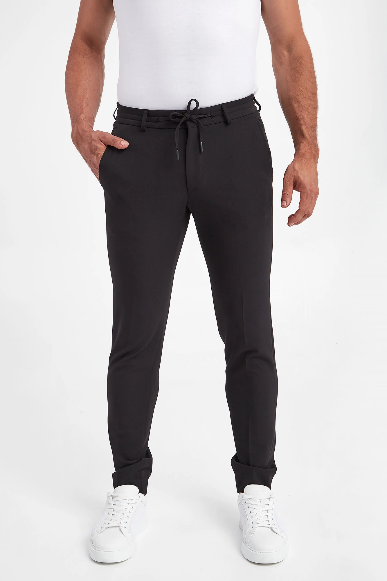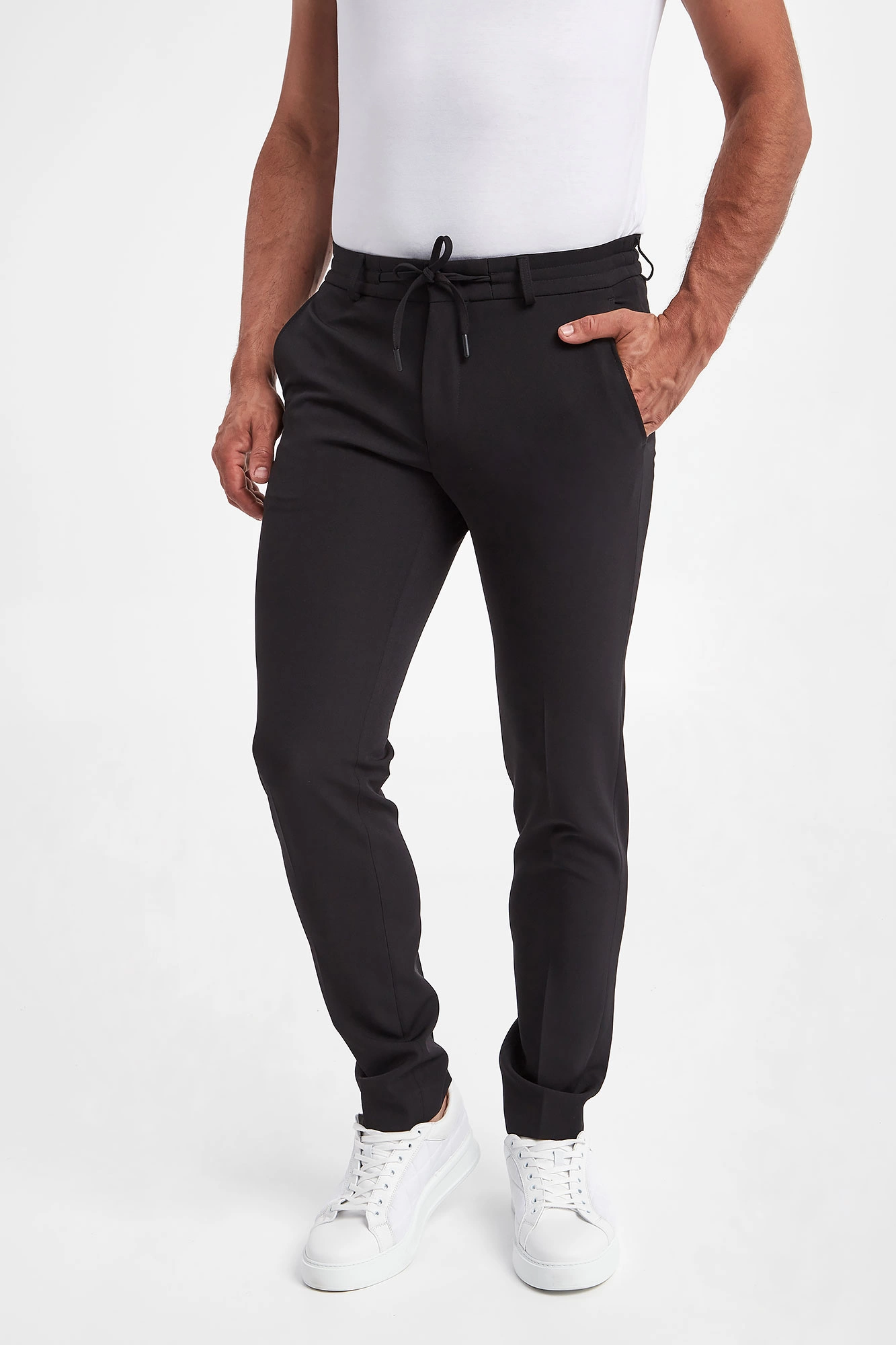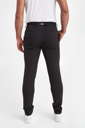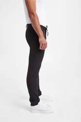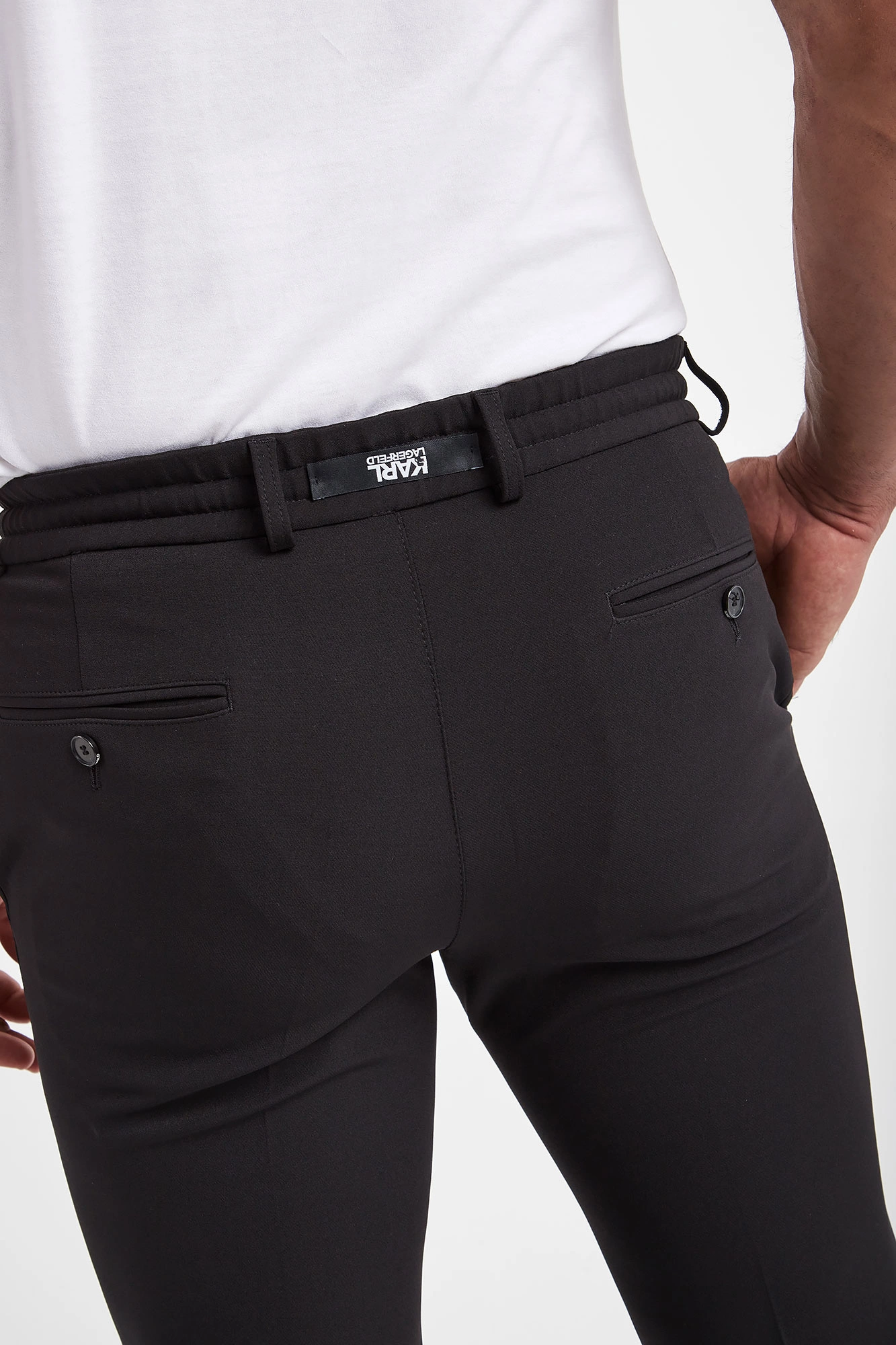 Spodnie marki Karl Lagerfeld w czarnym kolorze. Fason typu slim. W talii elastyczny ściągacz regulowany za pomocą troczków. Zapinane za pomocą zamka błyskawicznego i haftki. Nogawki w kant. Model z czteroma kieszeniami. Z tyłu naszywka z nadrukiem nazwy marki w białym kolorze.