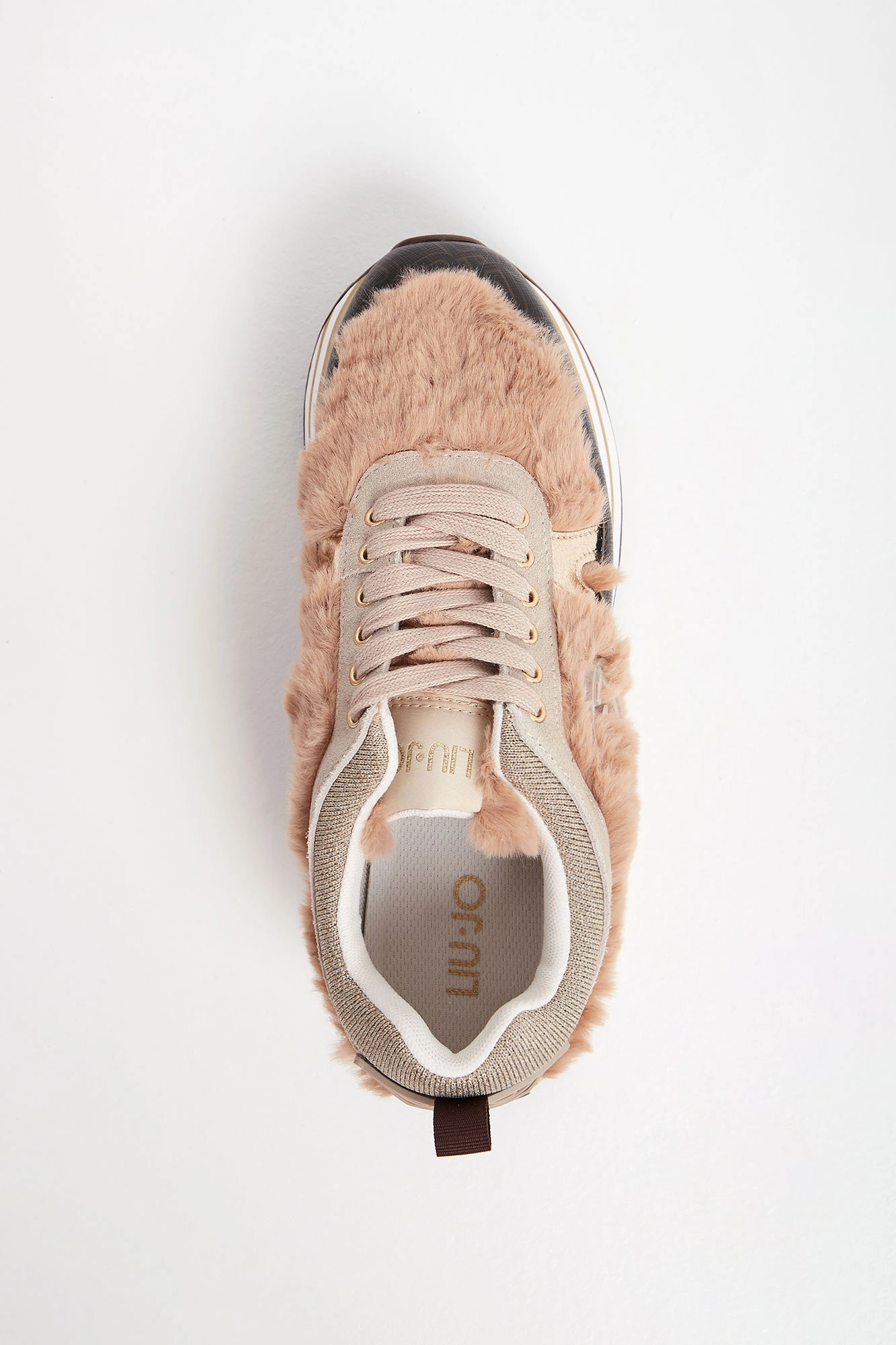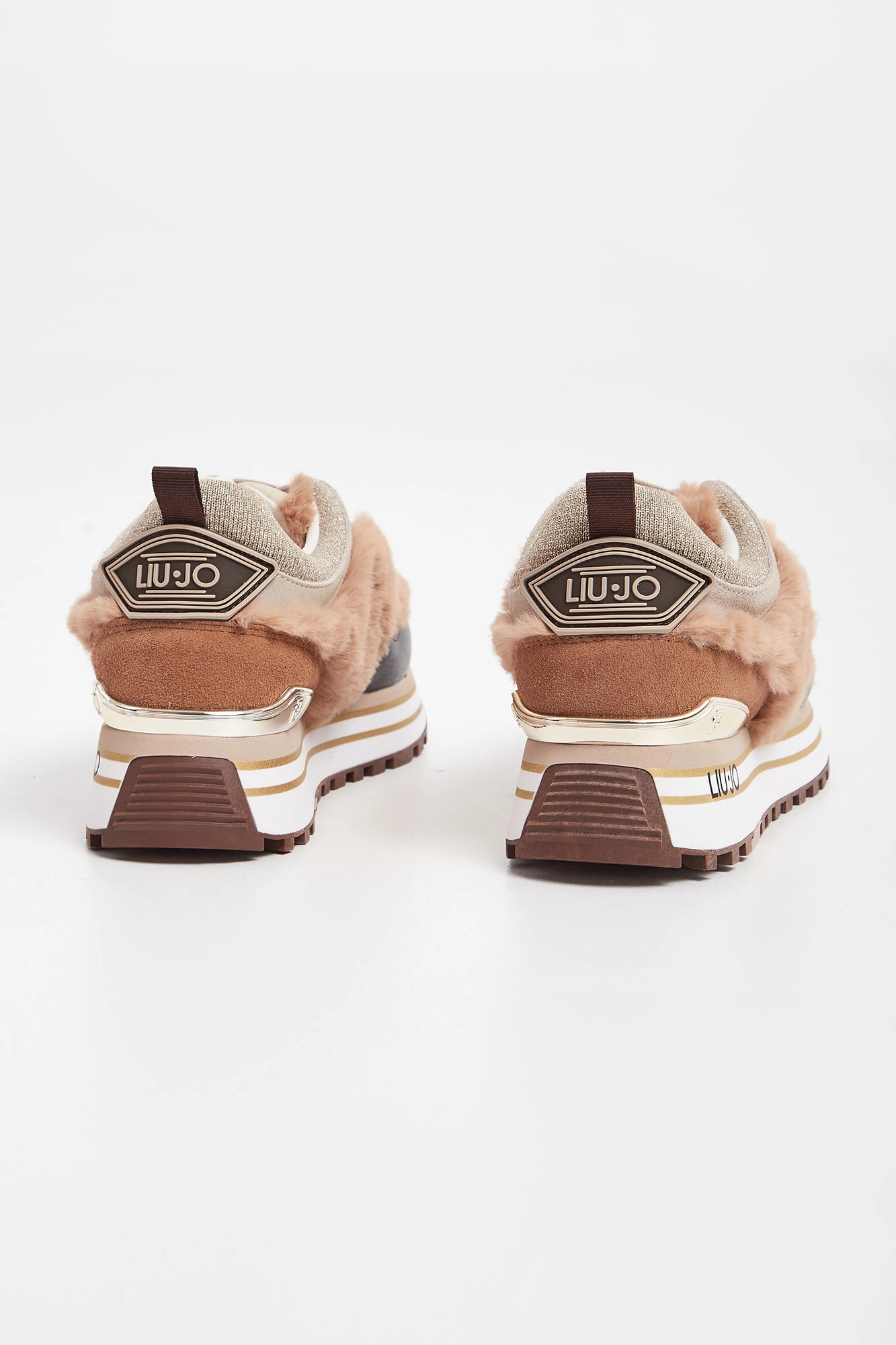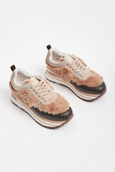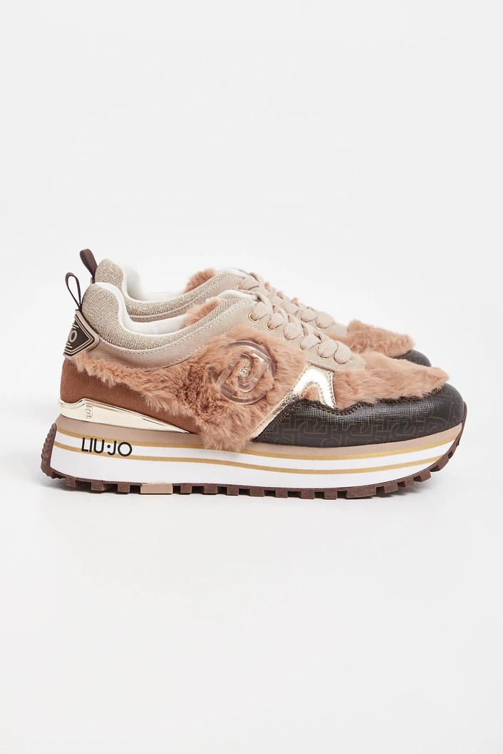 Sneakersy marki Liu Jo w brązowo-beżowym kolorze, Na noskach i po bokach ozdobne futerko. Okrągłe, przezroczyste logo ozdobione kryształkiem. Na noksach wstawka ze wzorem z monogramem. Przy sznurówkach i z przodu zamsz. Za piętami naszywka gumowa z logo i złota, tłoczona aplikacja. Przy cholewce i po bokach złote wstawki. Podeszwa logowana.