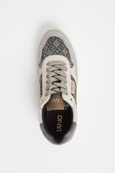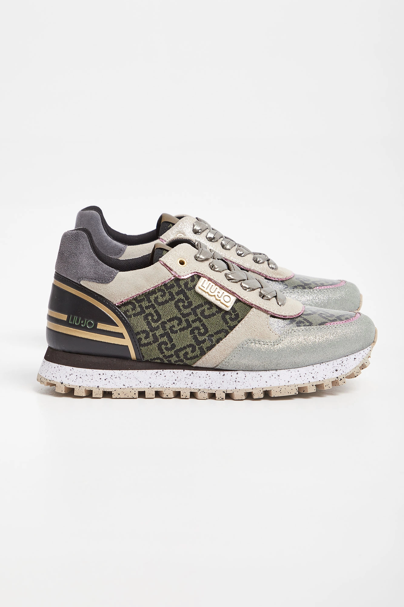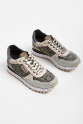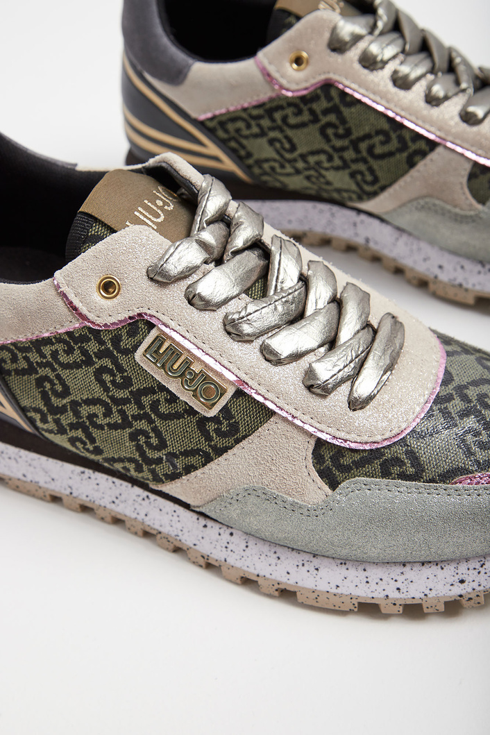 Kolorowe sneakersy marki Liu Jo. Wiązane za pomocą połyskujących sznurówek. Na noskach i po bokach zielone w czarny wzór z monogramem marki. Z przodu zielone, połyskujące. Przy sznurówkach beżowe i różowe wstawki. Za piętami szare. Z tyłu złoto-czarne, logowane wstawki skóry. Z boków złote, metalowe logo. Nakrapiana, czarno-biało-beżowa podeszwa.