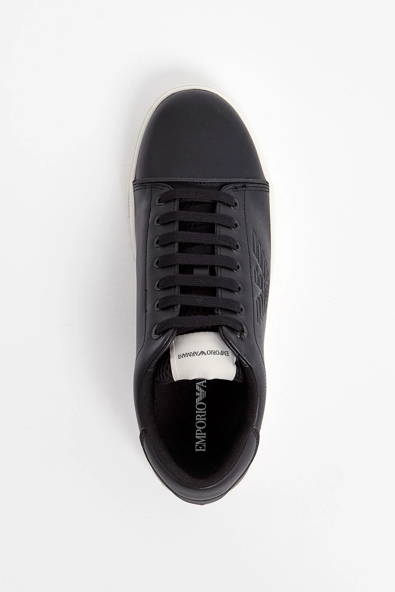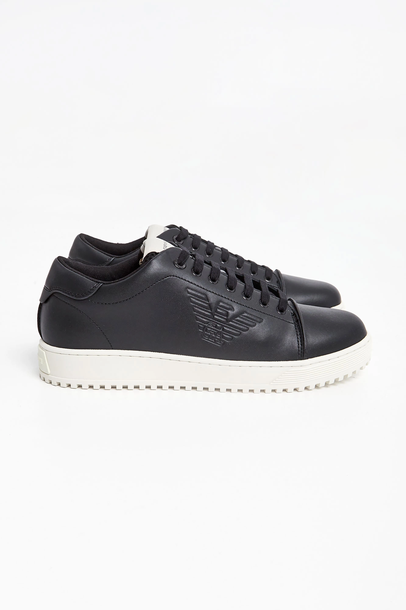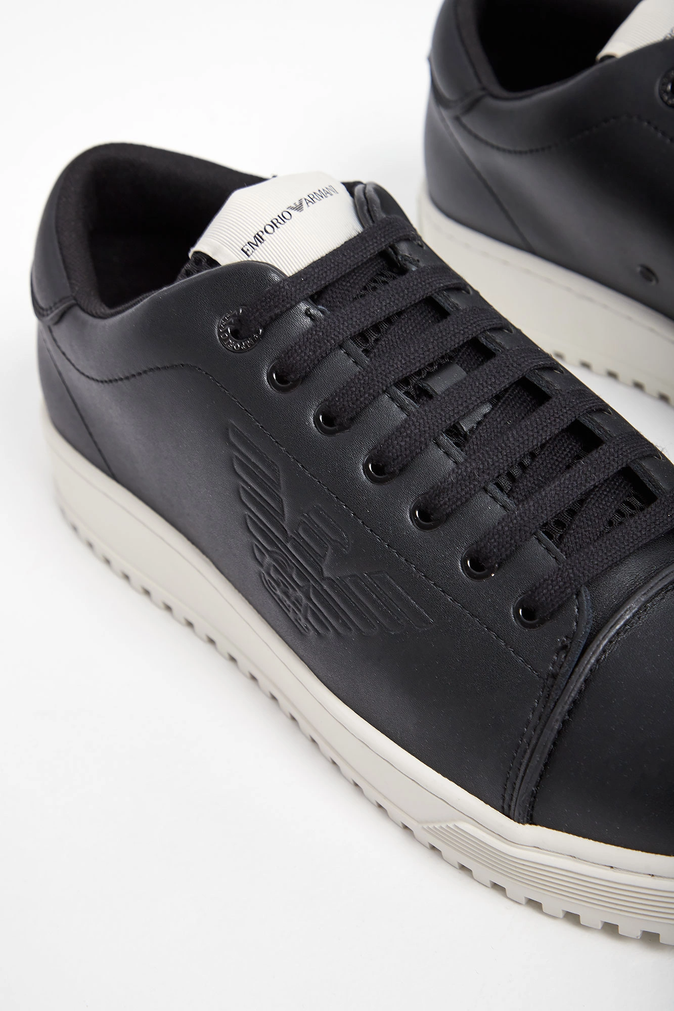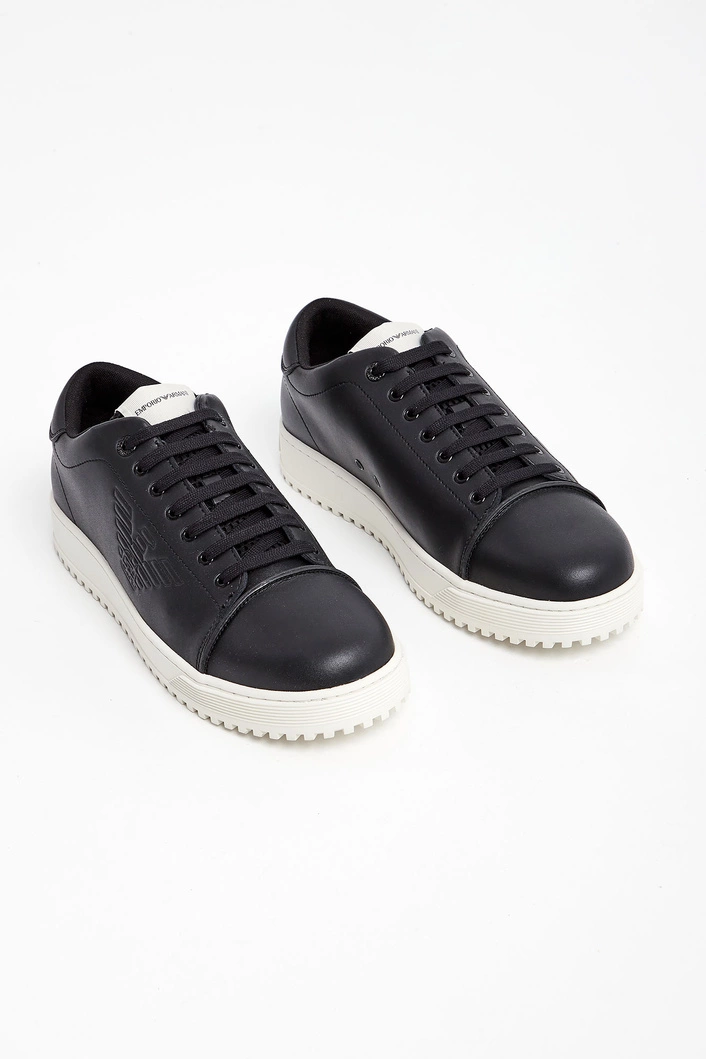 Sneakersy marki Emporio Armani w kolorze czarnym. Na boku tłoczenie w postaci logo marki. Nosek oddzielony widocznie zaznaczonym szwem. Język wykończony siatkowanym materiałem, sygnowany. Wiązane za pomocą czarnych sznurówek. Na grubej podeszwie w kontrastowym kolorze. Wykonane ze skóry naturalnej.