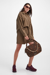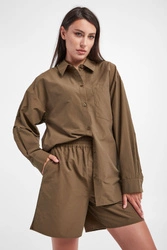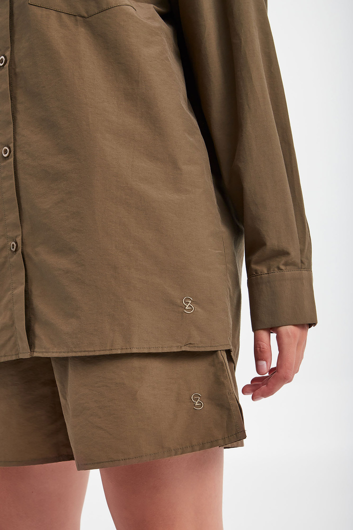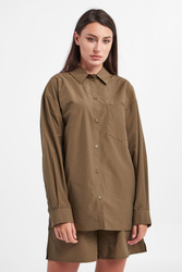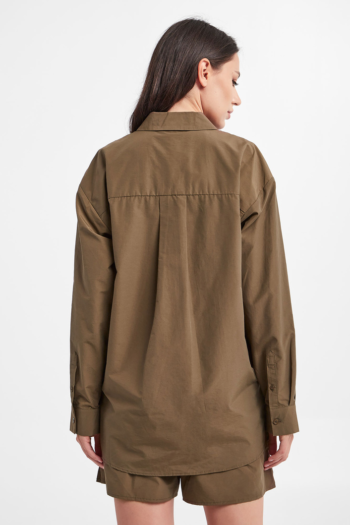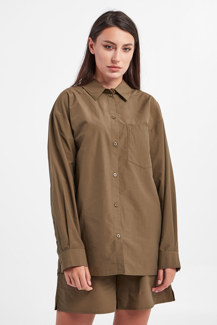 Koszula marki Gestuz w kolorze khaki. O nieco dłuższym fasonie typu relaxed. Zapinana na guziki. Z przodu po lewej stronie kieszeń oraz na dole delikatny haft w postaci logo marki w kolorze khaki. Dekolt wykończony klasycznym kołnierzykiem. Rękawy zakończone mankietem zapinanym na guzik. Przy mankietach zakładki. Z tyłu karczek i zakładka.