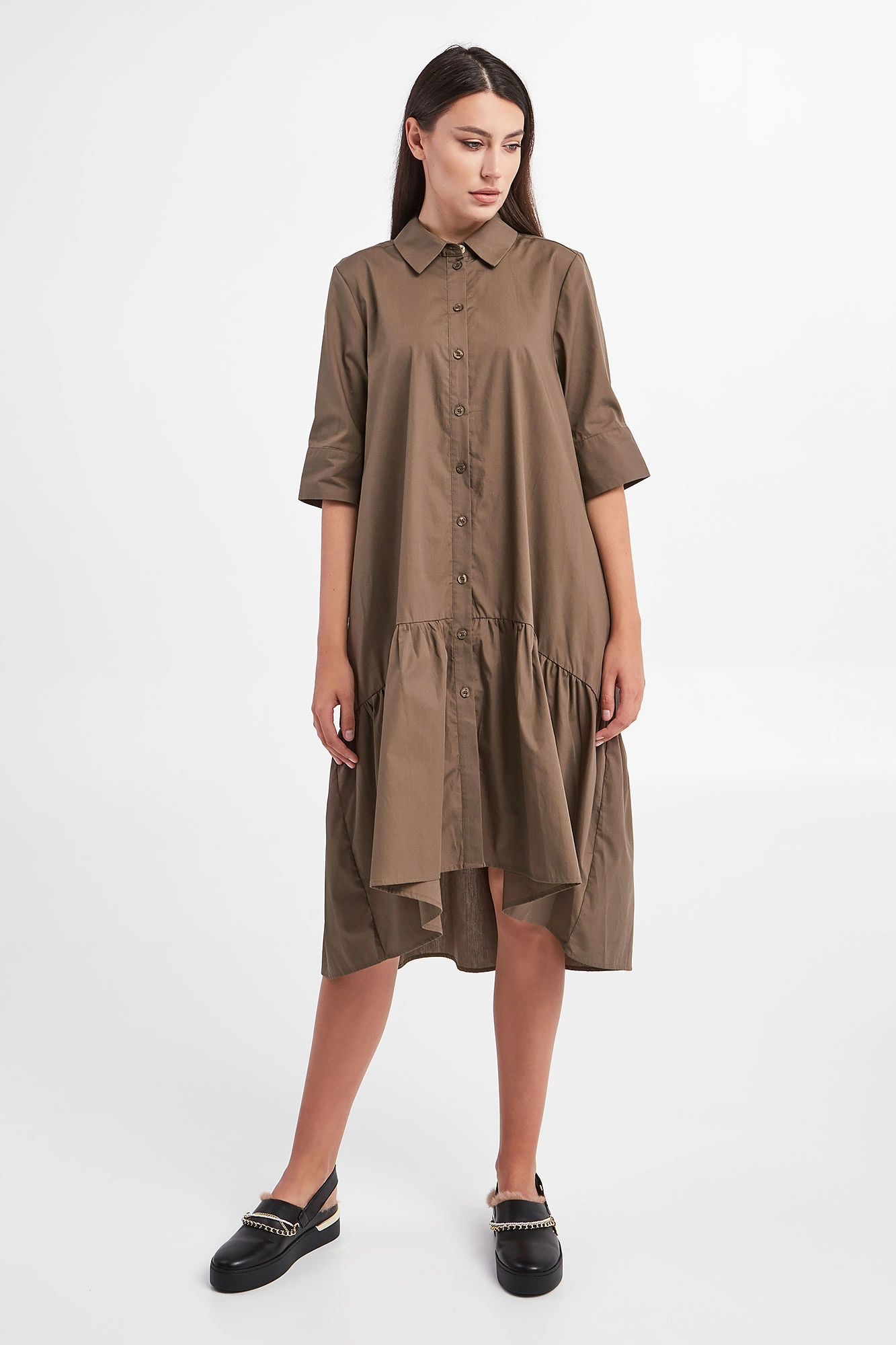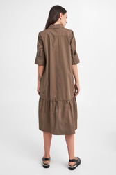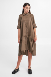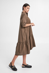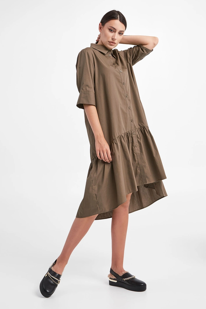 Sukienka marki Gestuz w kolorze khaki. Krótkie rękawki z mankietami zapinanymi na guziki. Przy mankietach zakładki. Dekolt wykończony klasycznym kołnierzykiem. Z przodu zapinana na guziki. Dół wykończony falbaną. Tył nieco dłuższy od przodu. Po bokach kieszenie w szwach. W całości wykonana z tkaniny bawełnianej. Fason typu relaxed, długość midi.