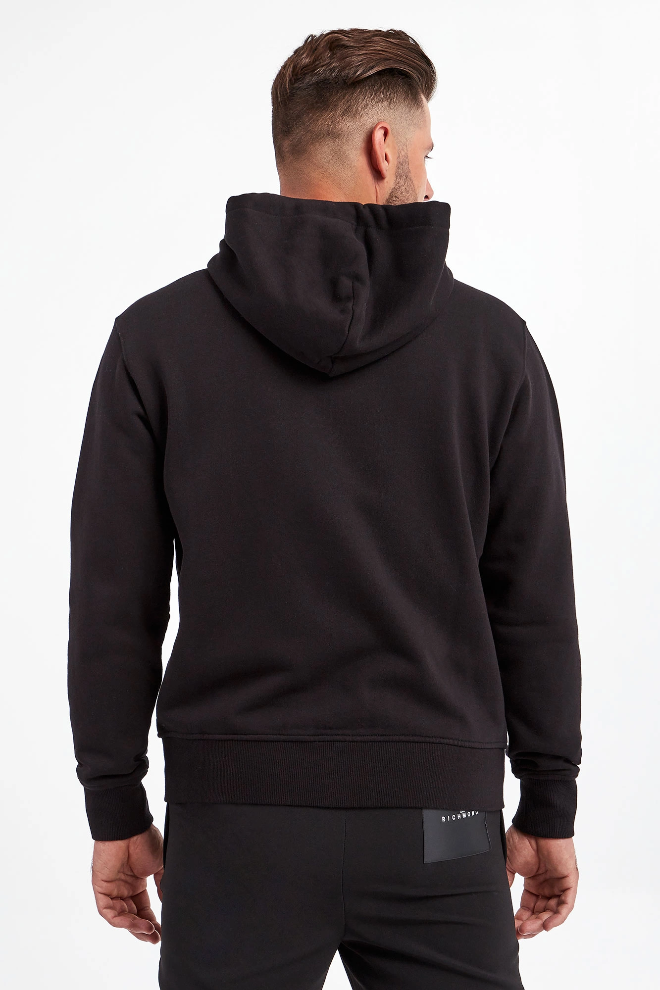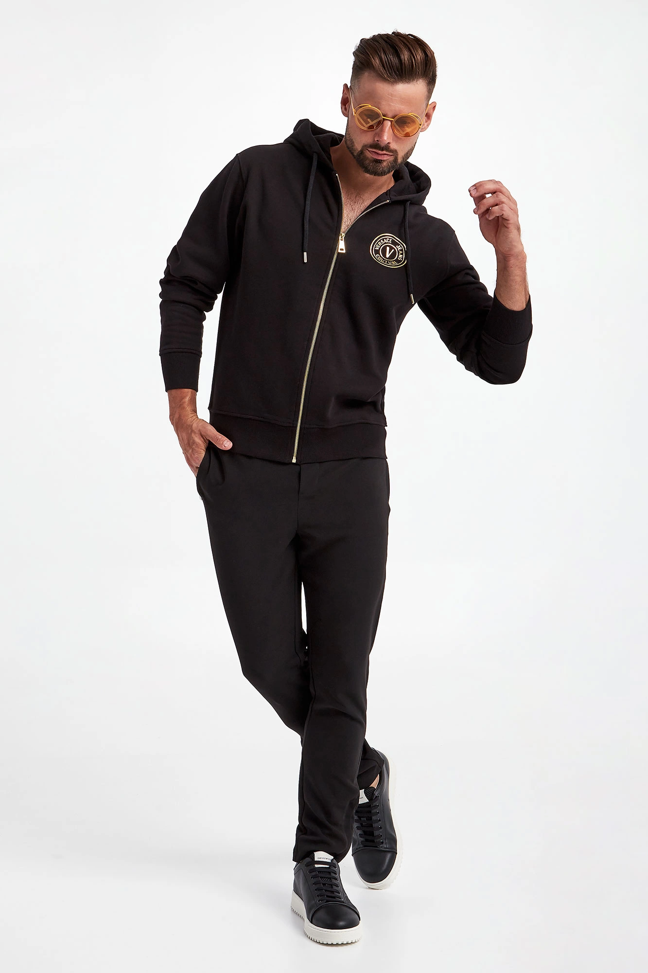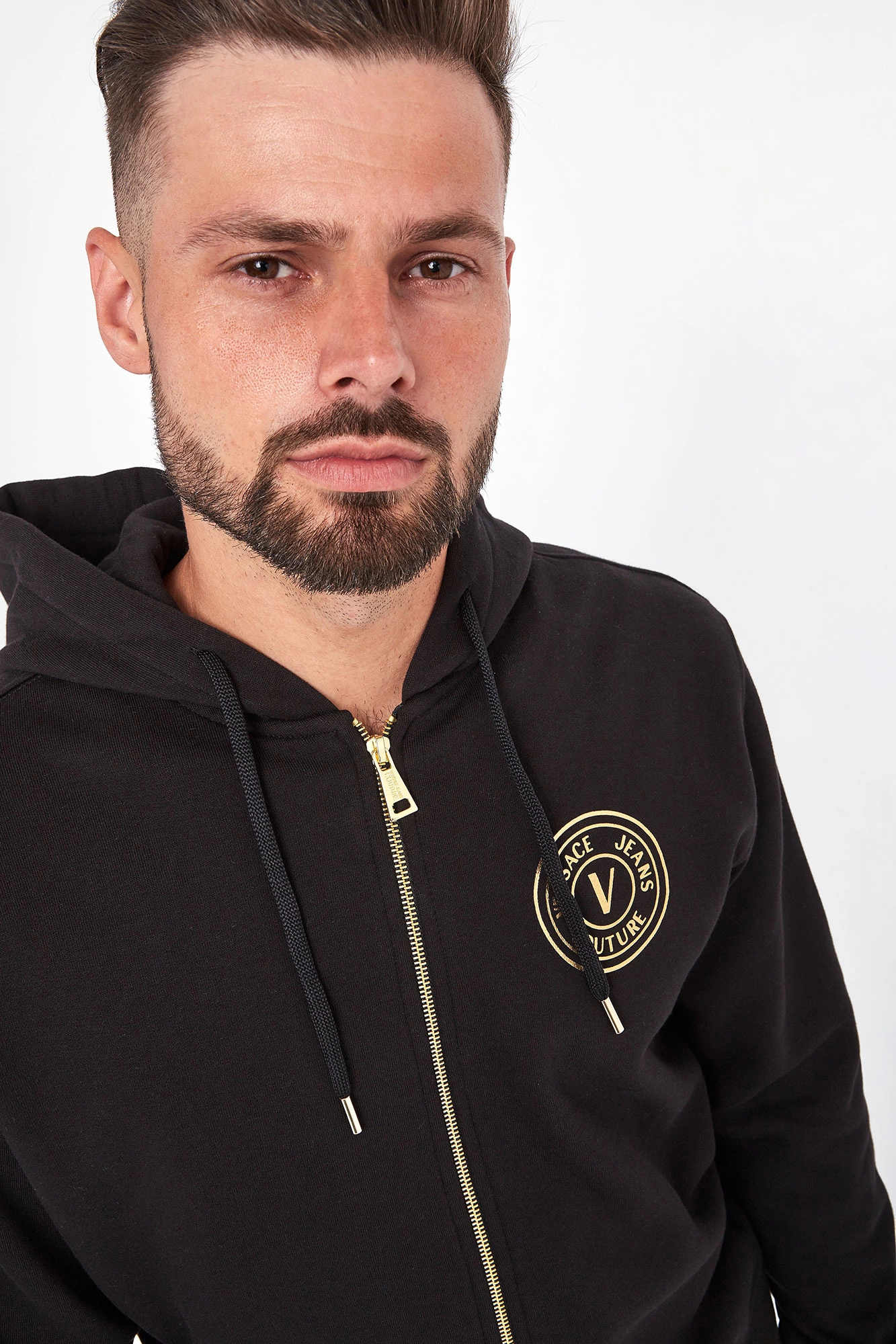 Dzianinowa bluza z kapturem marki Versace Jeans Couture w czarnym kolorze. Zapinana na złoty zamek z logowaną zawieszką. Kaptur regulowany za pomocą troczków. Rękawy i dół wykończone ściągaczem. Z przodu złoty haft w postaci nazwy marki. Fason typu regular fit. Wykonana z niezwykle miękkiej w dotyku bawełny.