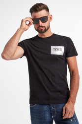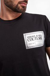 T-shirt marki Versace Jeans Couture w czarnym kolorze. Z przodu na piersi, połyskujący nadruk z nazwą marki w srebrnym kolorze. Dekolt typu o-neck zakończony ściągaczem. Krótkie rękawy i dół wykończone przeszyciem. Fason typu regular fit. Wykonane z czystej bawełny.