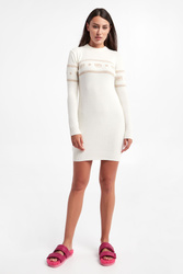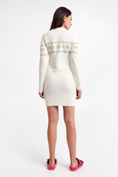 Wełniana sukienka marki Chiara Ferragni w kremowym kolorze. Na części haftowane logo marki w beżowym kolorze, wykończone metalizowaną nicią w złotym kolorze. Długie rękawy, dekolt typu o-neck i dół wykończone elastycznym ściągaczem. Fason typu regular fit o długości mini. Wykonana z elastycznej mieszanki wiskozy, wełny i kaszmiru