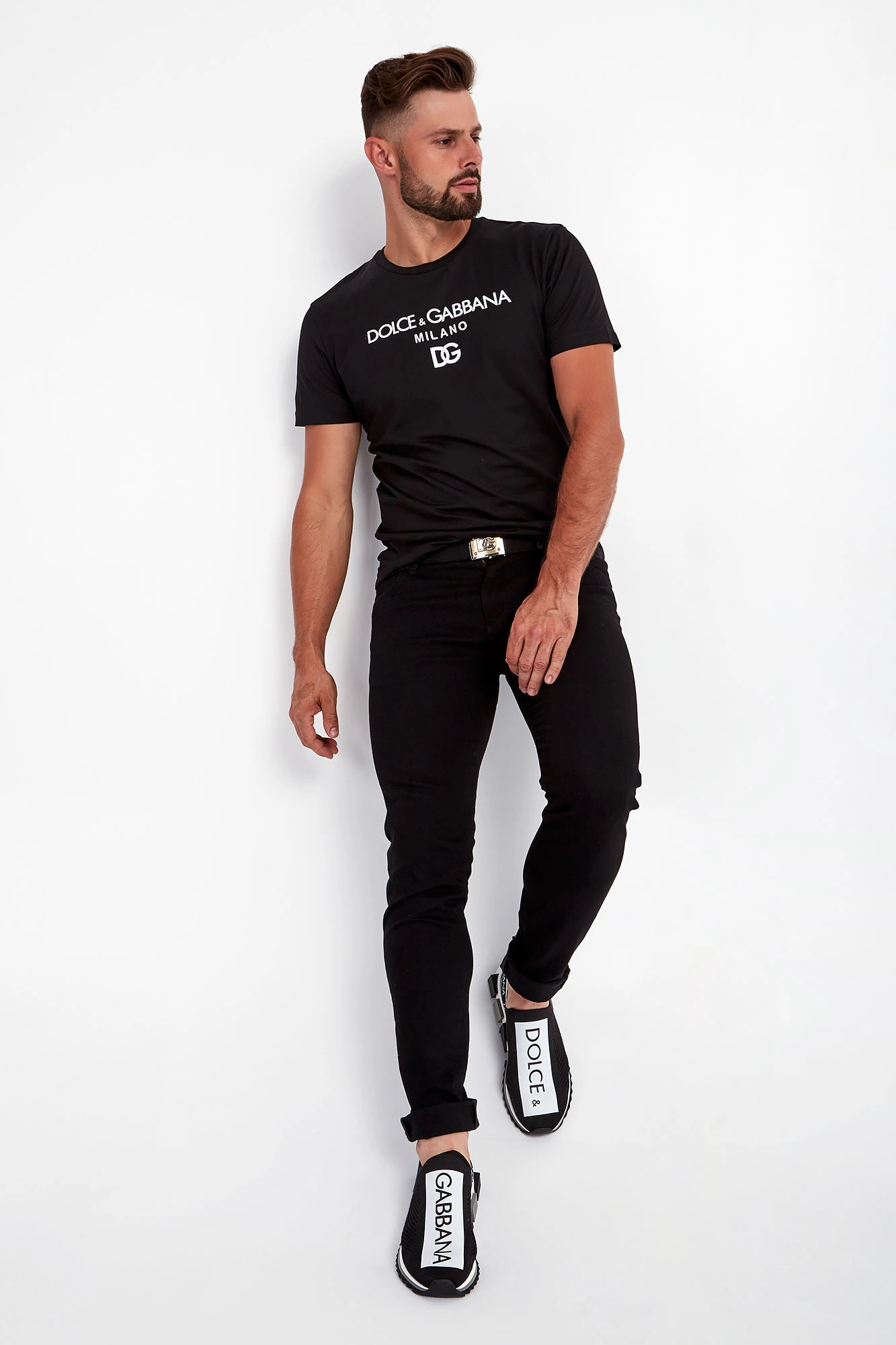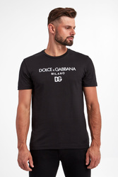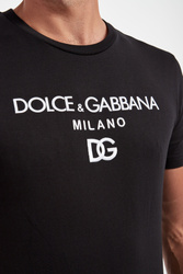 T-shirt marki Dolce & Gabbana w czarnym kolorze. Na froncie biały nadruk z logo. Dekolt typu o-neck zakończony ściągaczem. Krótkie rękawy i dół wykończone lamówką. Fason regular fit. Wykonany z czystej bawełny.