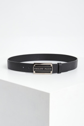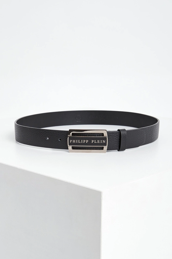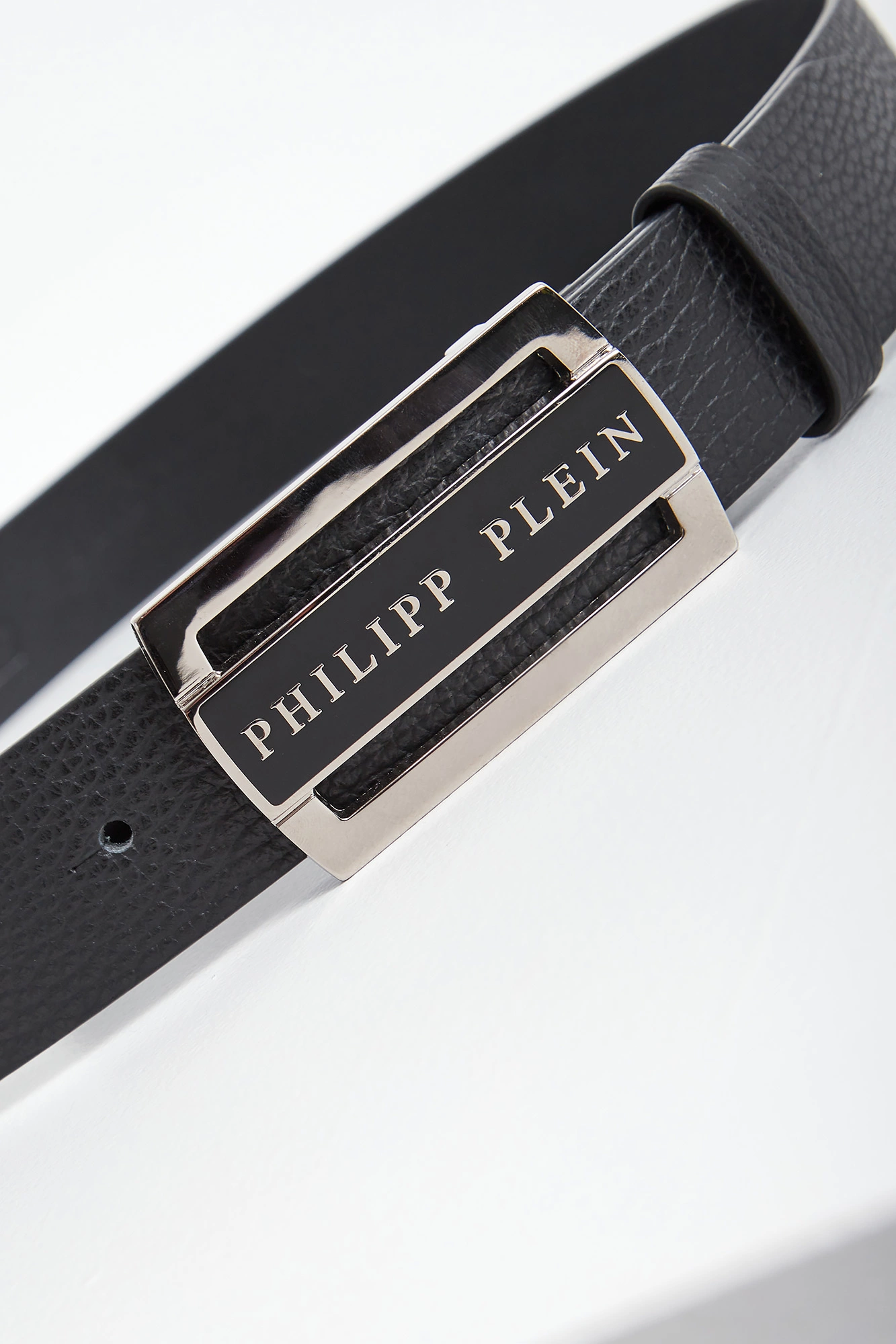 Skórzany pasek w czarnym kolorze marki Philipp Plein. Wykonany z naturalnej, groszkowej skóry cielęcej. Zapinany na dużą metalową klamrę z bolcem i tłoczoną nazwą marki w czarno-srebrnym kolorze.
