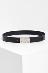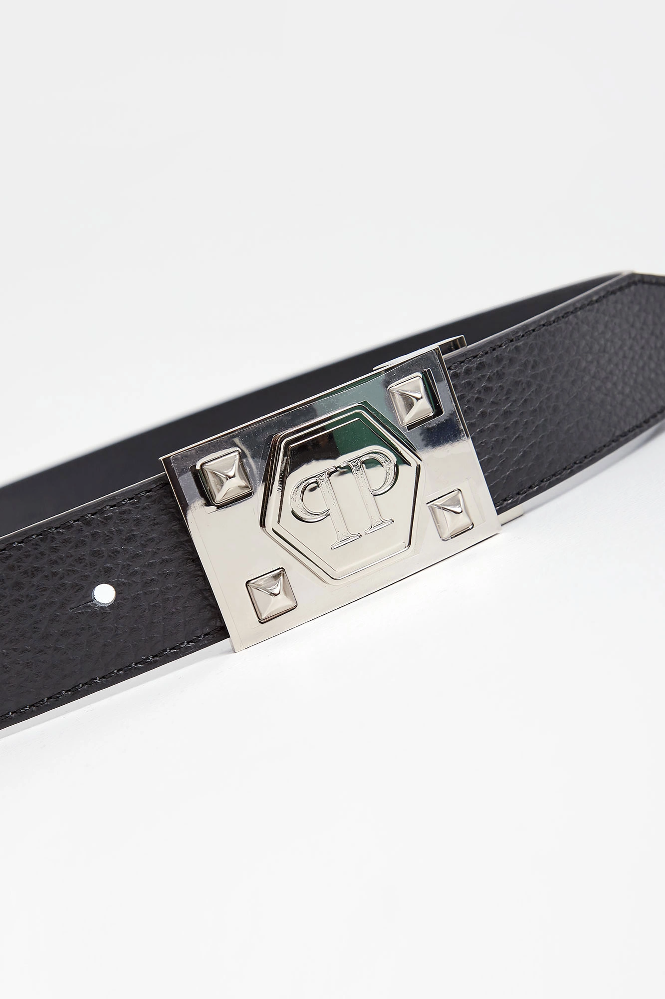 Pasek męski marki Philipp Plein w czarnym kolorze. Na całości tłoczenie. Zapinany na srebrną klamrę z bolcem, ozdobioną logo marki i ćwiekami. Wykonany ze skóry naturalnej.