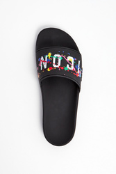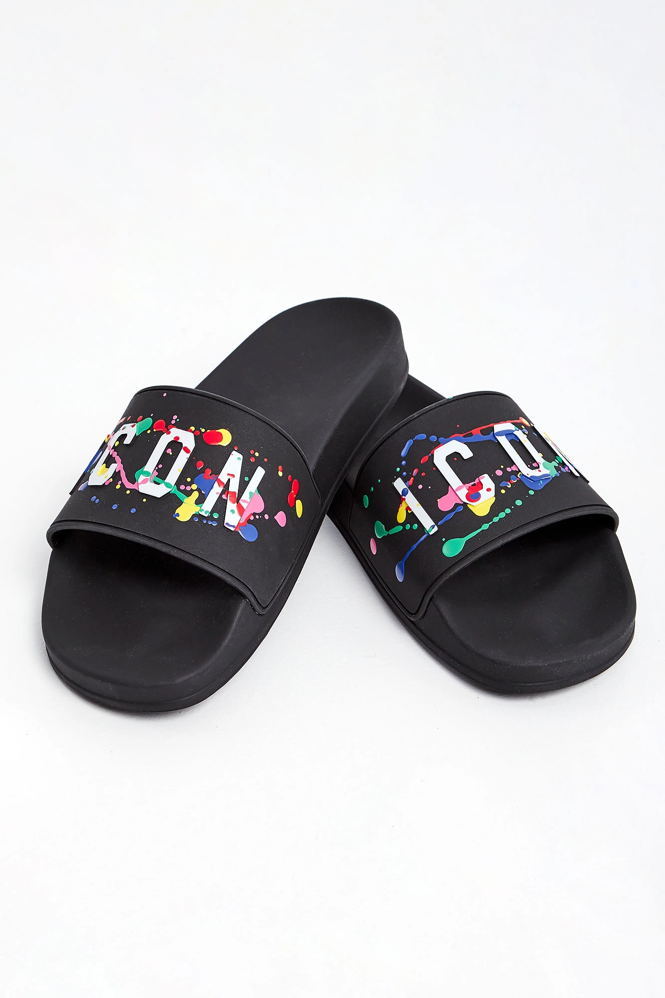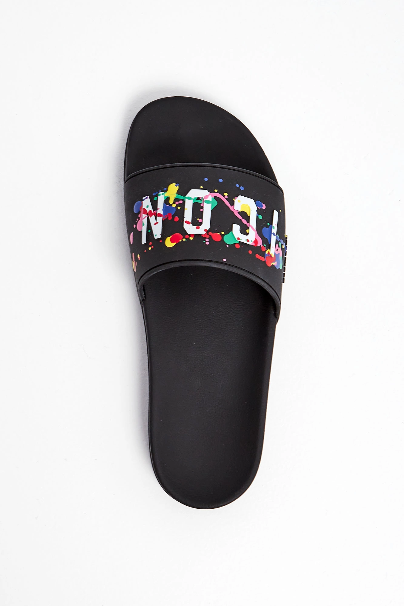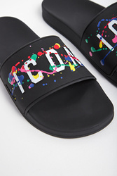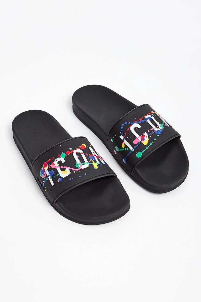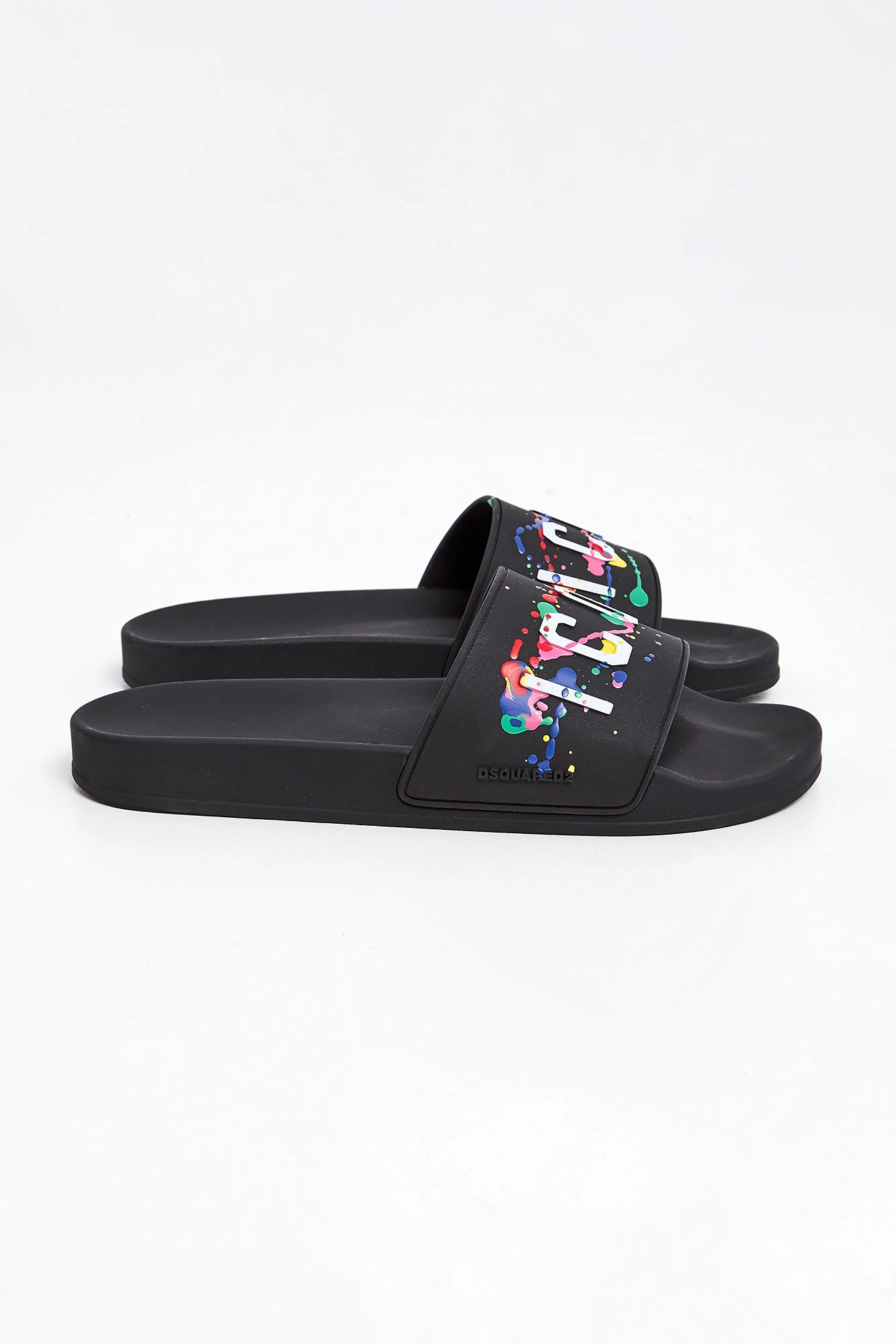 Klapki marki Dsquared2 w czarnym kolorze. Na szerokim pasku białe, tłoczone logo oraz kolorowe plamy farby. Podeszwa tłoczona oraz profilowana.
