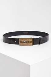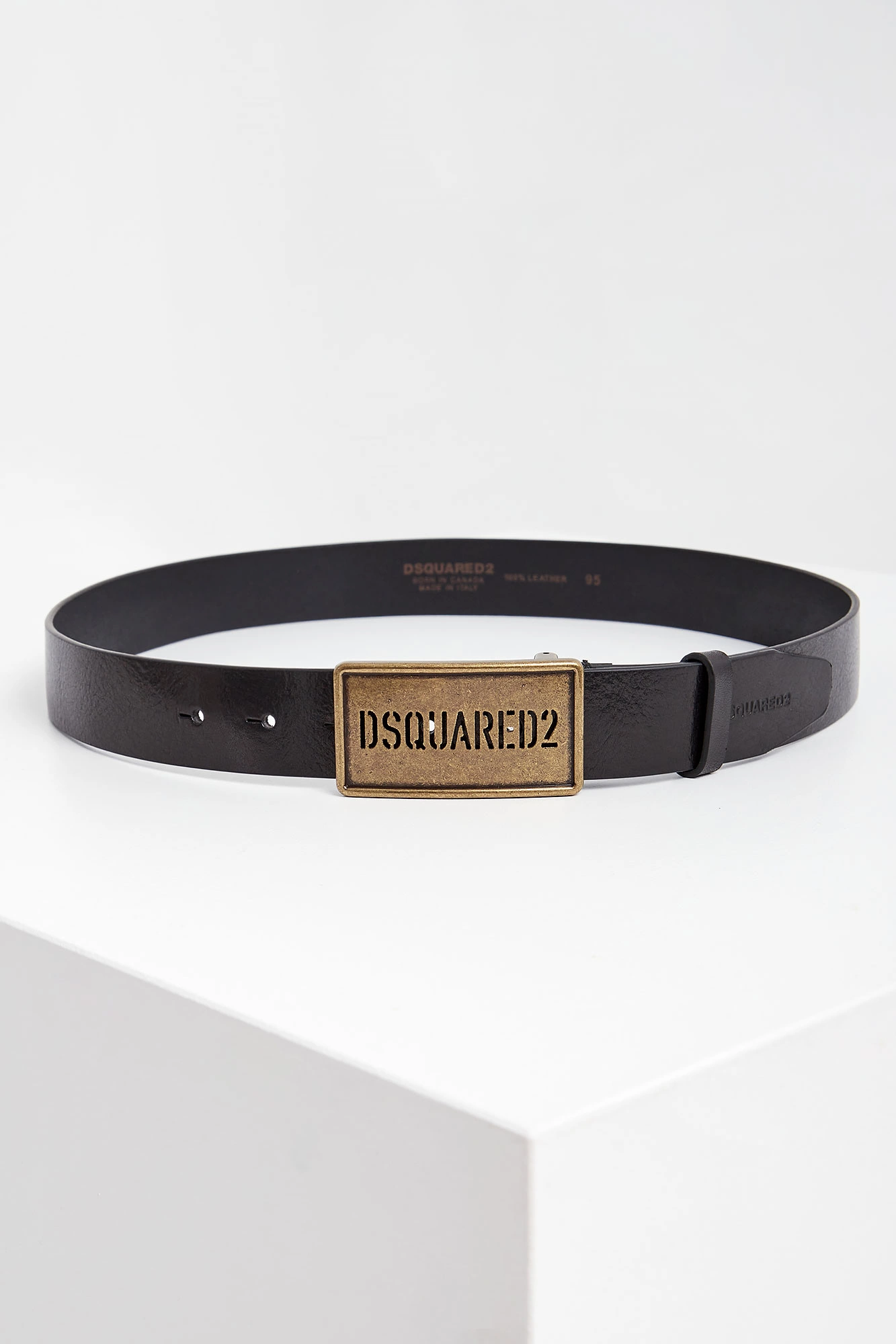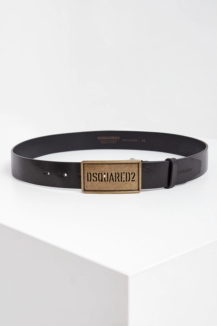 Skórzany pasek marki Dsquared2 w czarnym kolorze. Zapinany za pomocą złotej, mosiężnej klamry z bolcem. Klamra z ażurowym logo.