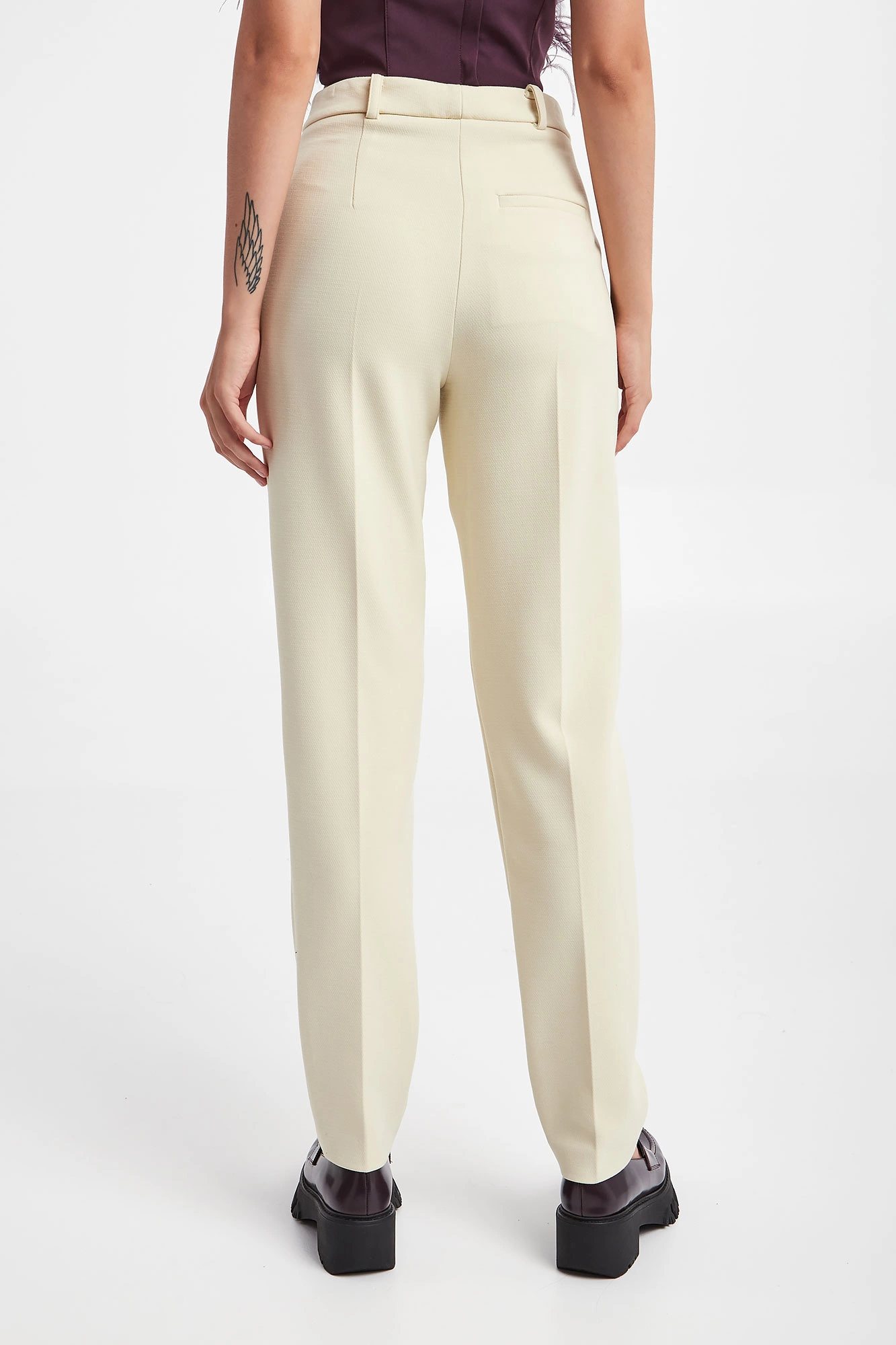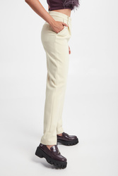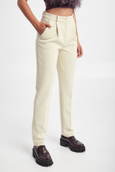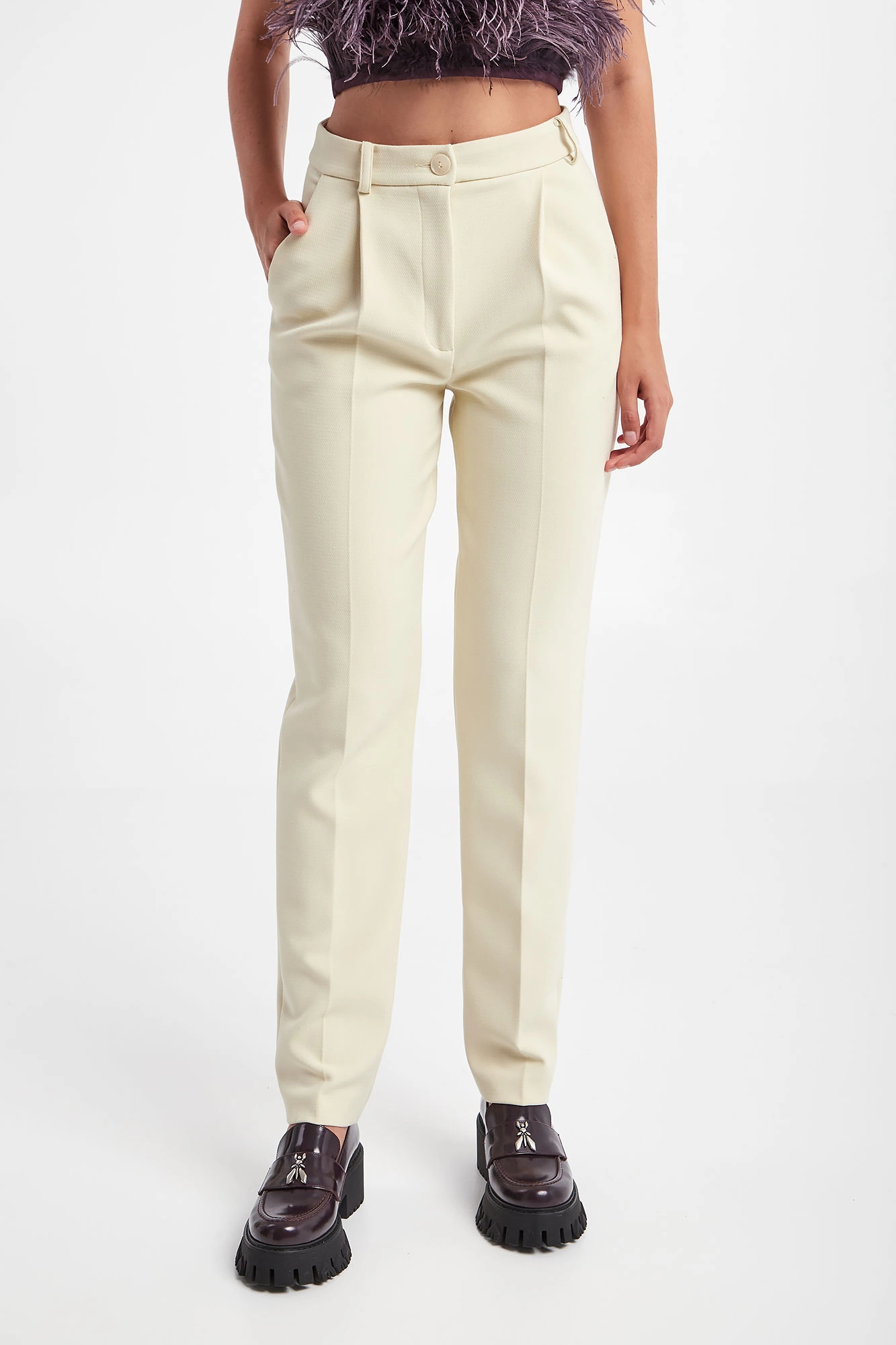 Spodnie marki Patrizia Pepe w kremowym kolorze. Z przodu po lewej i prawej stronie zakładki. W pasie szlufki. Zapinane na zamek ukryty pod patką oraz sygnowany guzik. Model z trzema kieszeniami. Jedna z tyłu i dwie z przodu po bokach. Z przodu i z tyłu zaprasowane kanty. Fason typu regular. Proste nogawki. Wykonane z elastycznego materiału.