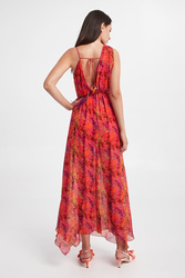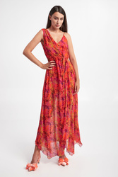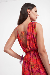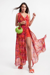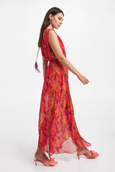 Sukienka marki Patrizia Pepe. Na całości wielokolorowy wzór z nieregularnie rozmieszczonym logo marki. Fason slim o długości maxi. Asymetryczne ramiączka. Dekolt typu v-neck. Rozcięcie na plecach zawiązywane na troczki - jeden zakończony złotym owadem, a drugi fioletowymi piórami. Dół rozkloszowany, od kolana efektowne rozcięcie. W zestawie pomarańczowa podszewka. Sukienka wykonana w 100% z wiskozy.